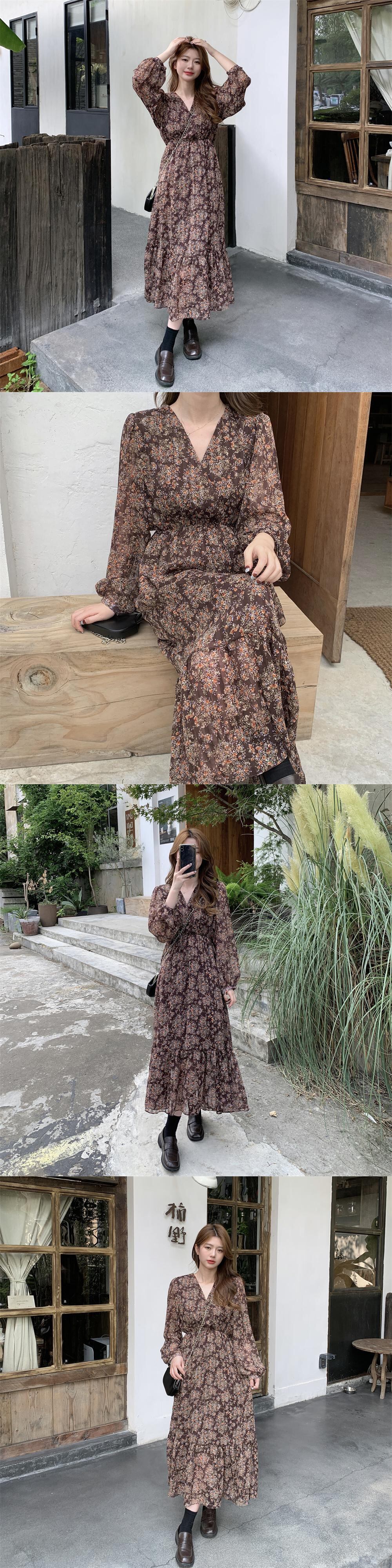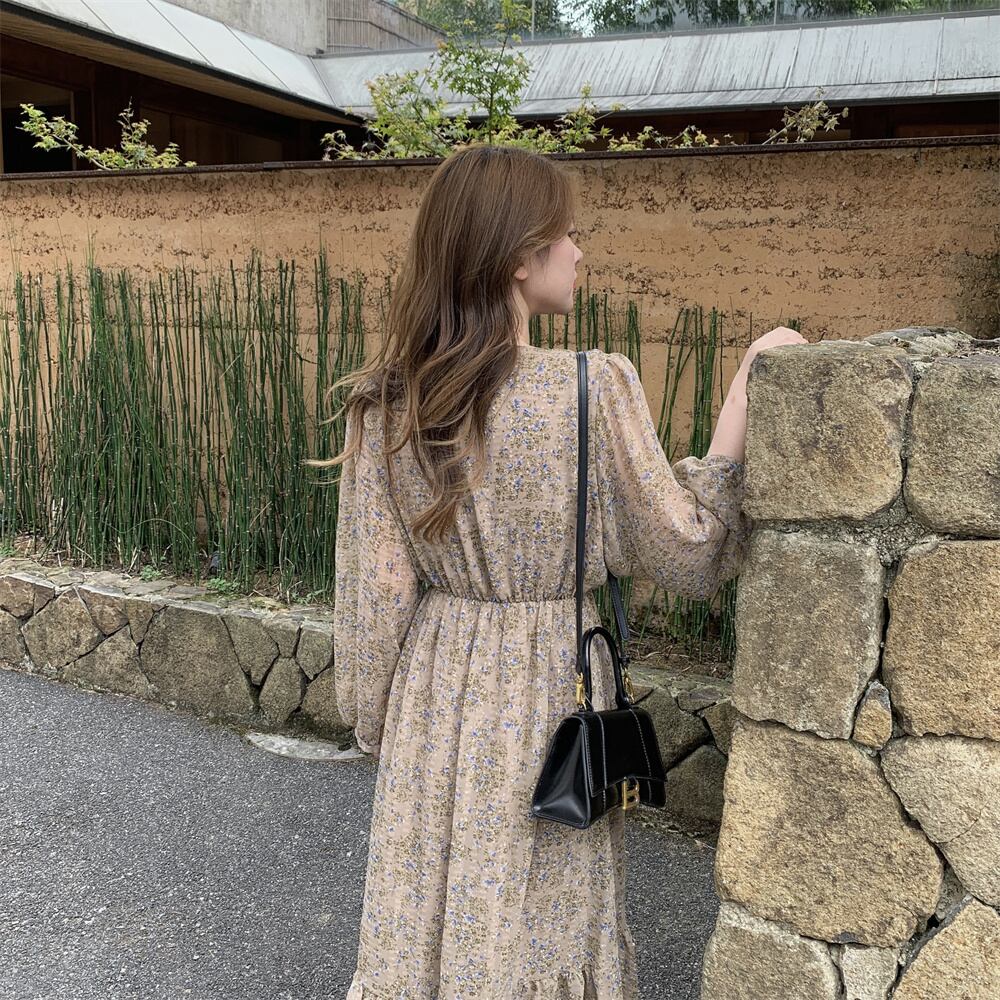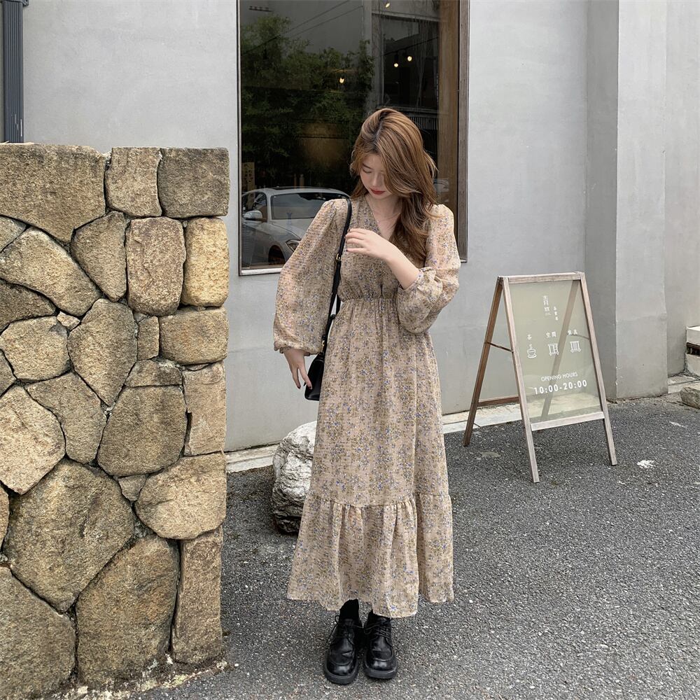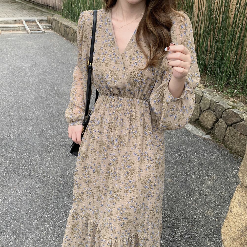 プラスサイズの婦人服 2023 ファットシスター春の新フレンチスタイルスリムウエストフリル v ネック花柄ドレス女性 大きめサイズ スプリング 春物 Vネック 8884176547844957