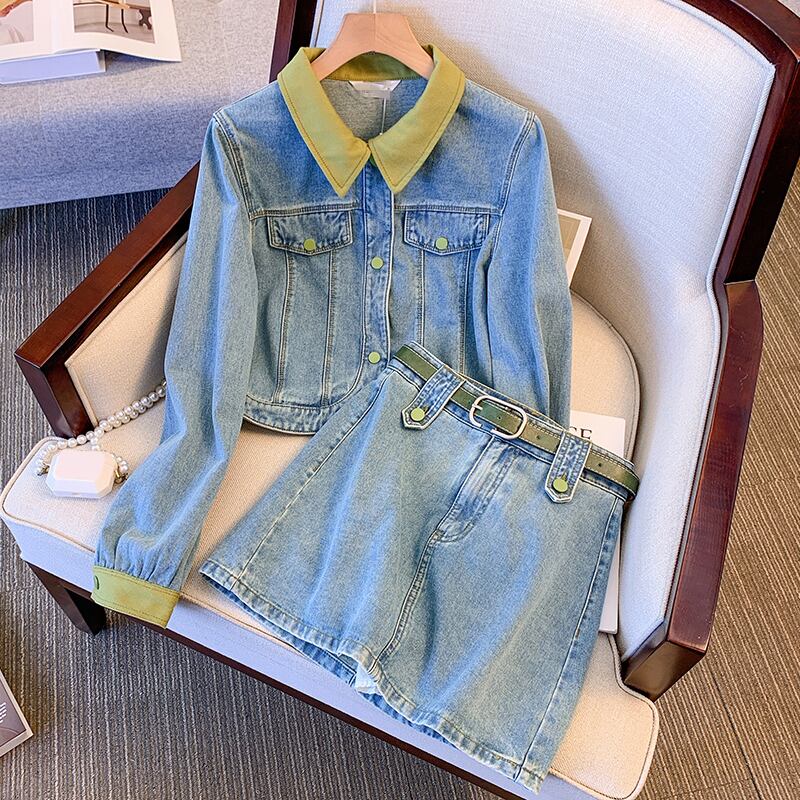 プラスサイズの婦人服 2023 春の新しいファットシスター気質デニムジャケットハイウエストカジュアルスカート 2 点セット ハイウェスト 大きめサイズ スプリング 春物 8884137007004864