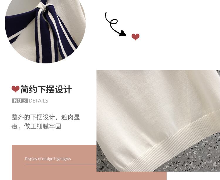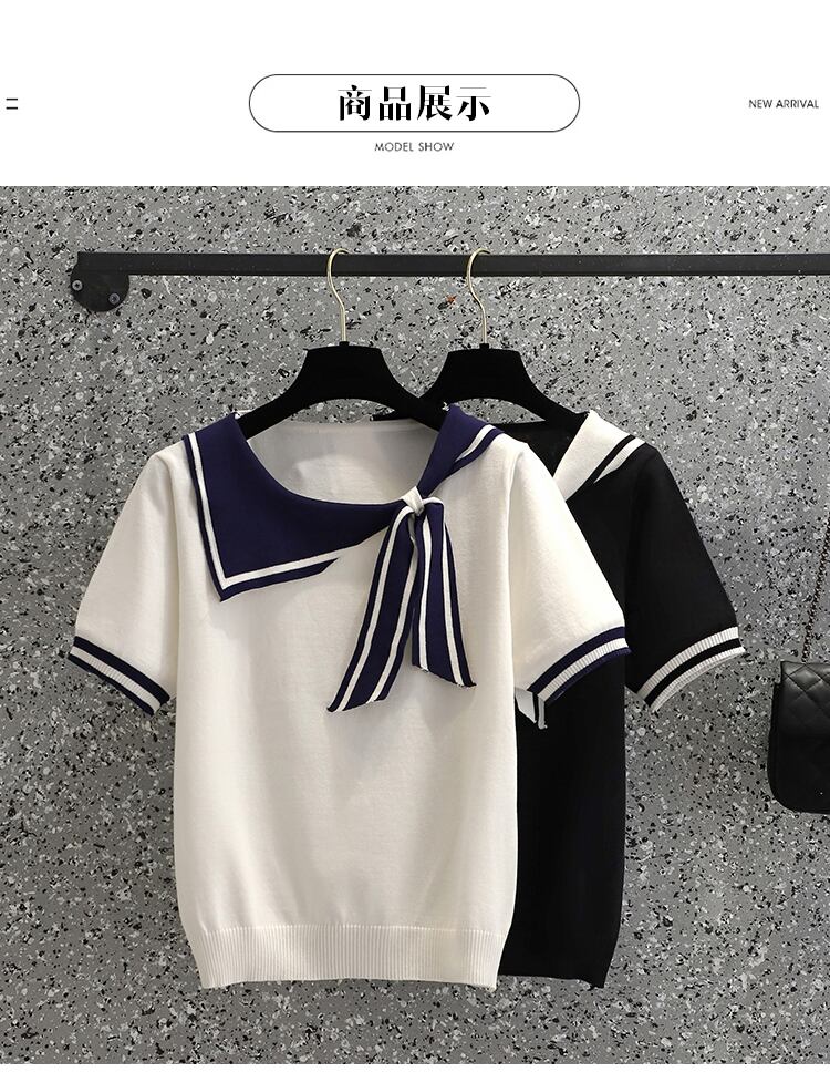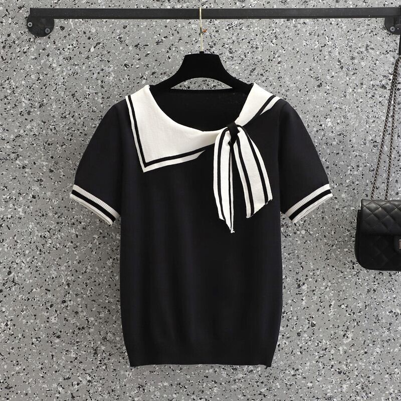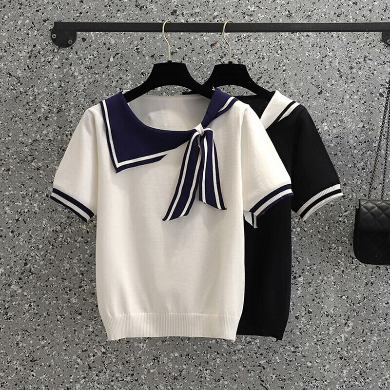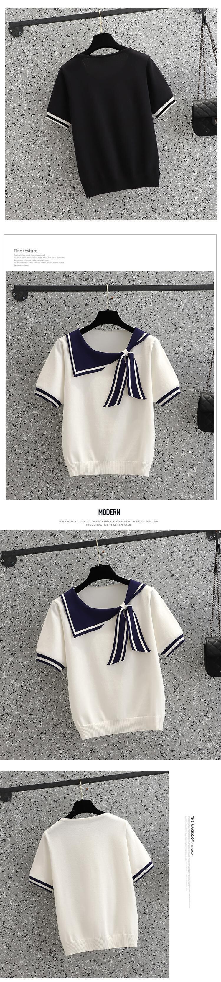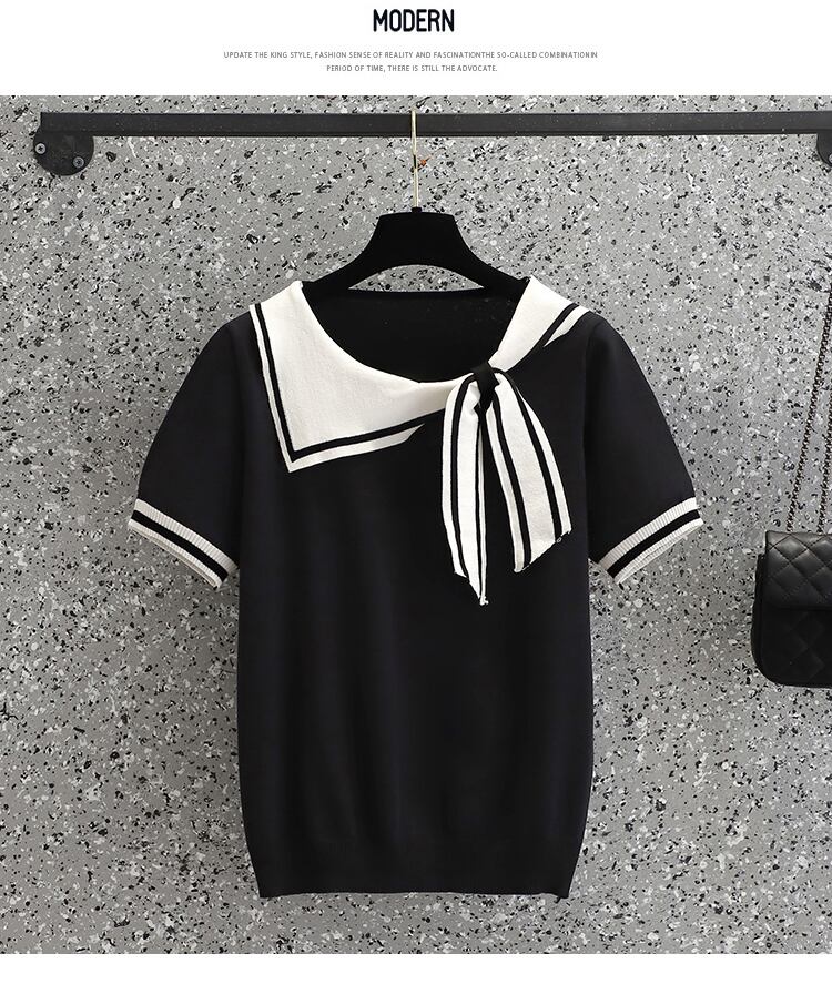 プラスサイズの婦人服 2023 ファットシスター夏の新しいニット Tシャツ気質ネイビーカラースリム半袖トップ女性 大きめサイズ サマー 夏物 8884122364999254