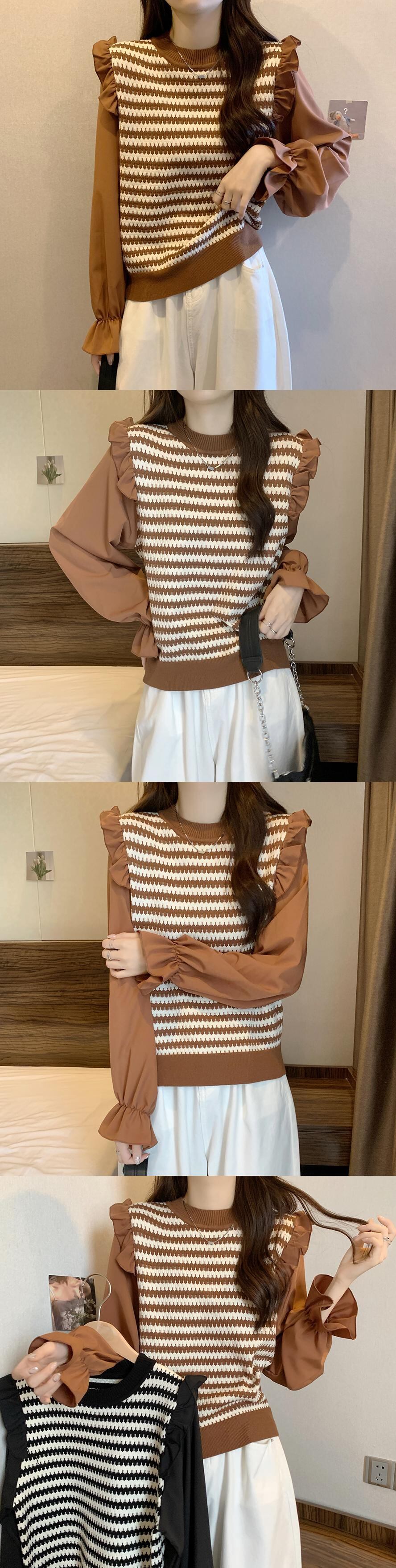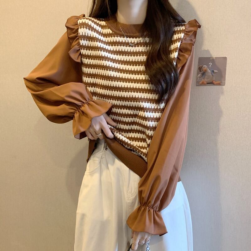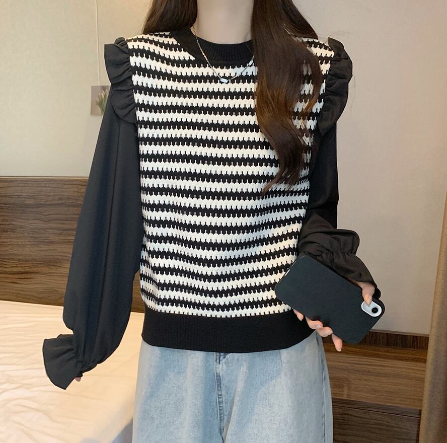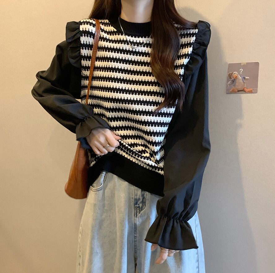 プラスサイズの婦人服2023春太った姉妹は薄いセーターのトップデザインのオールマッチレーススリーブスプライシングニットセーターに見えます 大きめサイズ スプリング 春物 8884170460203874