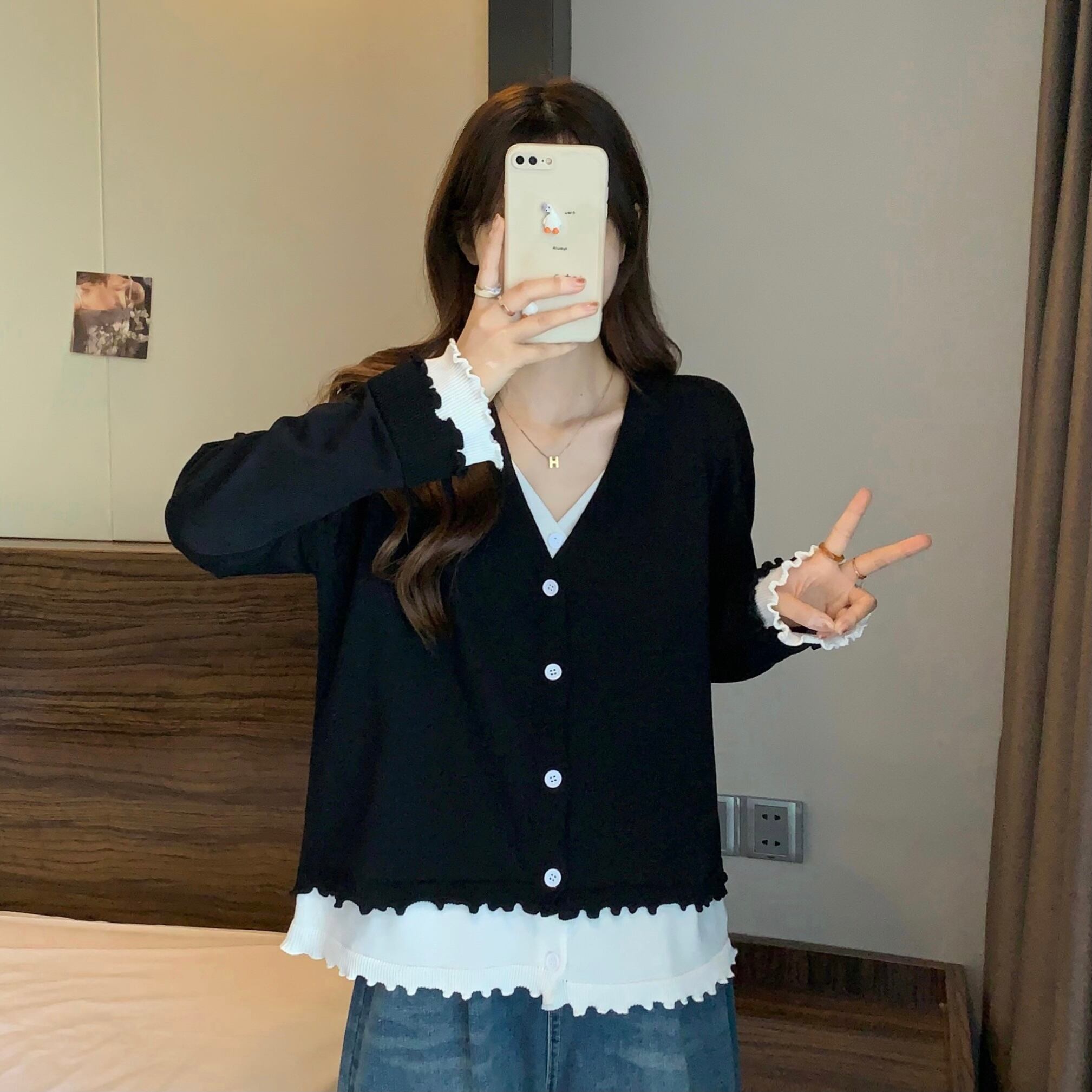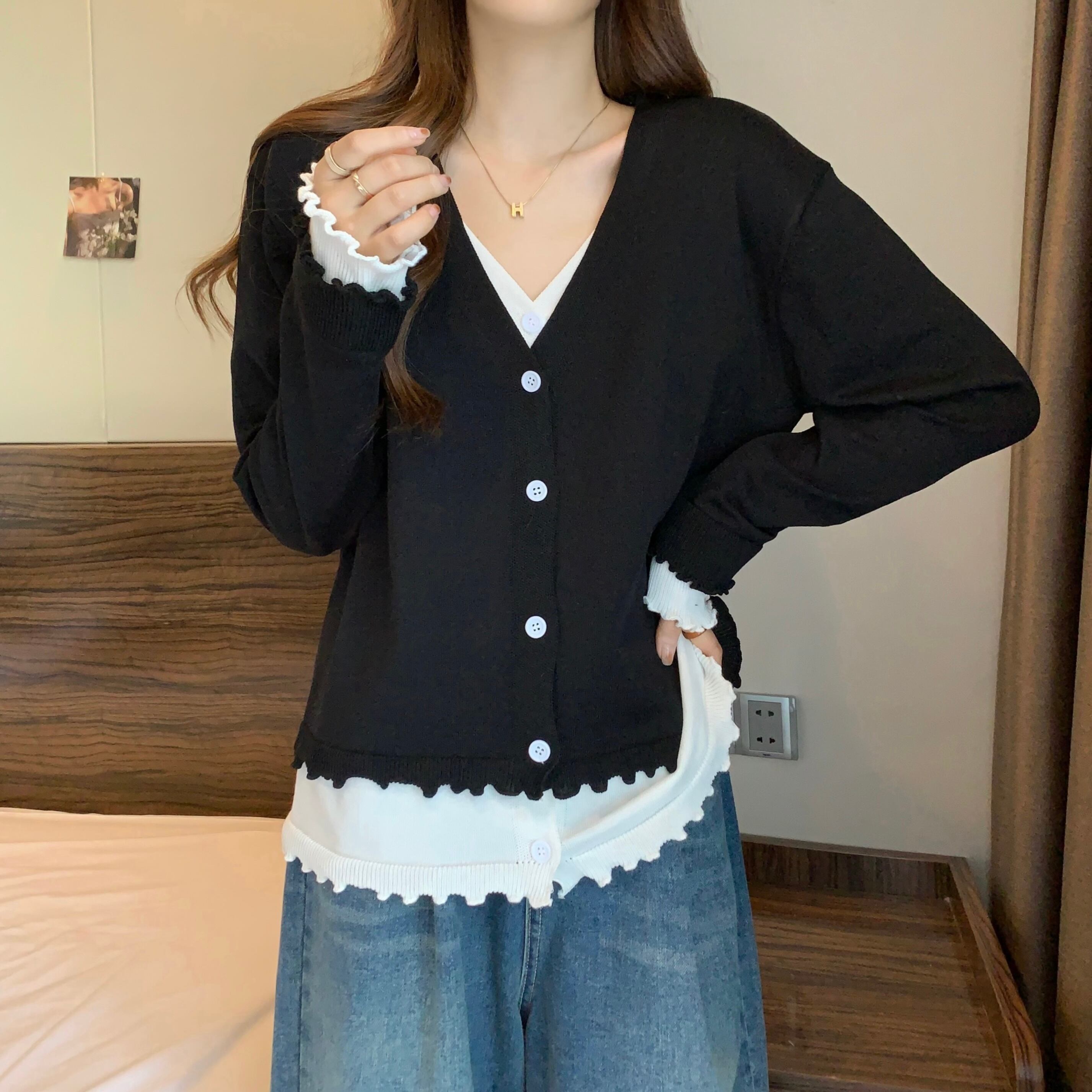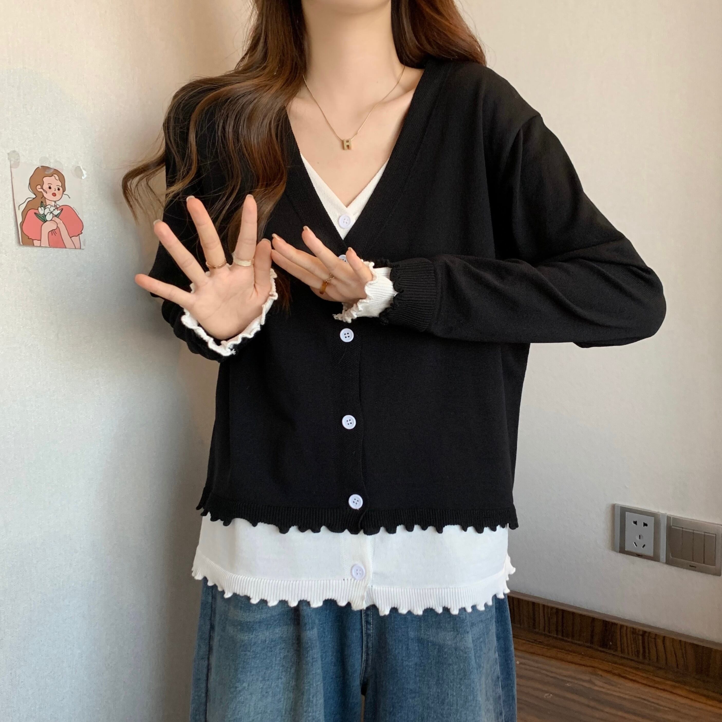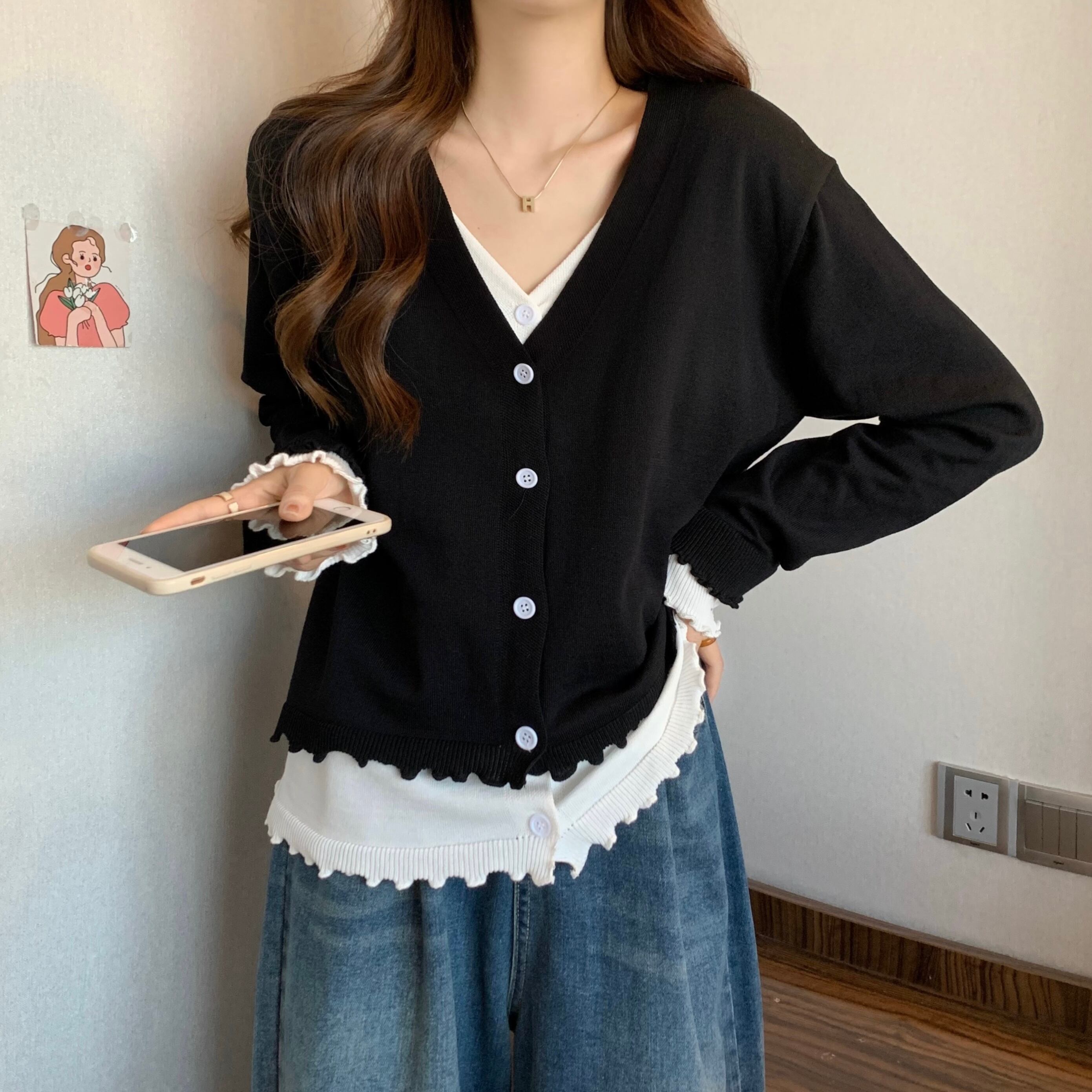 プラスサイズの婦人服 2023 春服脂肪姉妹新スタイルスプライシングニットカーディガン木製耳痩身フェイクツーピーストップス女性 大きめサイズ スプリング 春物 8884179798623614