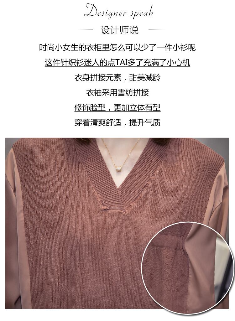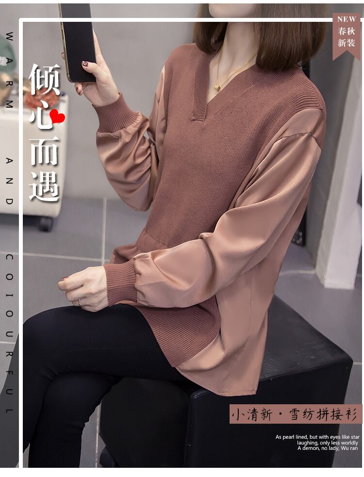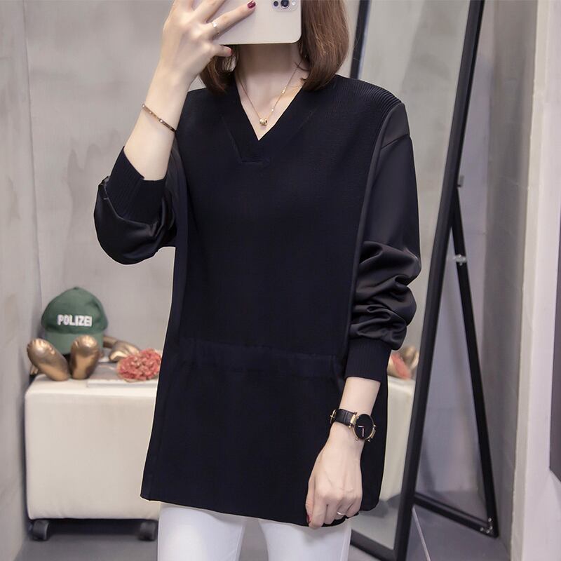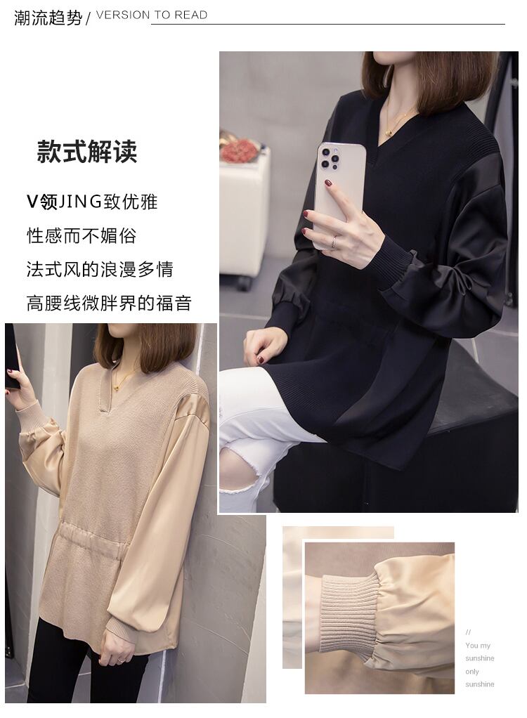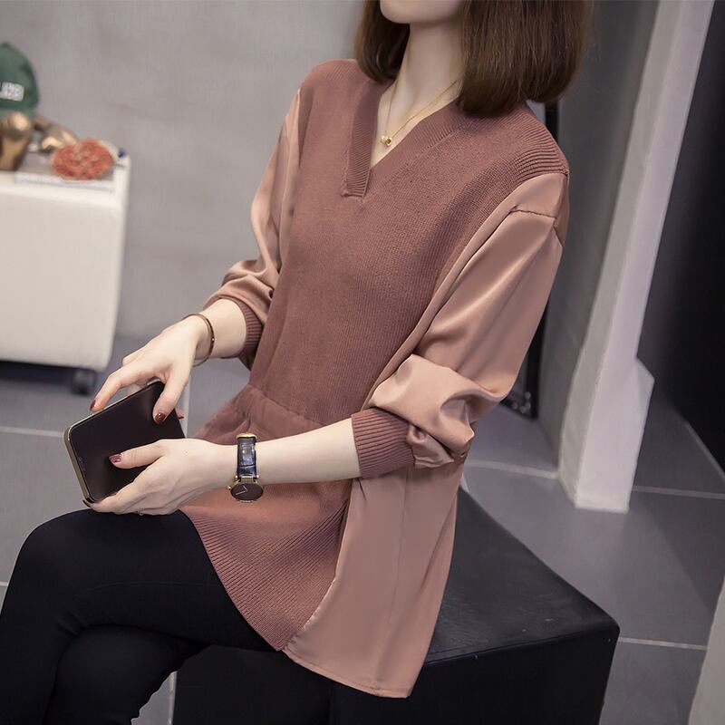 プラスサイズの婦人服 2023 ファットシスター春の新しい偽ツーピーストップ V ネックアイスシルクセータールーズボトミングシャツ 大きめサイズ スプリング 春物 Vネック 8884135673356766