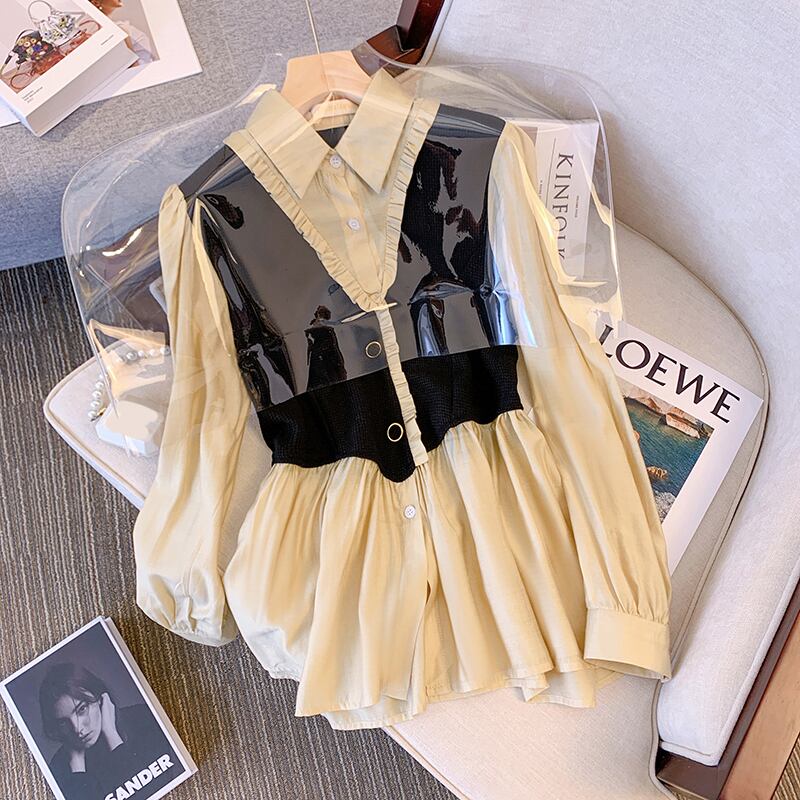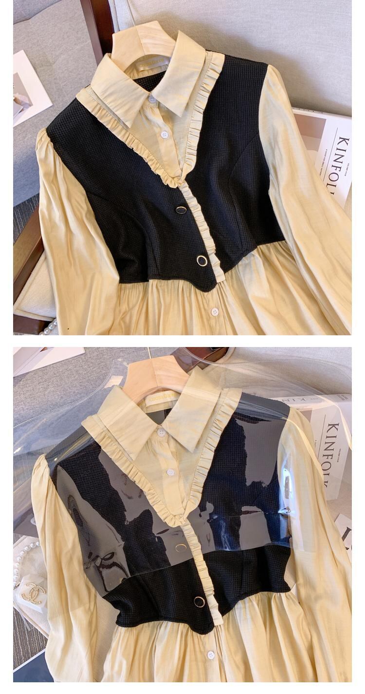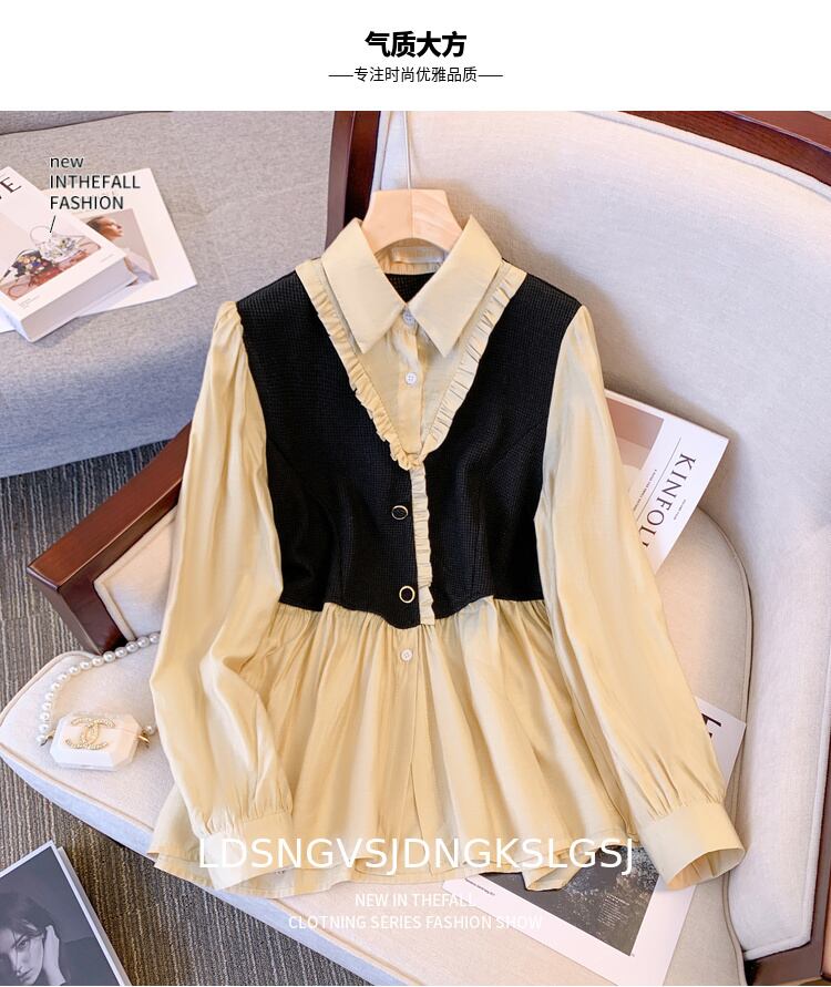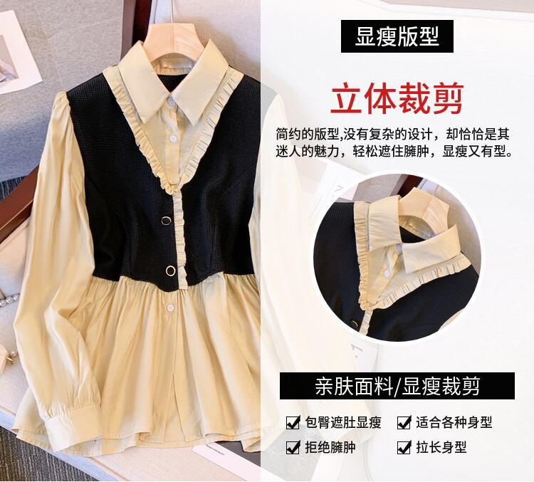 プラスサイズの婦人服 2023 トレンディな女性の春の新しい太った姉妹 eign スタイルカバー腹と薄いフェイクツーピーススプライスウエストシャツトレンディ 大きめサイズ スプリング 春物 8884193395418670