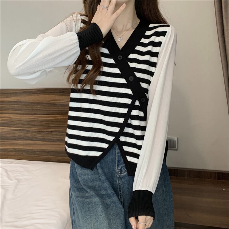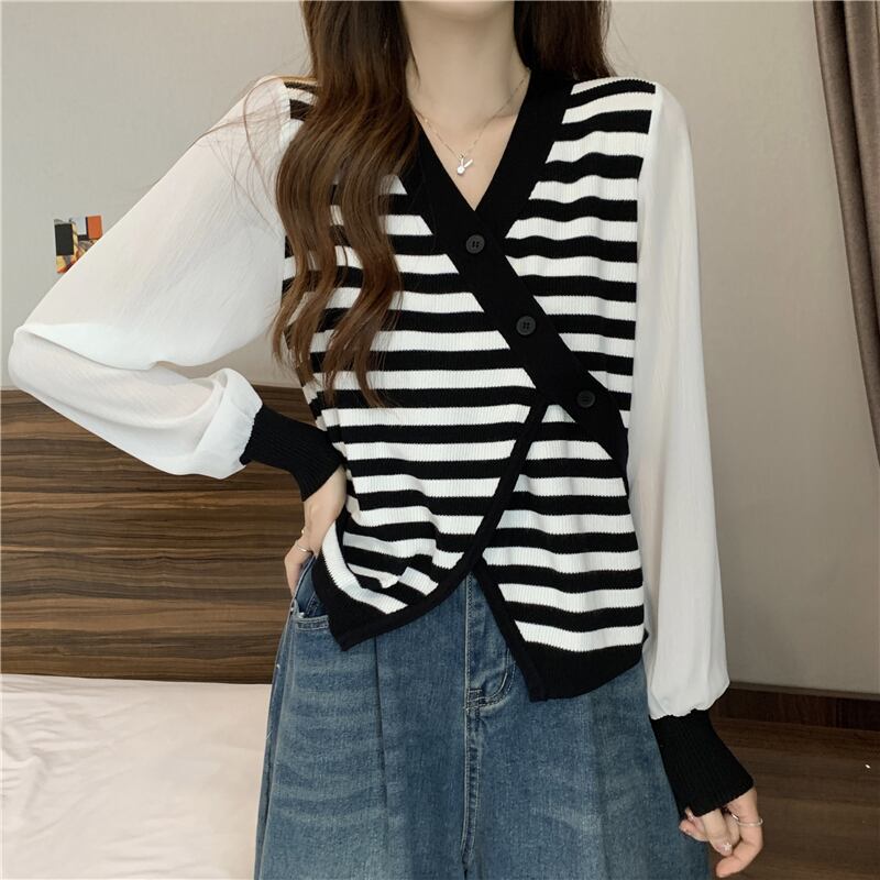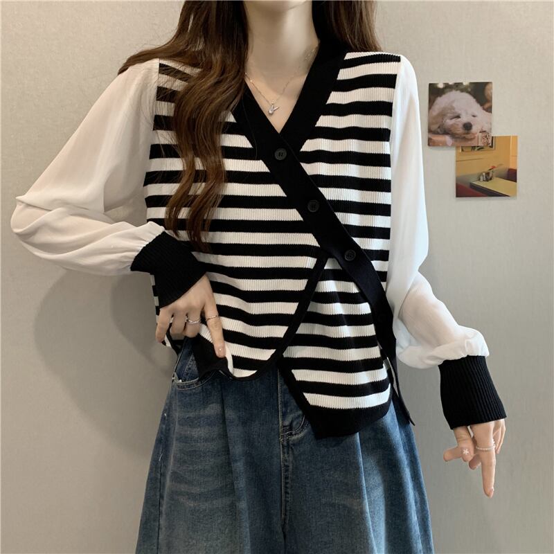 大きいサイズの婦人服 2023 春服脂肪姉妹新しいファッション シフォン ステッチ ニット セーターに見える薄いフェイク ツーピース トップ 大きめサイズ スプリング 春物 8884118732576797