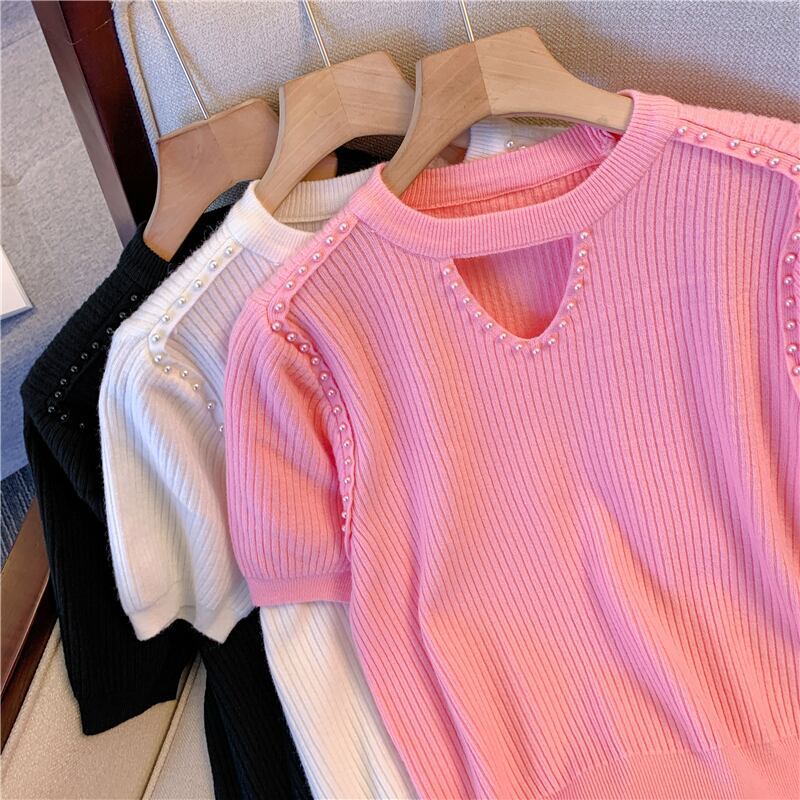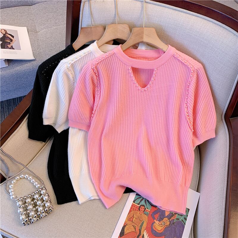 プラスサイズの婦人服 2023 ファットシスター夏新ビーズセーター薄肉中空 eign スタイル半袖 Tシャツ女性 大きめサイズ サマー 夏物 8884191833456456