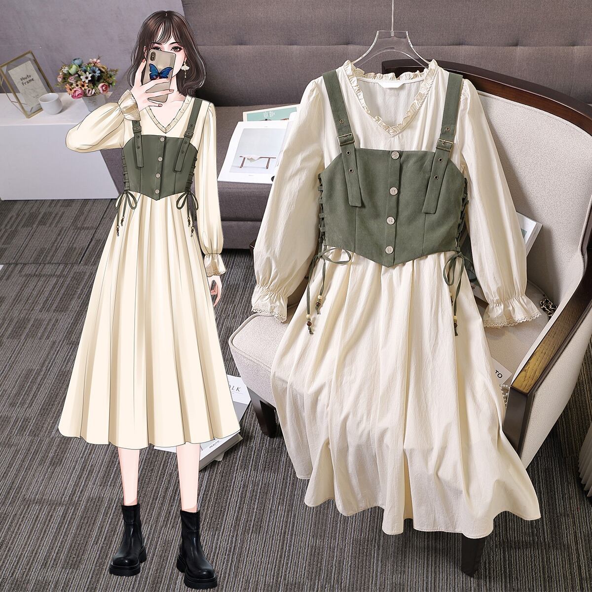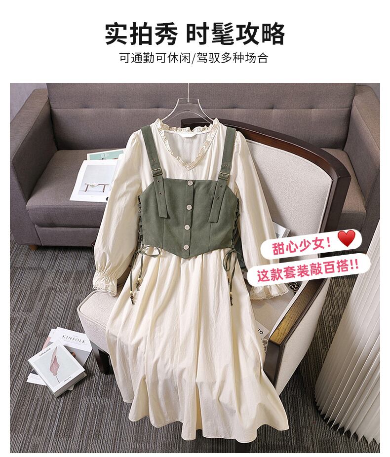 プラスサイズの婦人服 2023 トレンディな女性の春の新しいファットシスターファッションサスペンダーベスト長袖ウエストドレス 2 点セット ロング 大きめサイズ スプリング 春物 8884196138861369