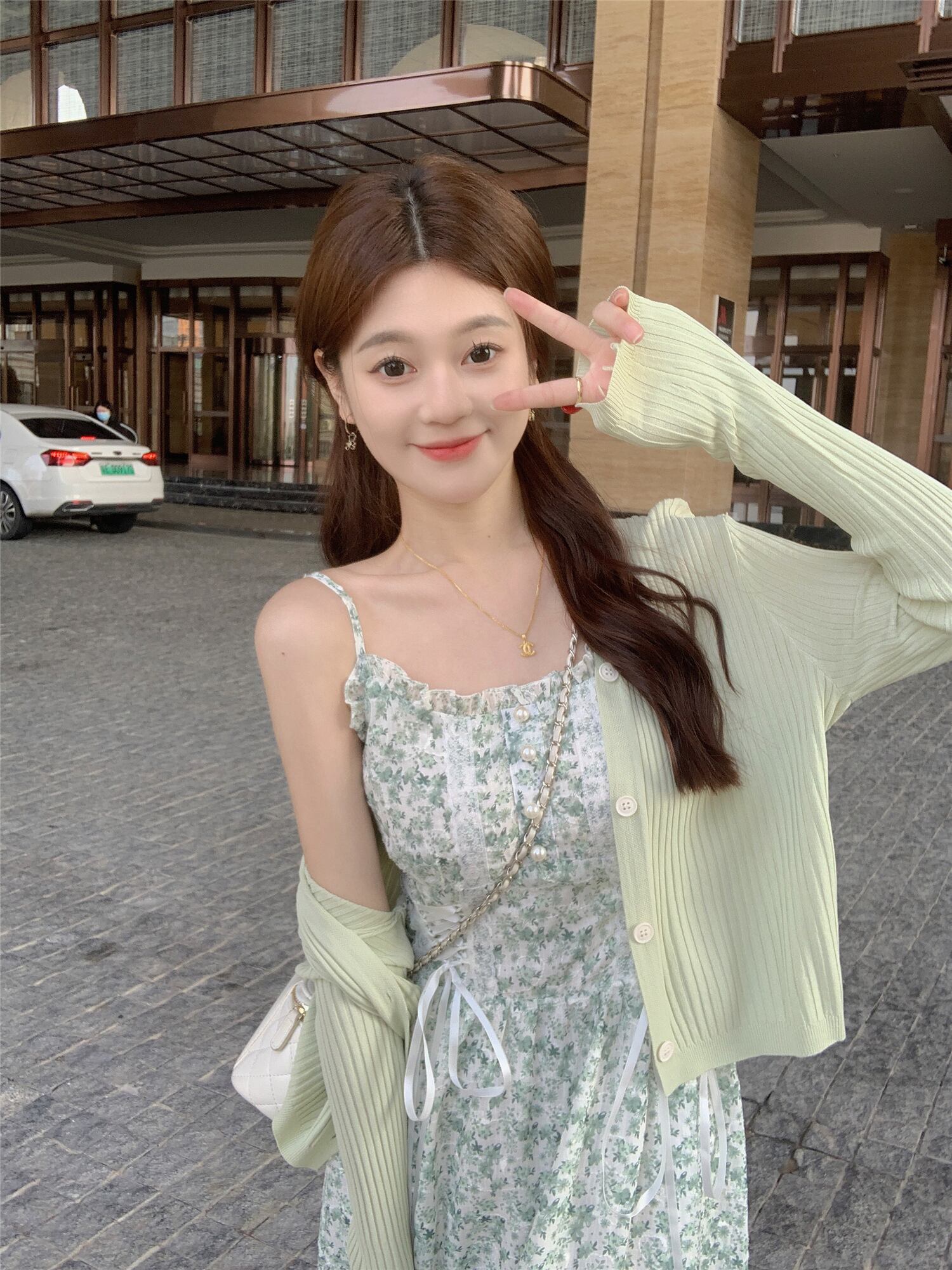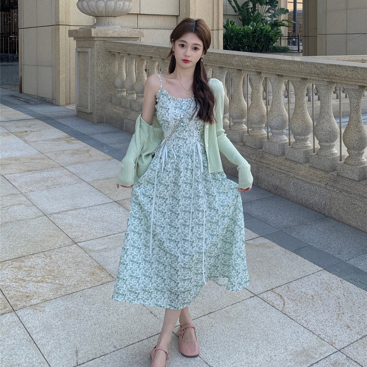 色:アプリコットカーディガン,グリーンカーディガン,アプリコットホルターワンピース,緑のサスペンダードレス