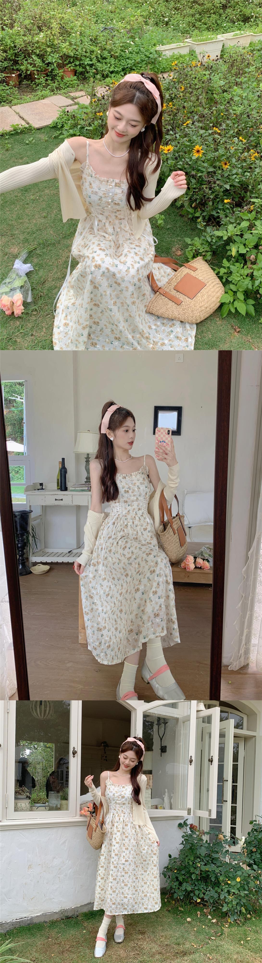 プラスサイズの婦人服 2023 春の新しい甘い花サスペンダー ドレス脂肪姉妹ニット カーディガン ツーピース スーツ 大きめサイズ 大人ガーリー スウィート キュート カジュアル スプリング 春物 花柄 8884124336730750