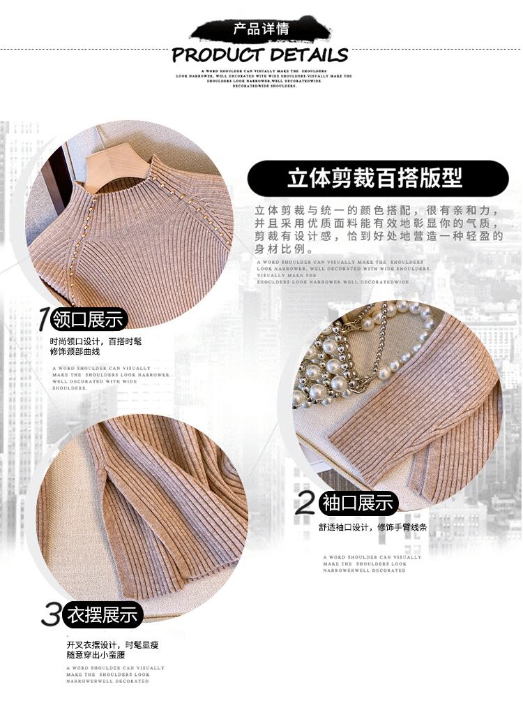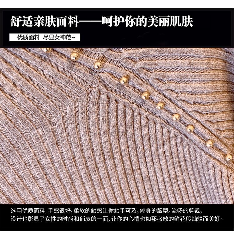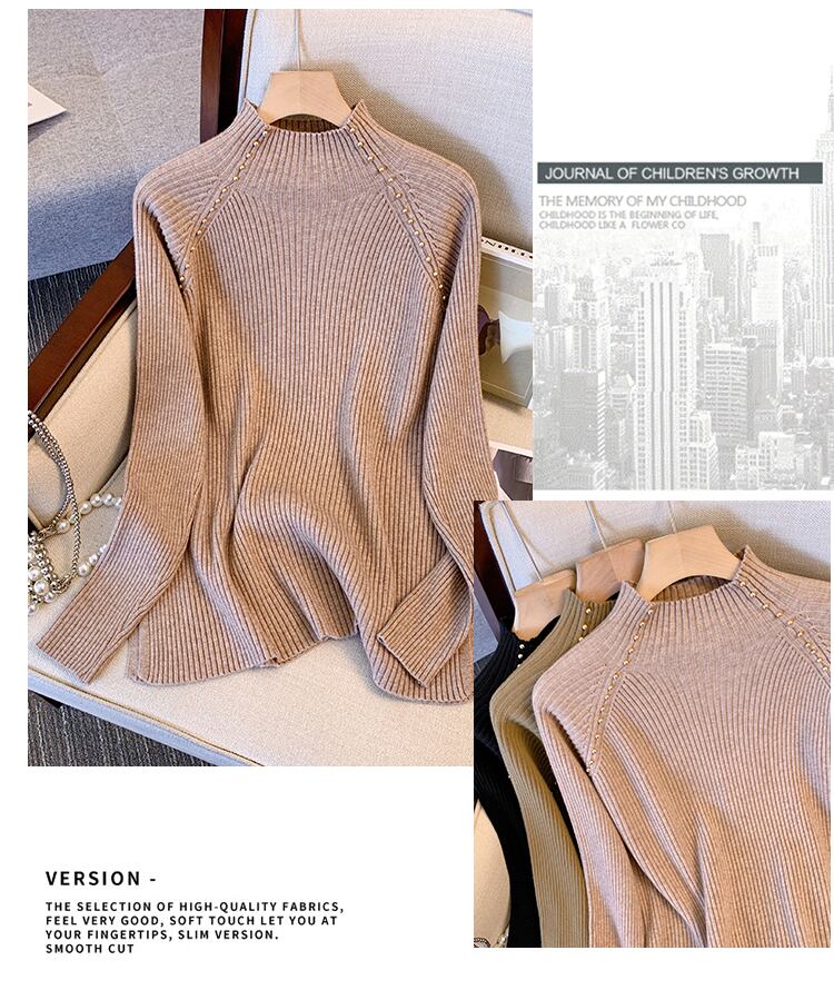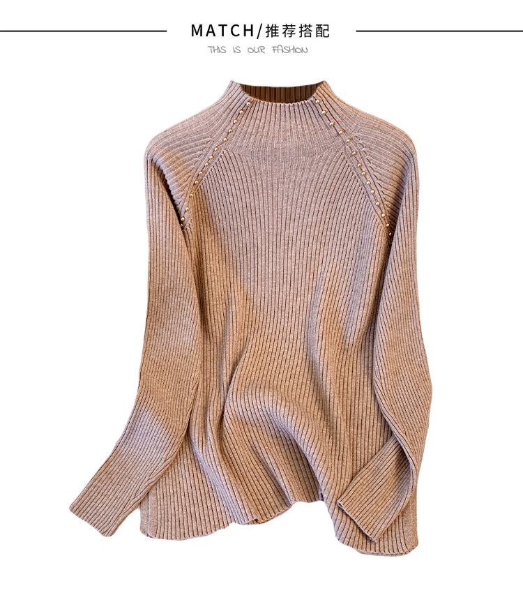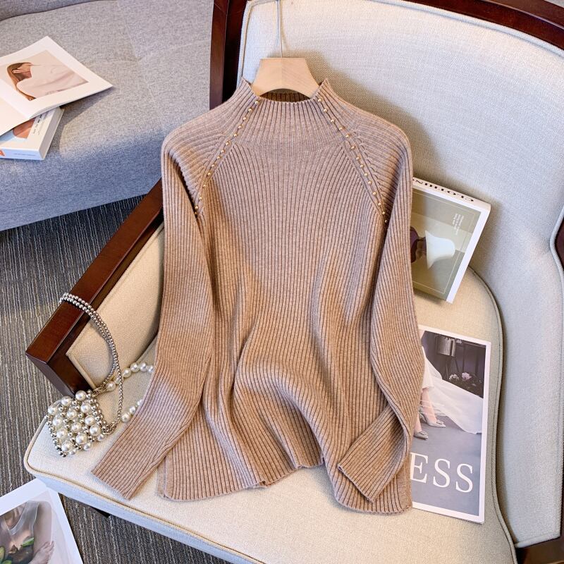 プラスサイズの婦人服 2023 ファットシスター春の新作ハーフハイカラービーズスリットニットセータートップルーズセーター 大きめサイズ スプリング 春物 8884197332292616