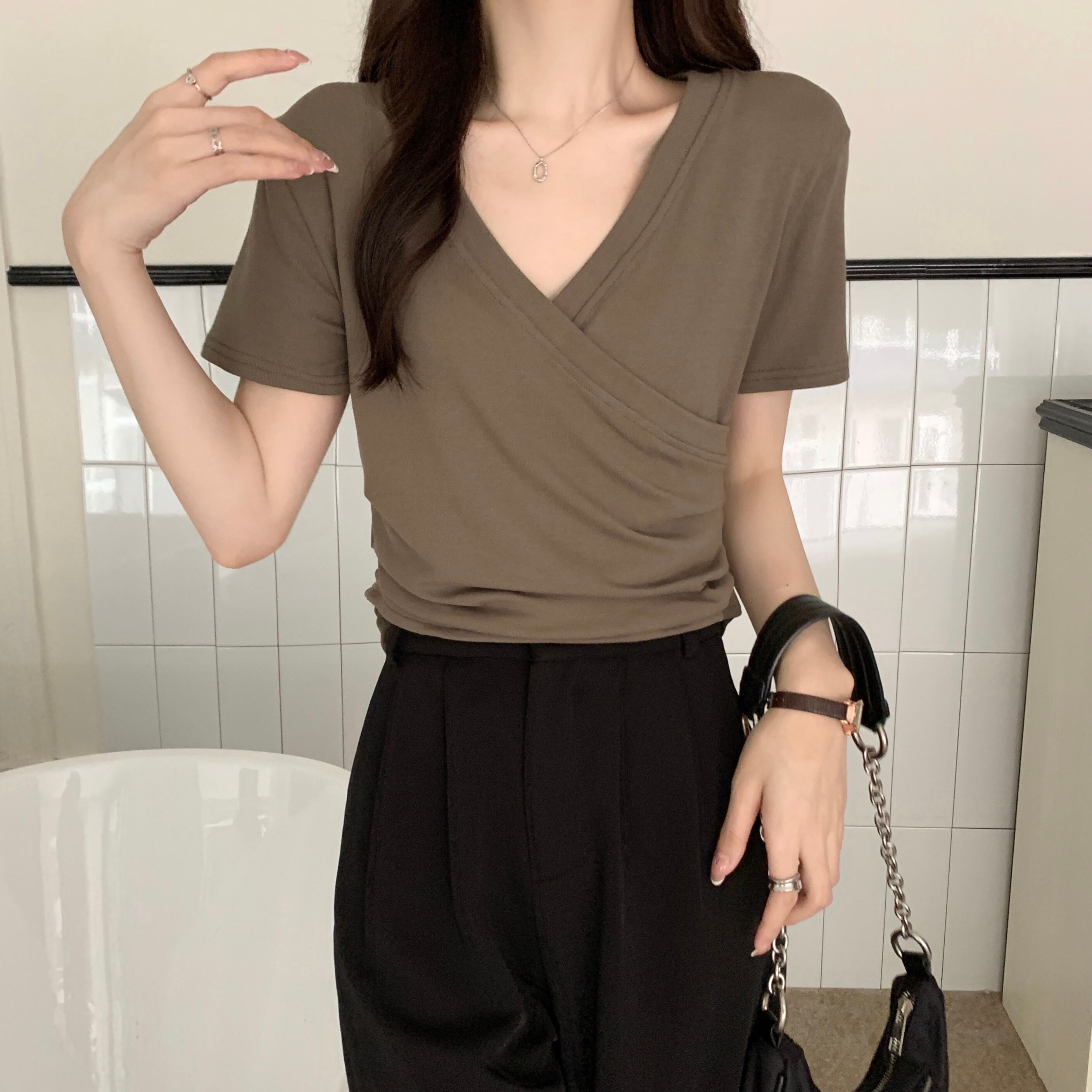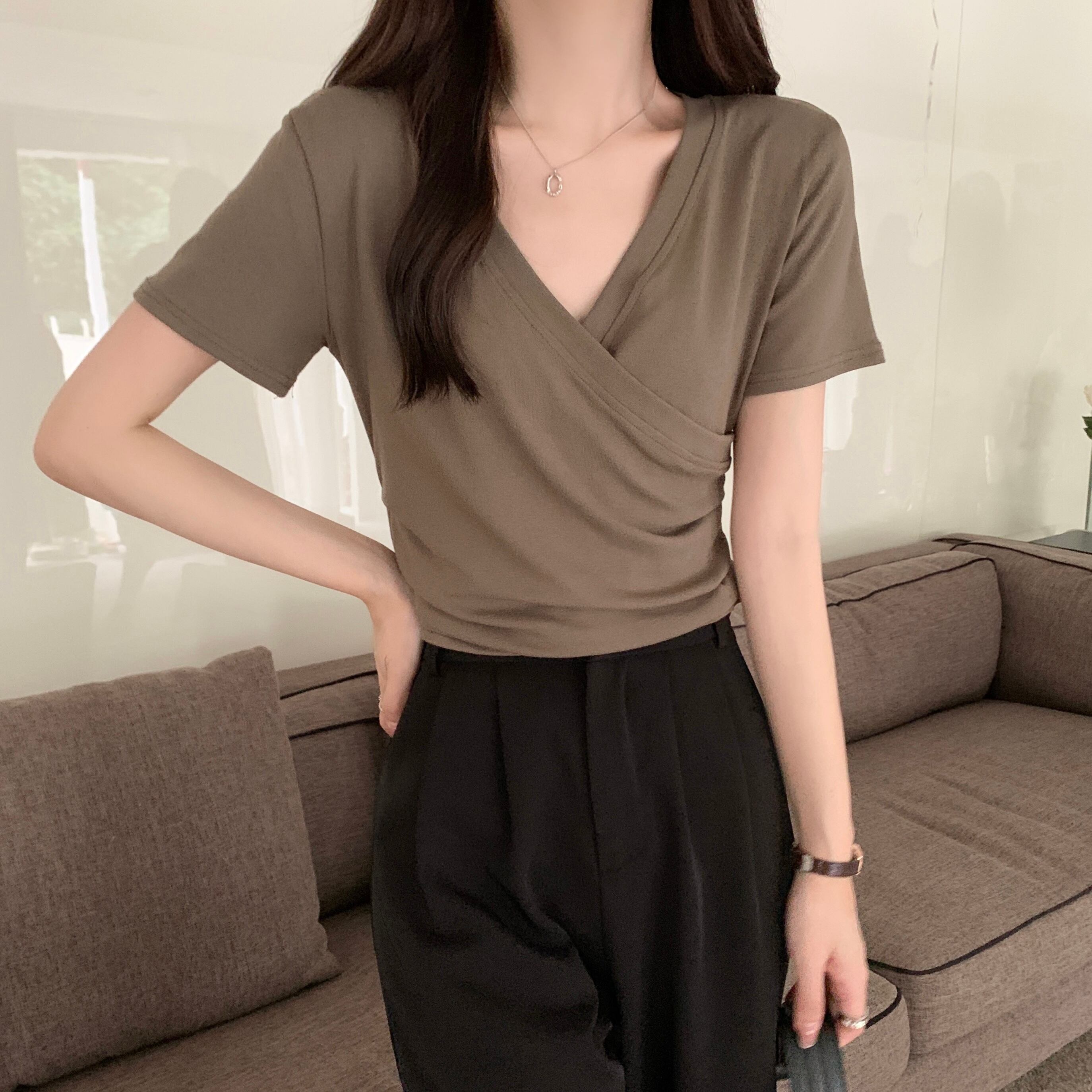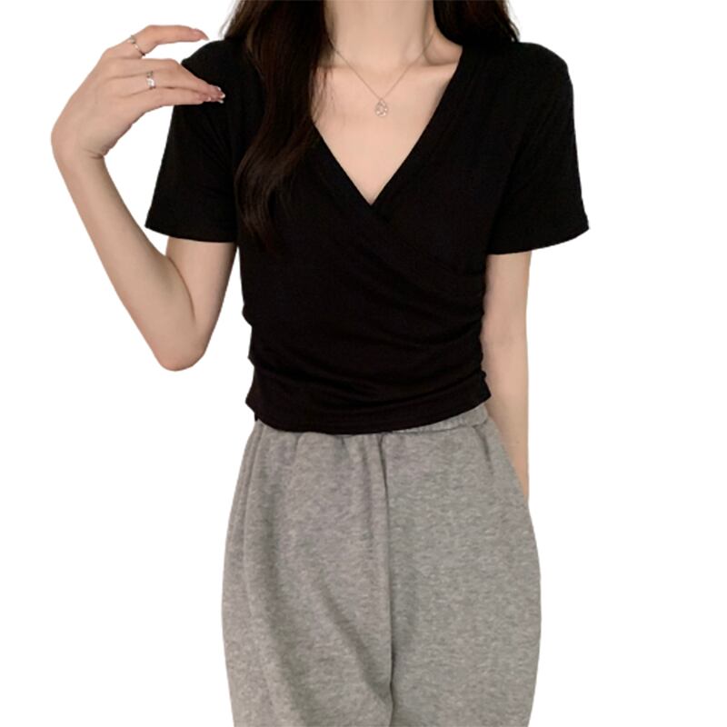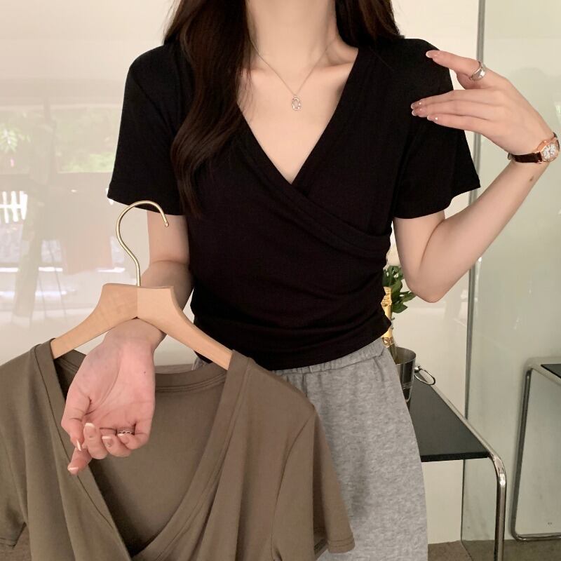 プラスサイズの婦人服 2023 トレンディな女性の夏の新しい太った姉妹バージョンのハイエンドクロス v ネックの女性のデザイン半袖 Tシャツ 大きめサイズ サマー 夏物 Vネック 8884112680246213