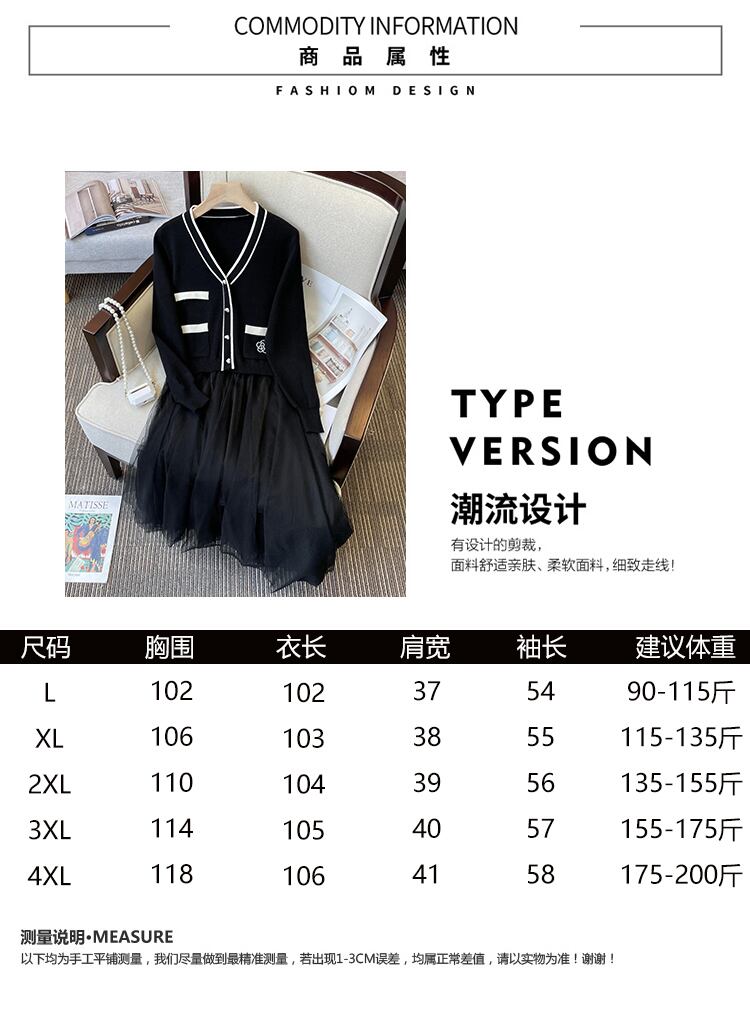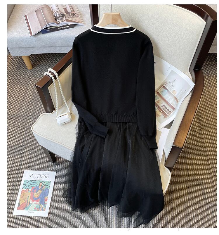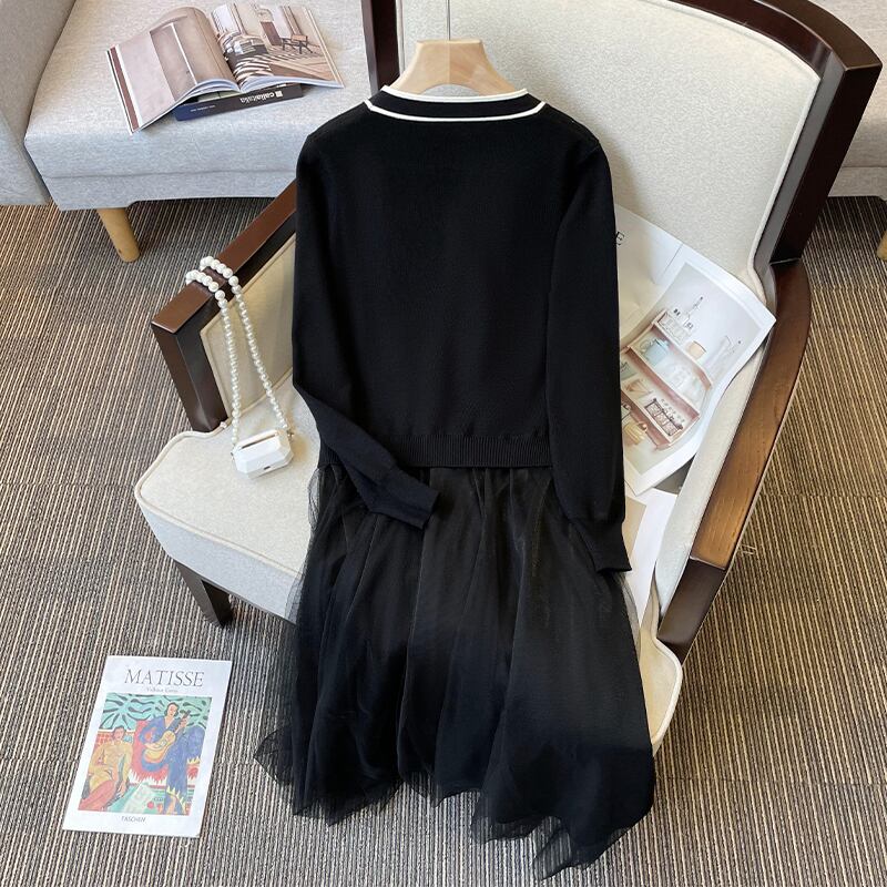 プラスサイズの婦人服 2023 トレンディな女性の春の新しいファットシスター V ネックメッシュスプライシングフェイクツーピース底入れニットドレス 大きめサイズ スプリング 春物 Vネック 8884110152006740