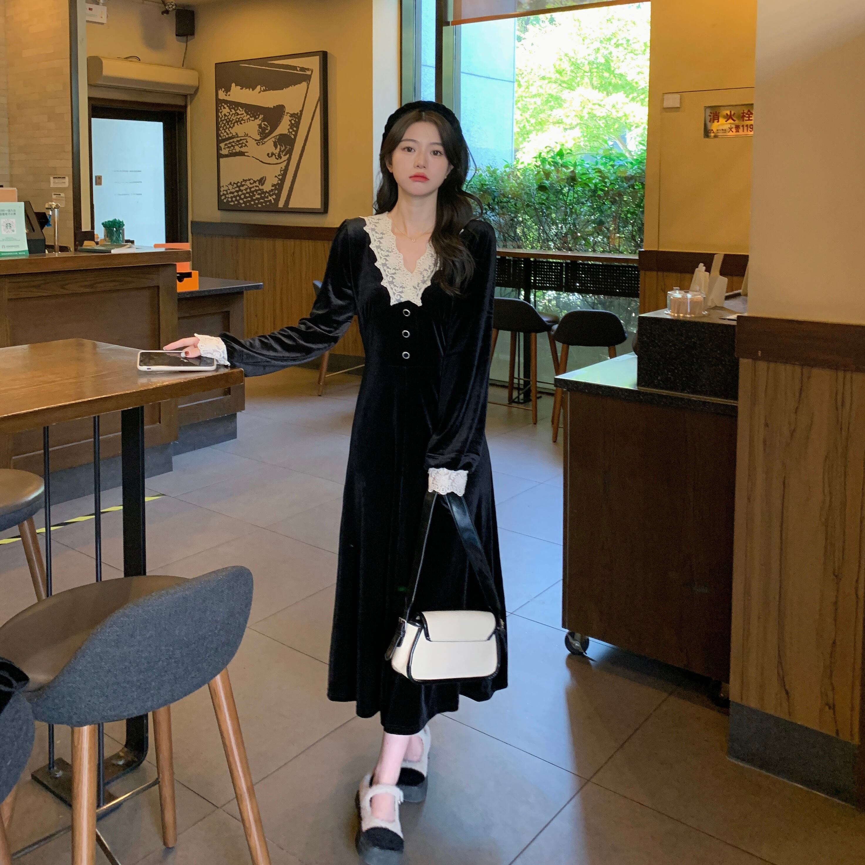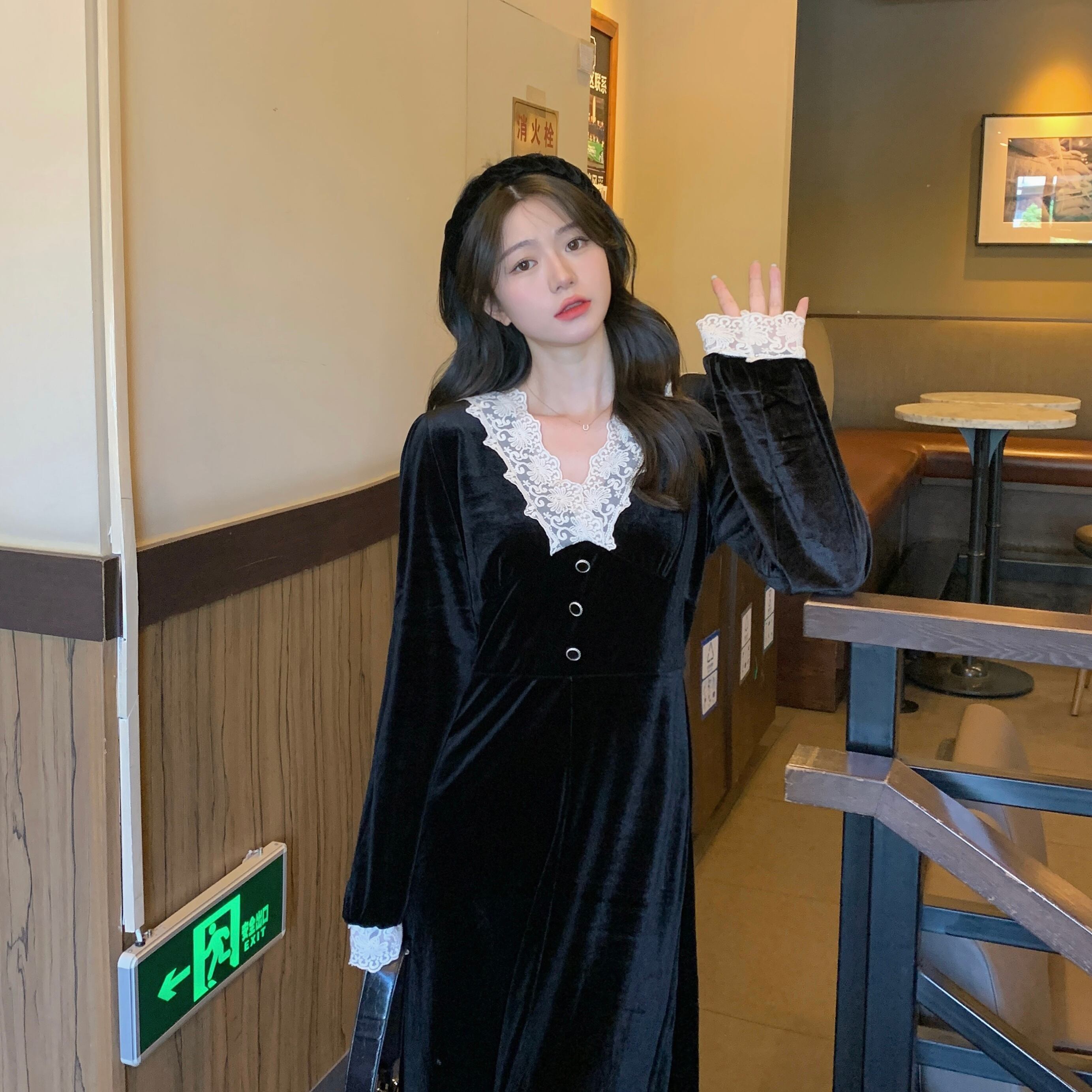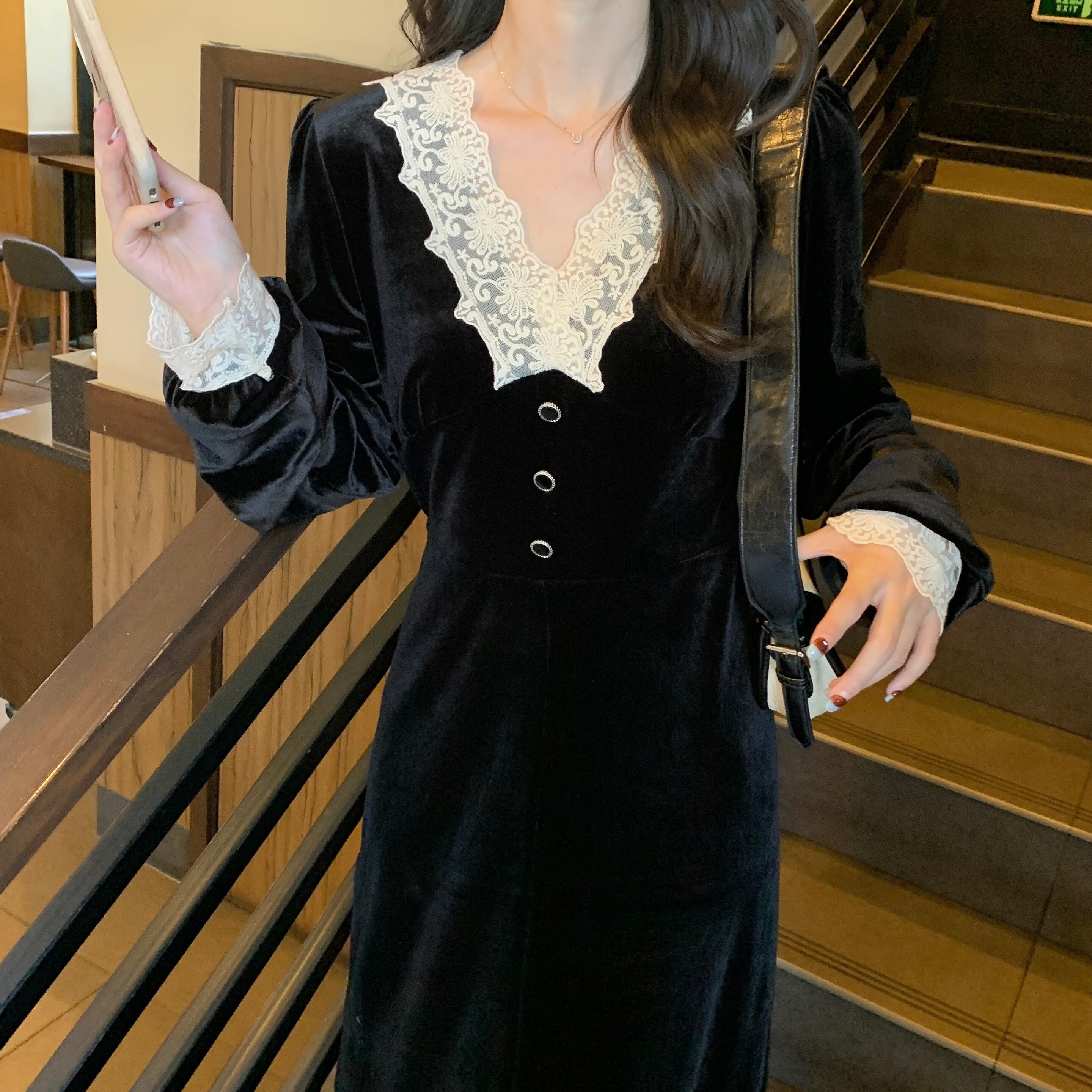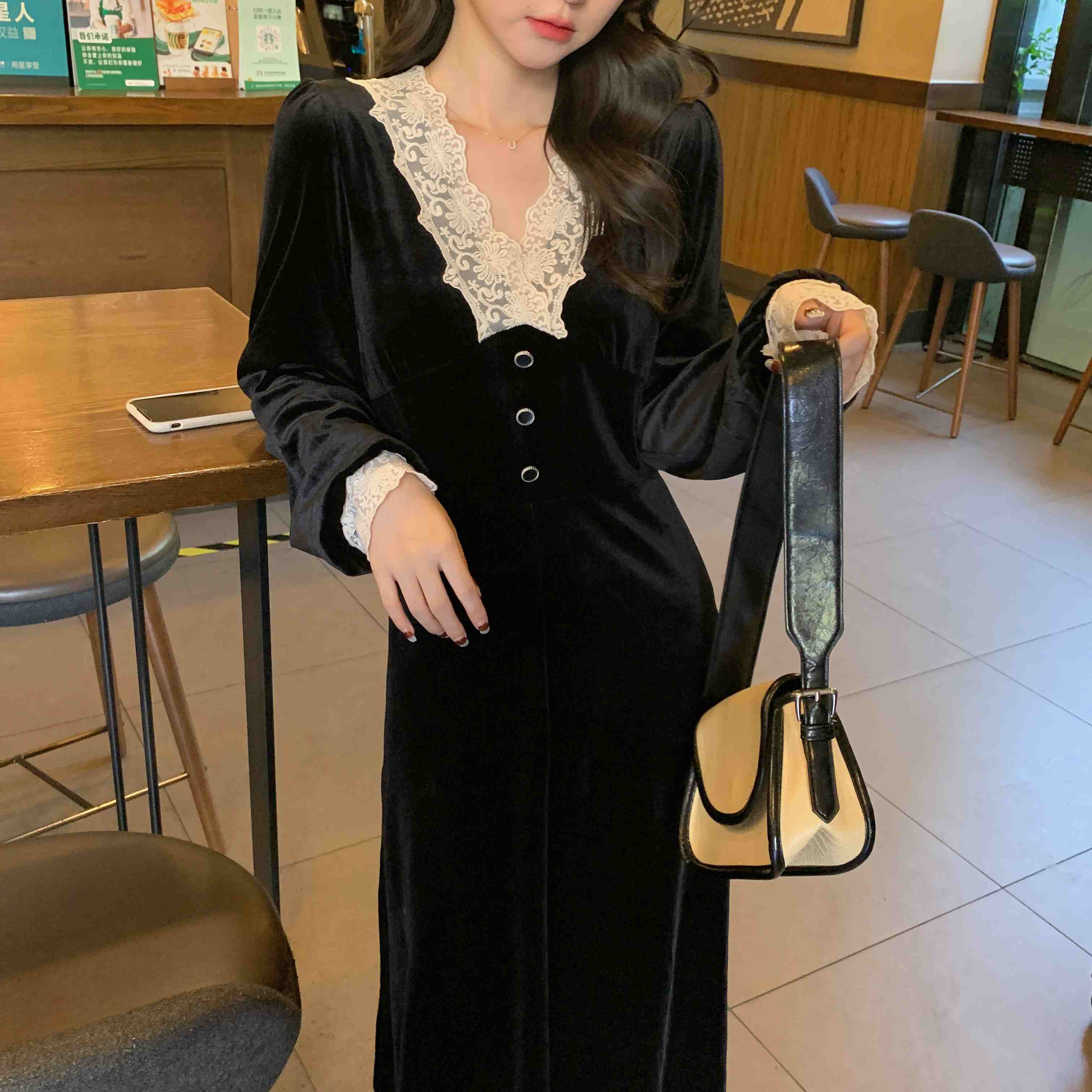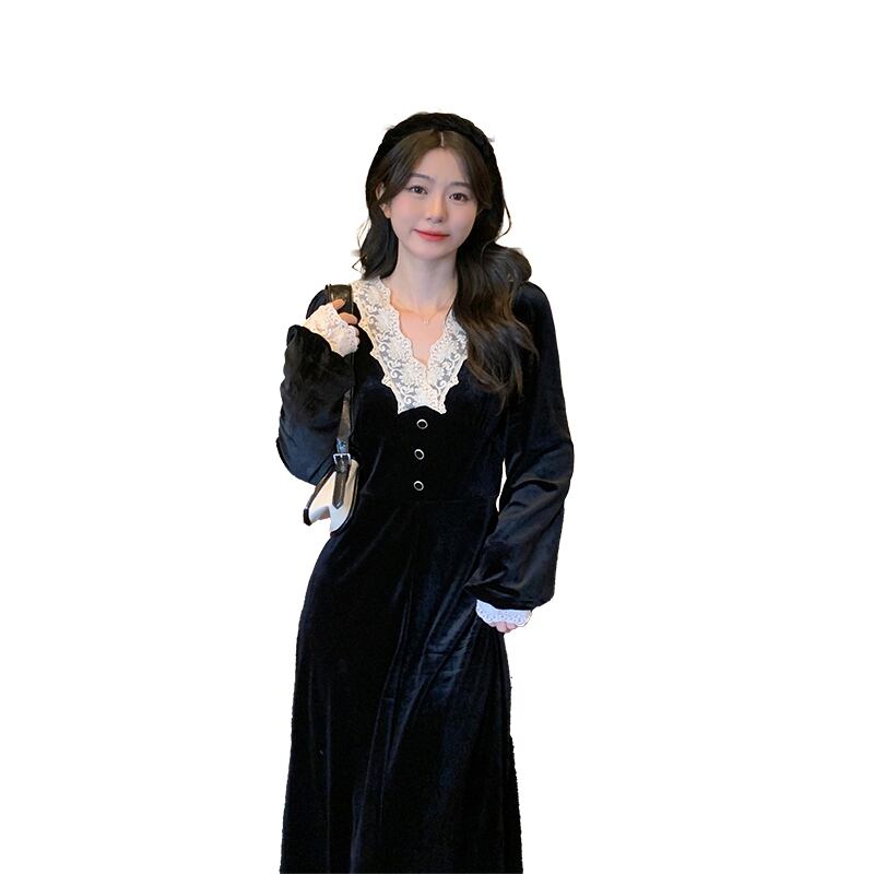 プラスサイズの婦人服 2023 脂肪姉妹春の新フレンチドレス v ネックのレースのステッチのベルベットのドレスの女性 大きめサイズ スプリング 春物 Vネック 8884125318391996