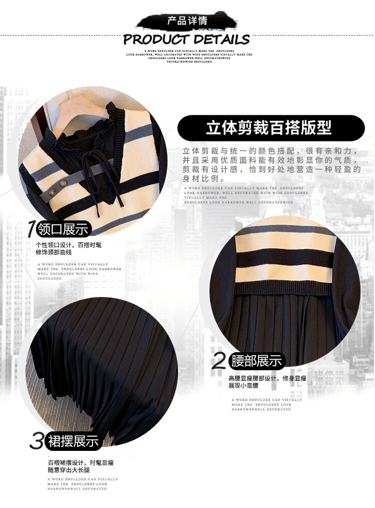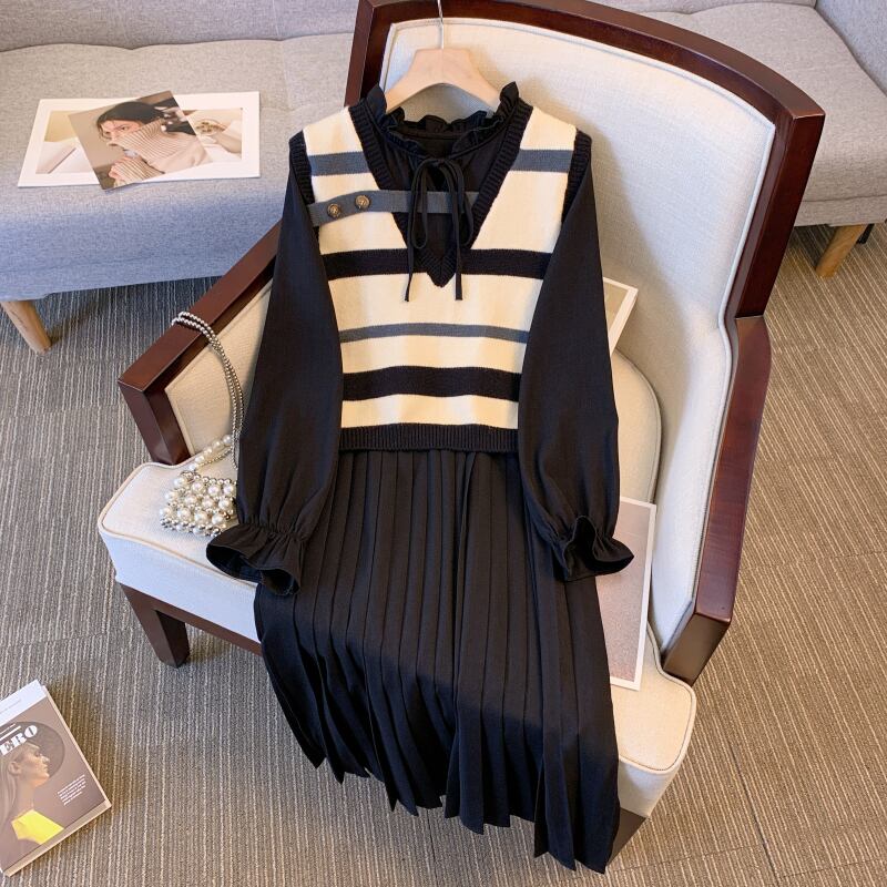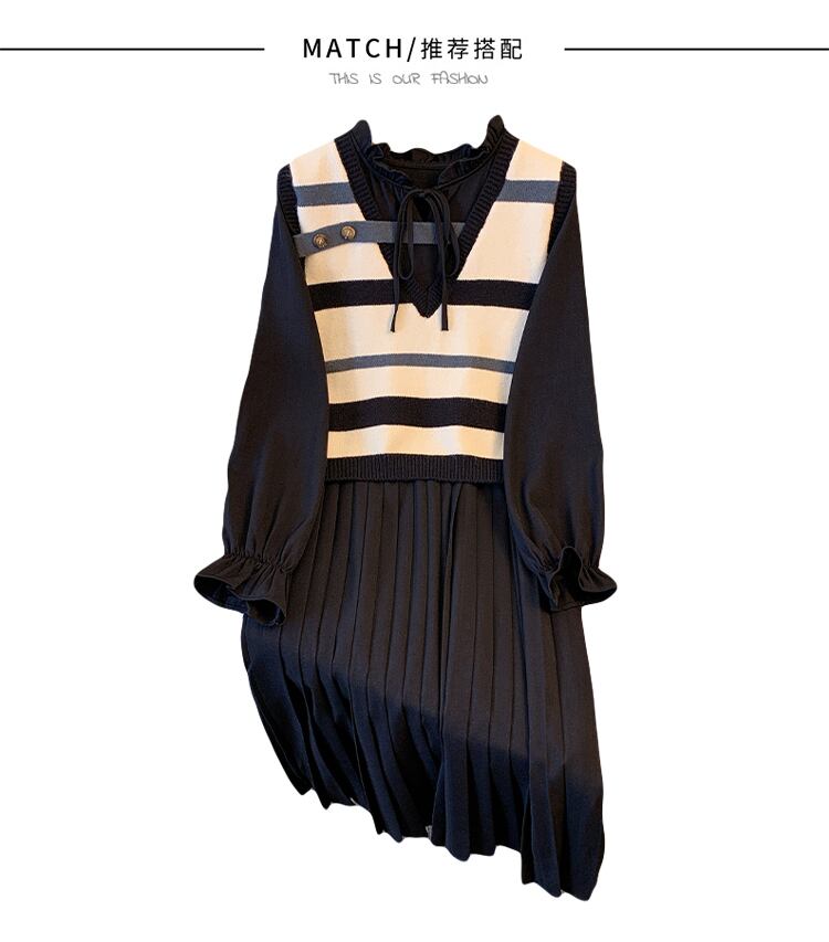 プラスサイズの婦人服 2023 ファットシスター春の新 V ネックベスト長袖プリーツドレス痩身ツーピースセット ロング 大きめサイズ スプリング 春物 Vネック 8884142627228545