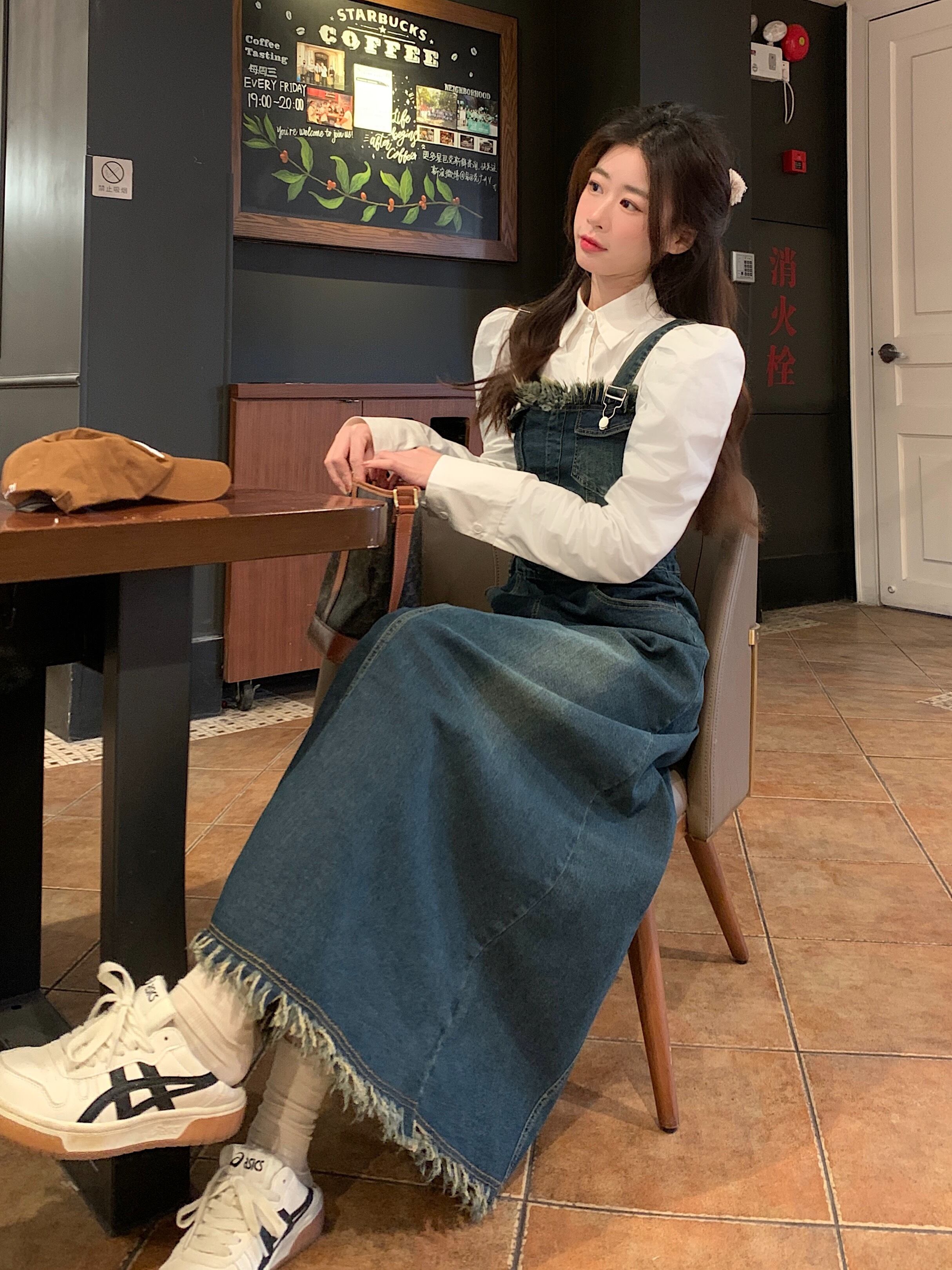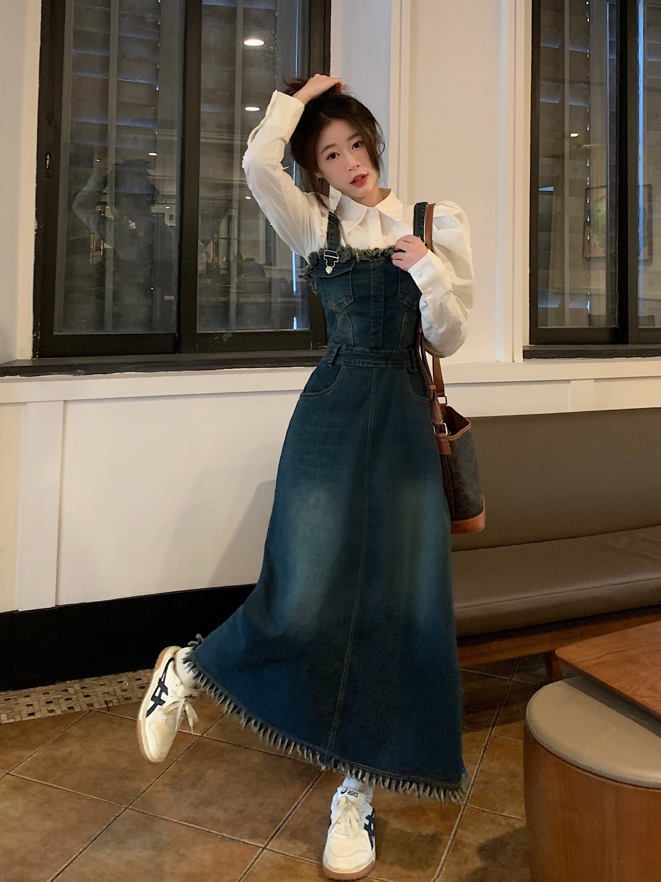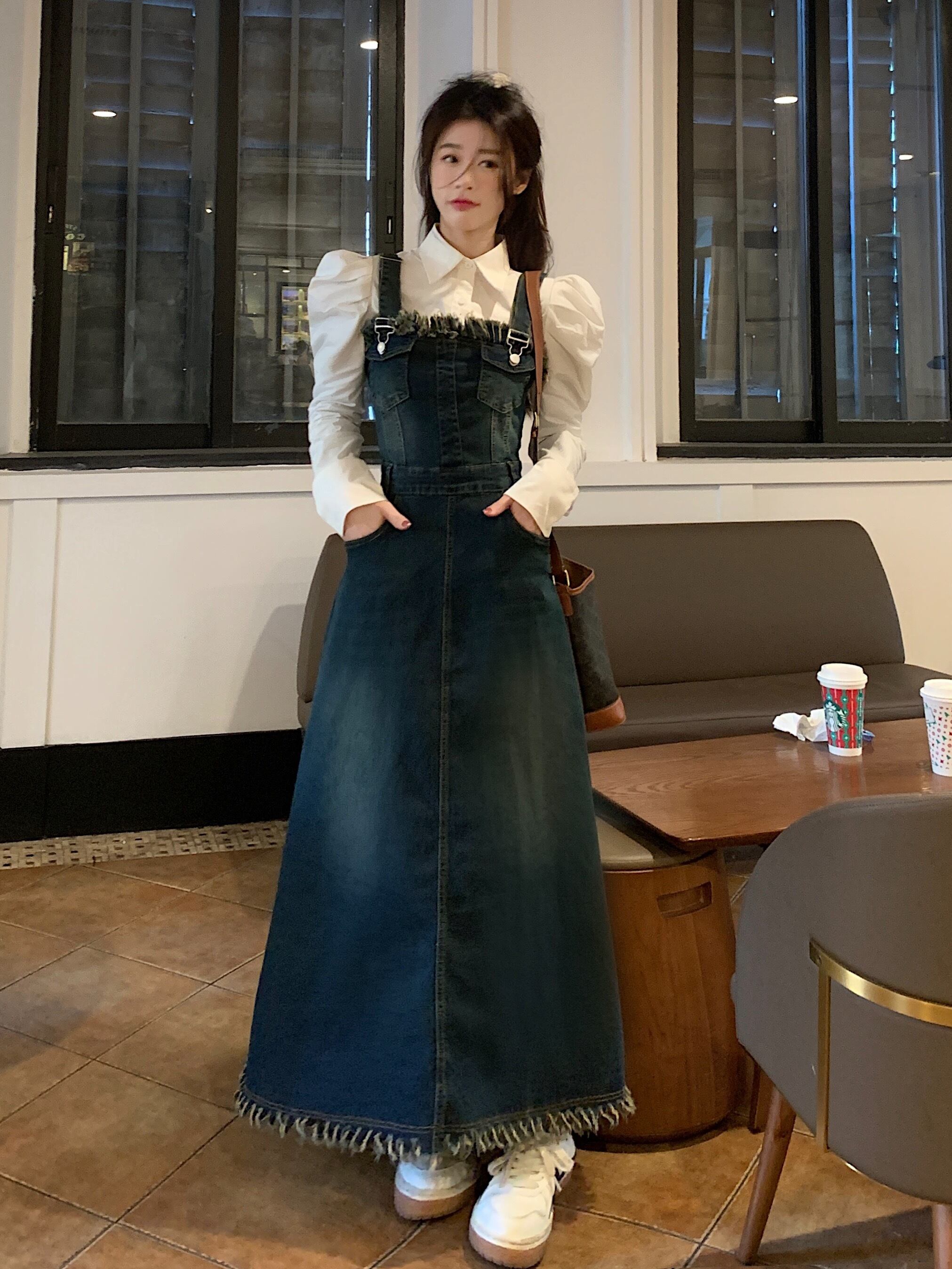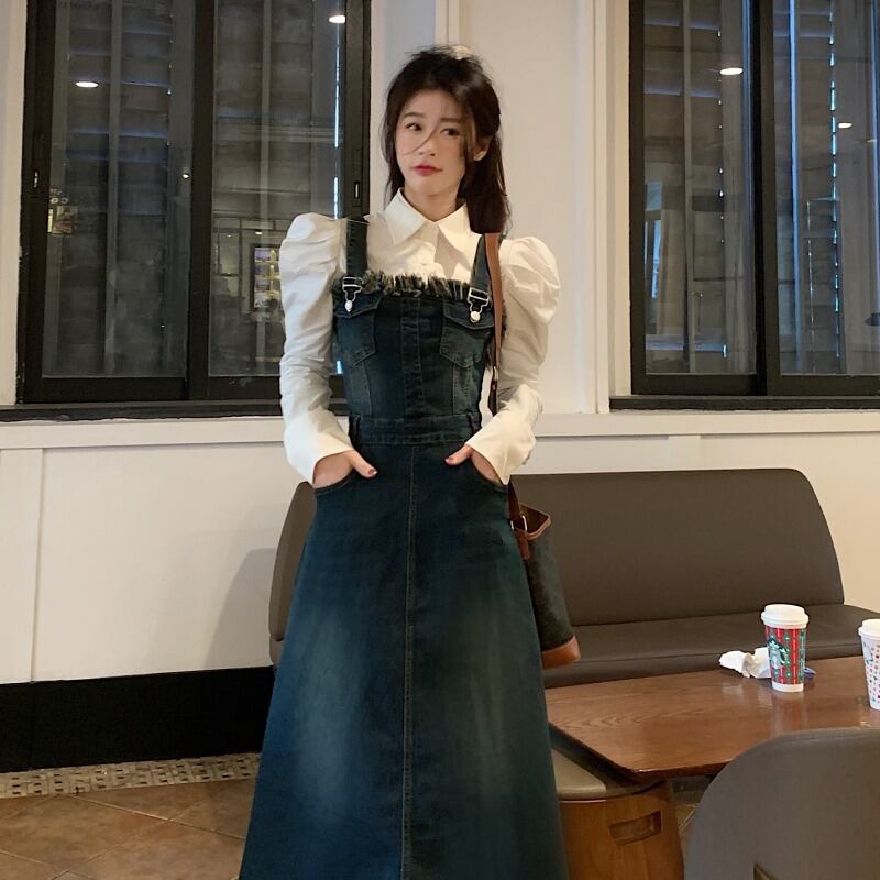 プラスサイズの婦人服 2023 ファットシスター春の新作デニムストラップドレスパフスリーブ長袖シャツ 2 点セット ロング 大きめサイズ スプリング 春物 8884176380679752