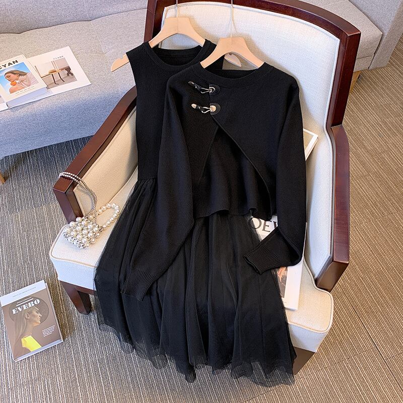 大きいサイズの婦人服 2023 春の新しいファット シスター不規則なブラウス メッシュ スプライシング ドレス ツーピース スーツ 大きめサイズ スプリング 春物 8884144748184145