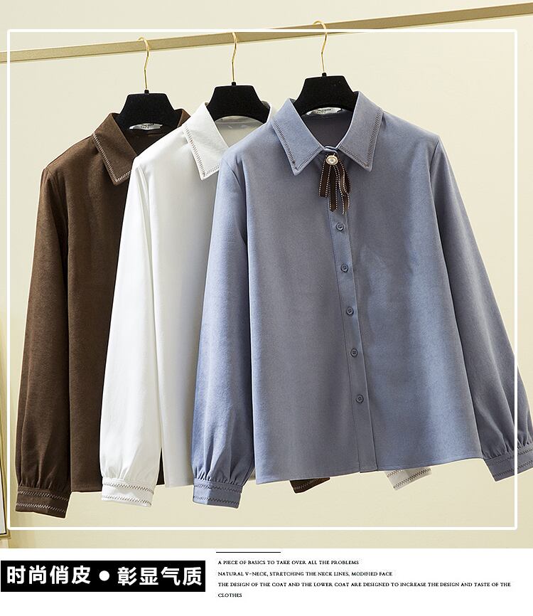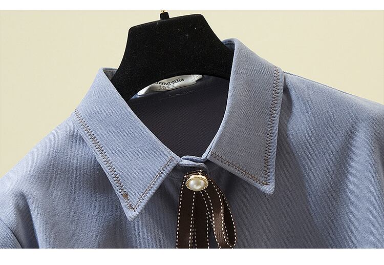 プラスサイズの婦人服 2023 ファットシスター春の新しいコントラストカラーヘリンボーン蝶ネクタイ痩身オールマッチ長袖シャツ ロング リボン 大きめサイズ スプリング 春物 8884191345494599