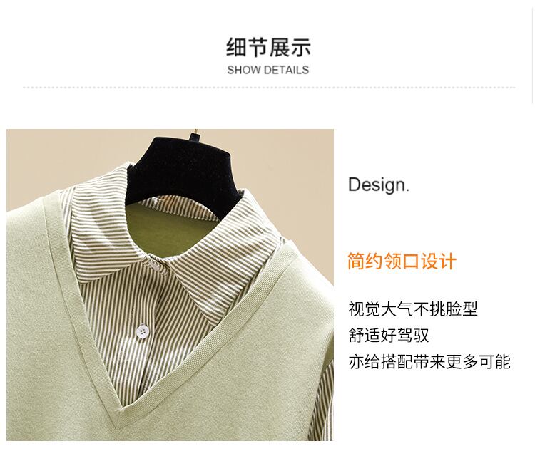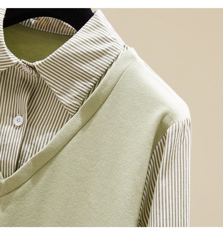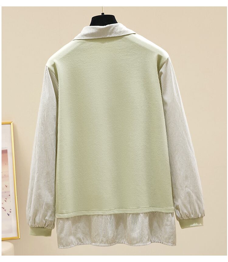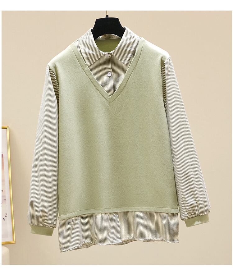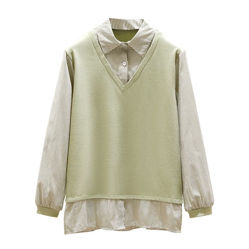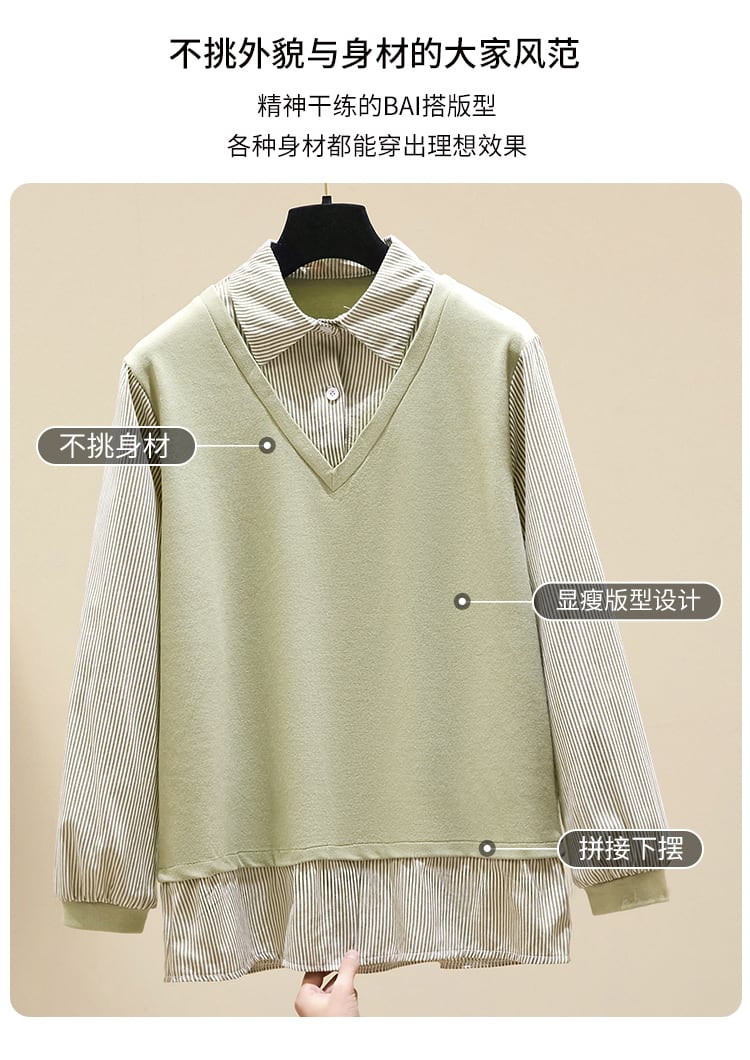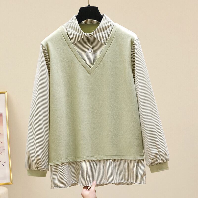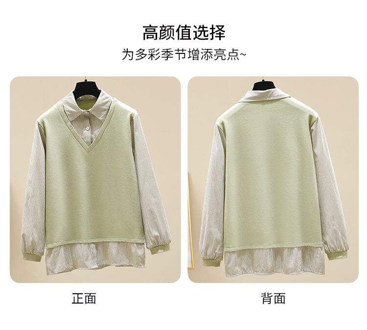 プラスサイズの婦人服 2023 ファットシスター春の新フェイクツーピースプルオーバーセーターストライプシャツ襟長袖トップ ロング 大きめサイズ スプリング 春物 8884153938688346