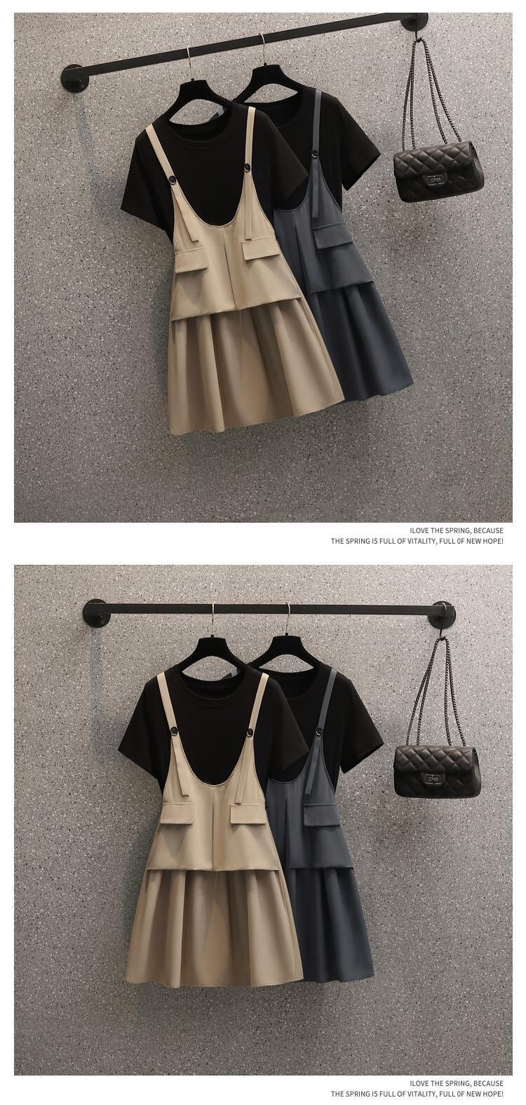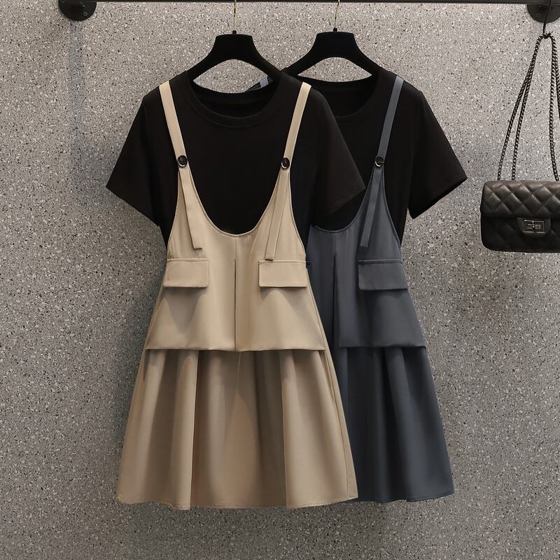 プラスサイズの婦人服 2023 ファットシスター夏の新しいファッションの年齢の減少と薄い偽のツーピース半袖ラウンドネックのドレスの女性 大きめサイズ サマー 夏物 Oネック 8884132520205953
