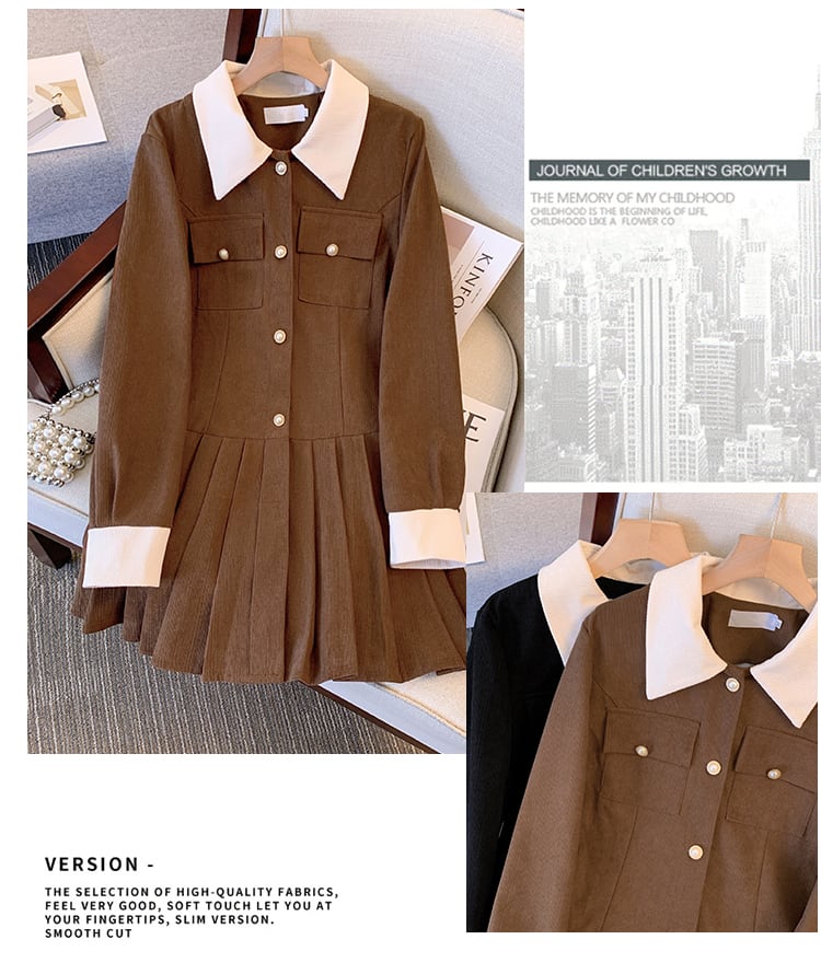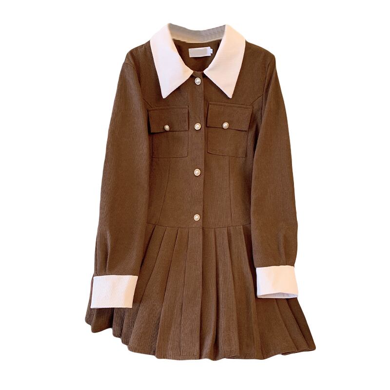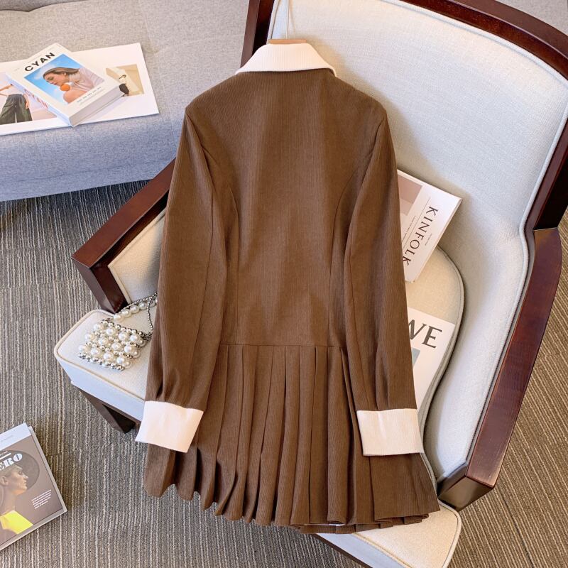 プラスサイズの婦人服 2023 ファットシスター春の新しいフレンチスタイルのレトロな色のコントラストステッチコーデュロイプリーツドレス 大きめサイズ スプリング 春物 8884160714685165