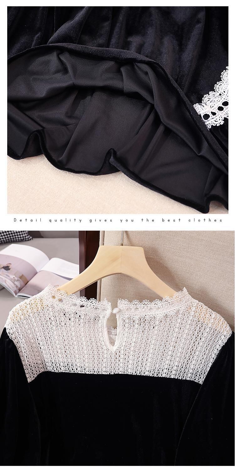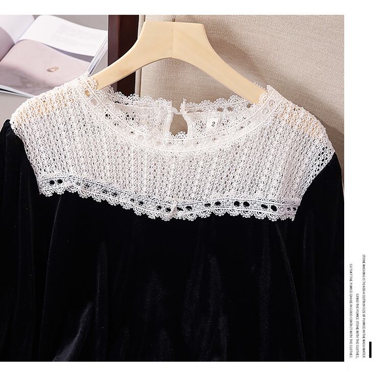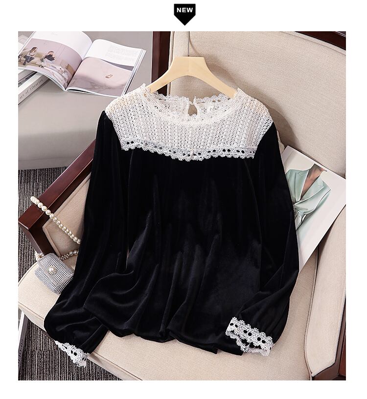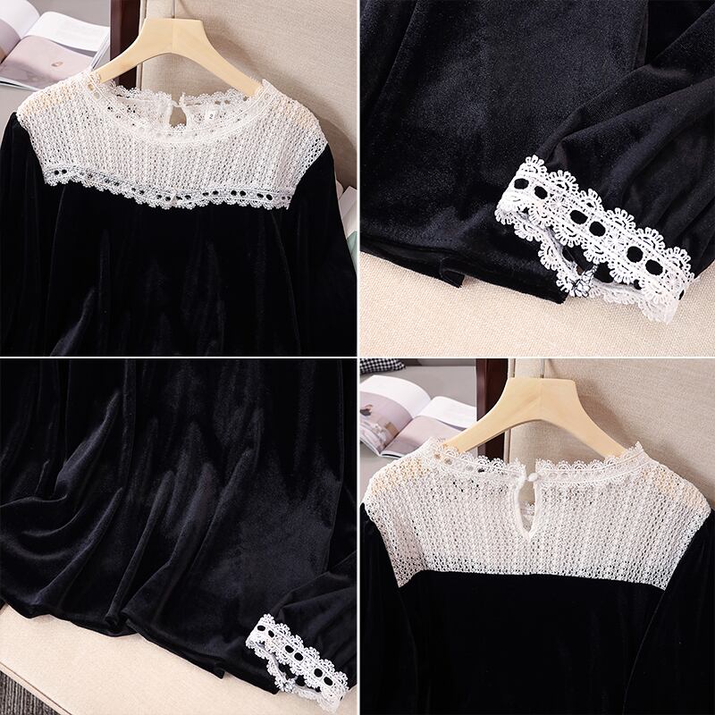 プラスサイズの婦人服 2023 トレンディな女性の春の新脂肪姉妹レースステッチベルベットカバー腹痩身オールマッチシャツ女性 大きめサイズ スプリング 春物 8884188659059766