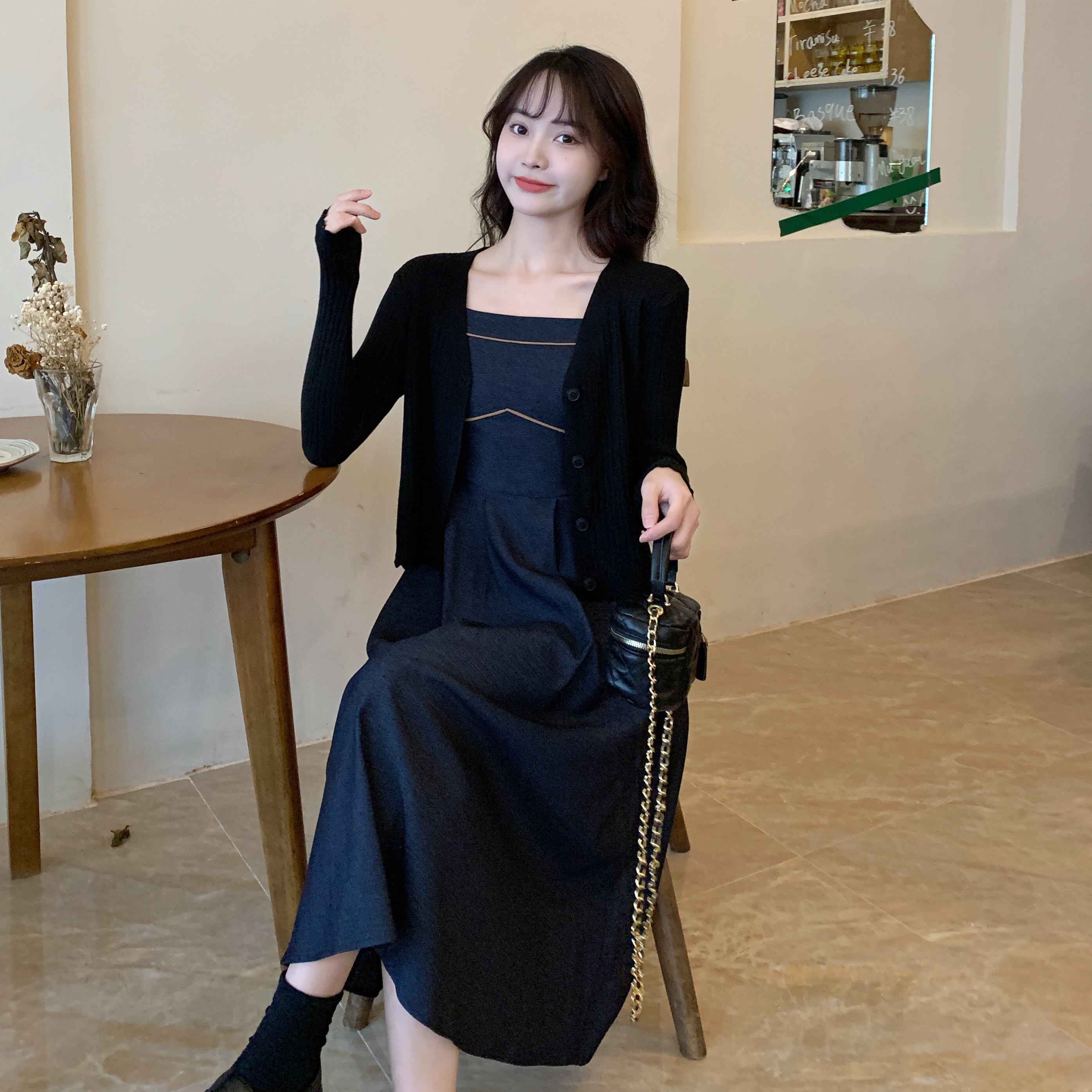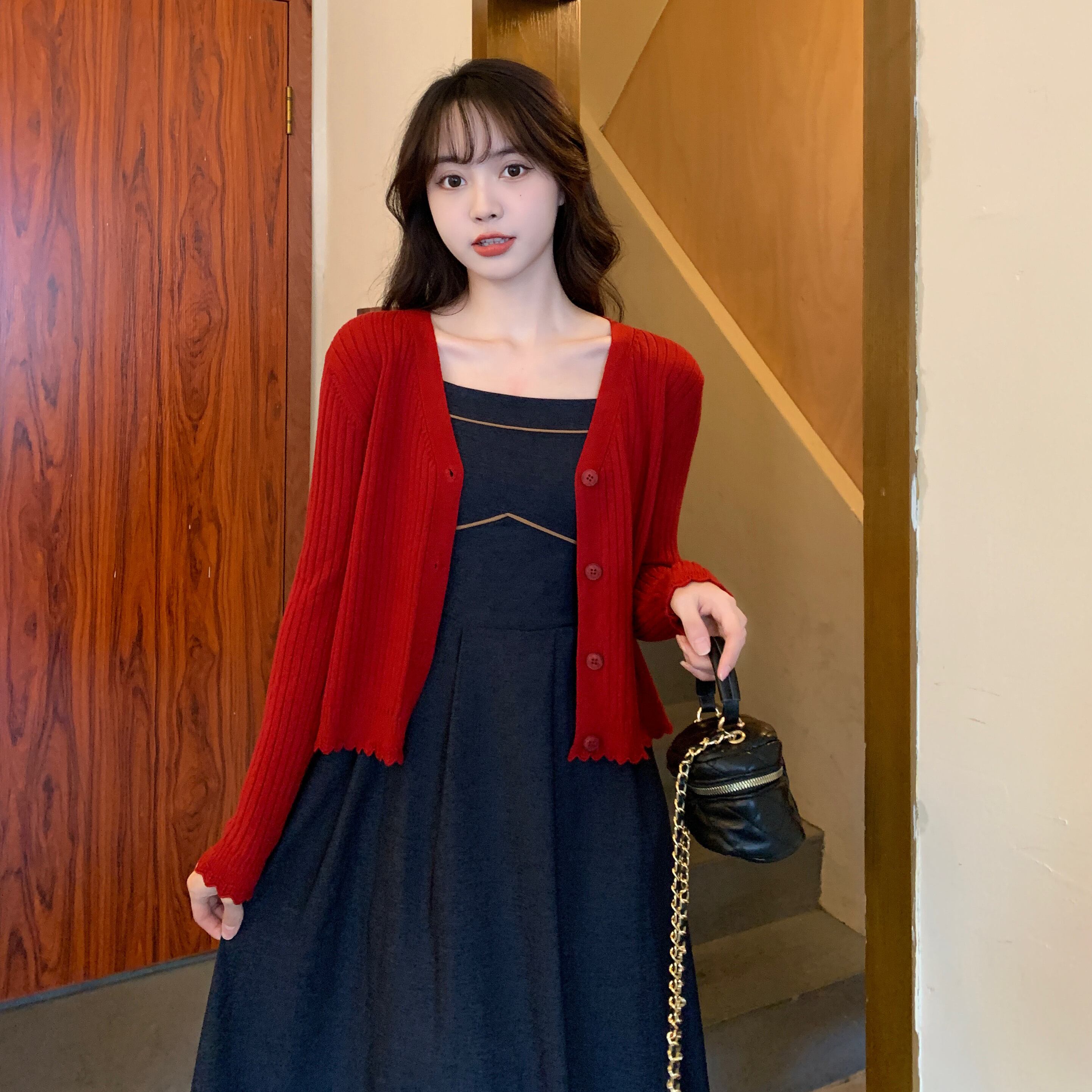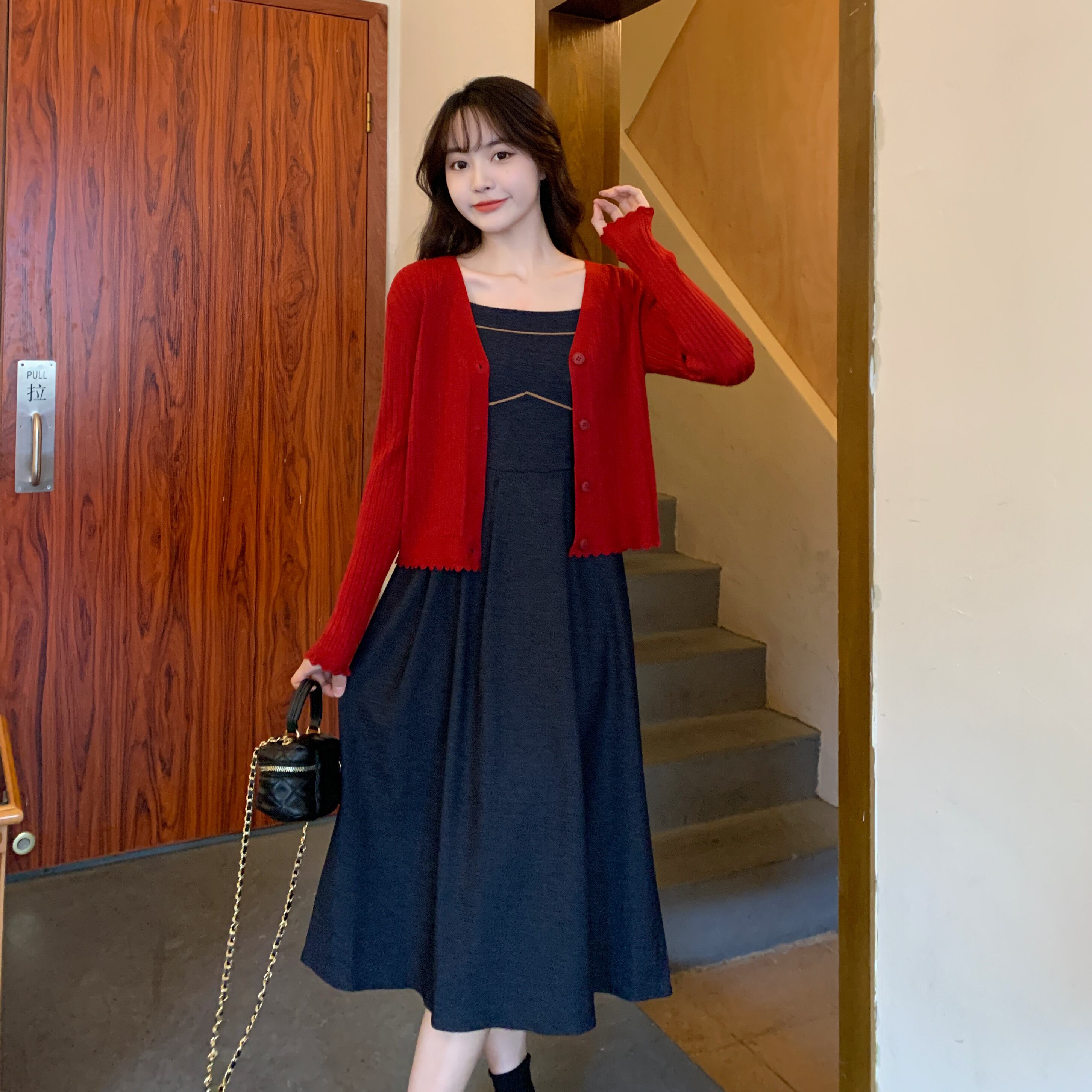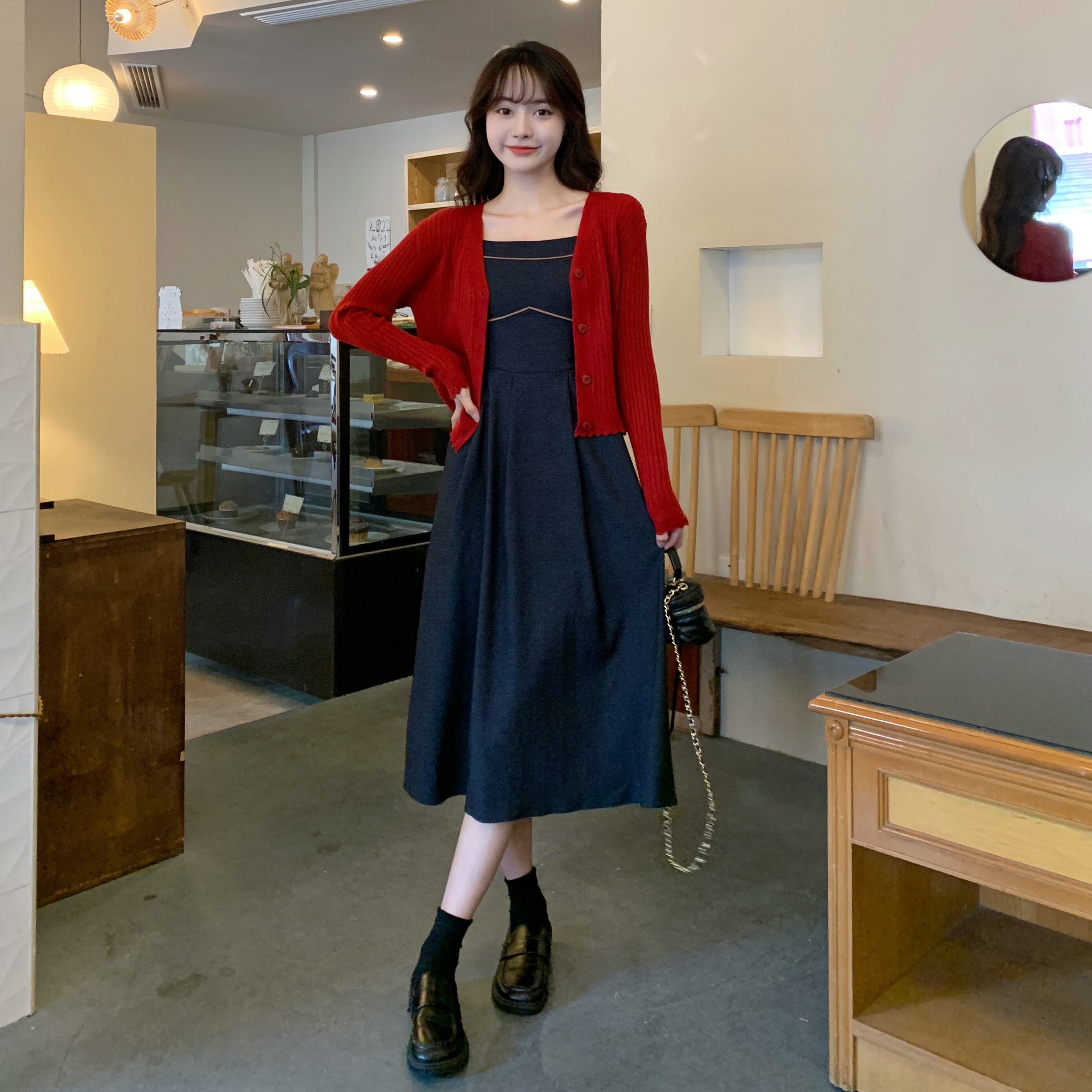 色:デニムブルーサスペンダー,カーマインカーディガン,ブラックカーディガン
