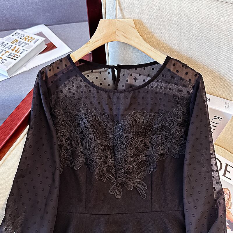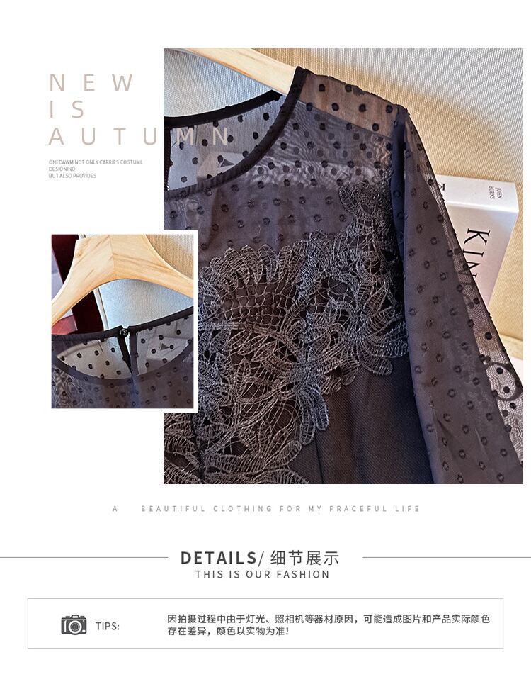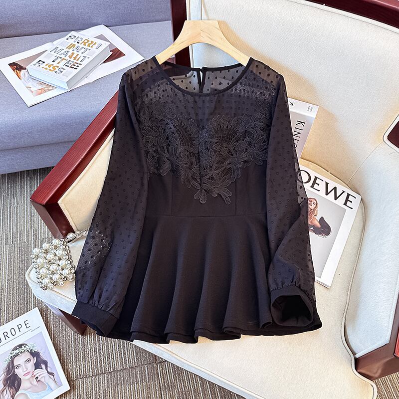 大きいサイズの婦人服 2023 春服脂肪姉妹新しいレース シフォン スプライシング レシーバー ウエスト痩身ポルカ ドット ラウンド ネック トップ 大きめサイズ スプリング 春物 Oネック 8884161200013441