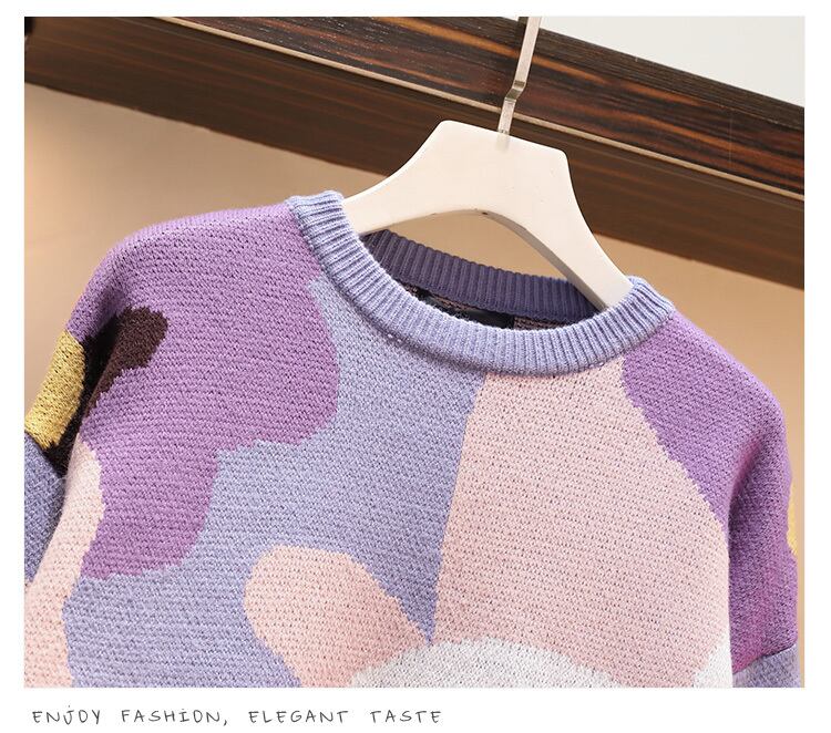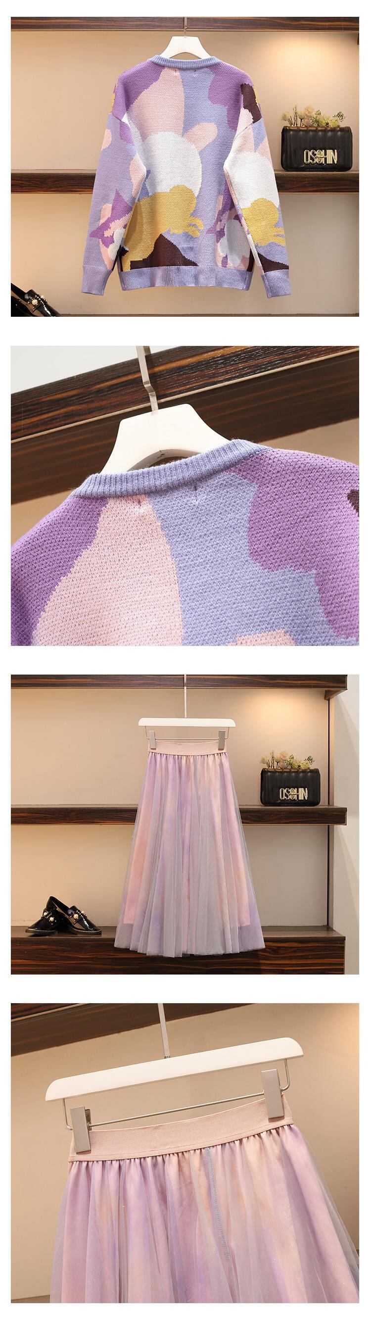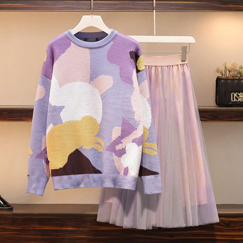 大きいサイズの婦人服 2023 春服ファットシスターズ新しいゆるい配色ニットセーターメッシュスカート 2 点セット 大きめサイズ スプリング 春物 8884153401053356
