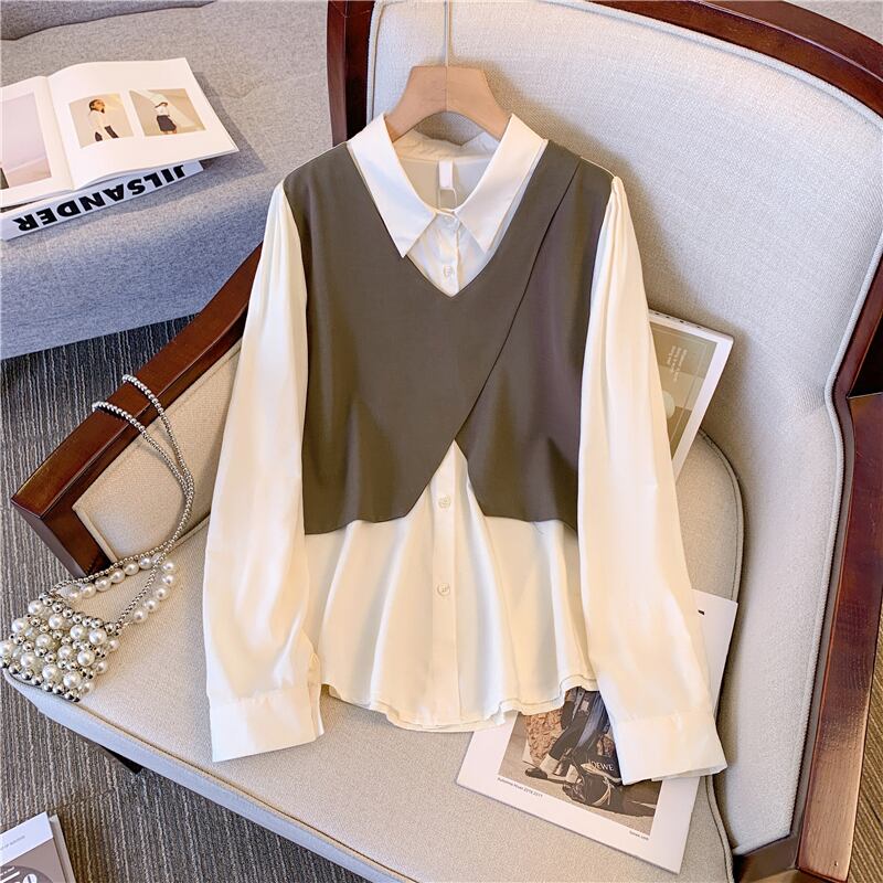 大きいサイズの婦人服 2023 春の新しいファット シスター ファッション シックなデザイン センス フェイク ツーピース オールマッチ長袖シャツ ロング 大きめサイズ スプリング 春物 8884178679287157