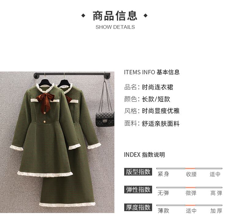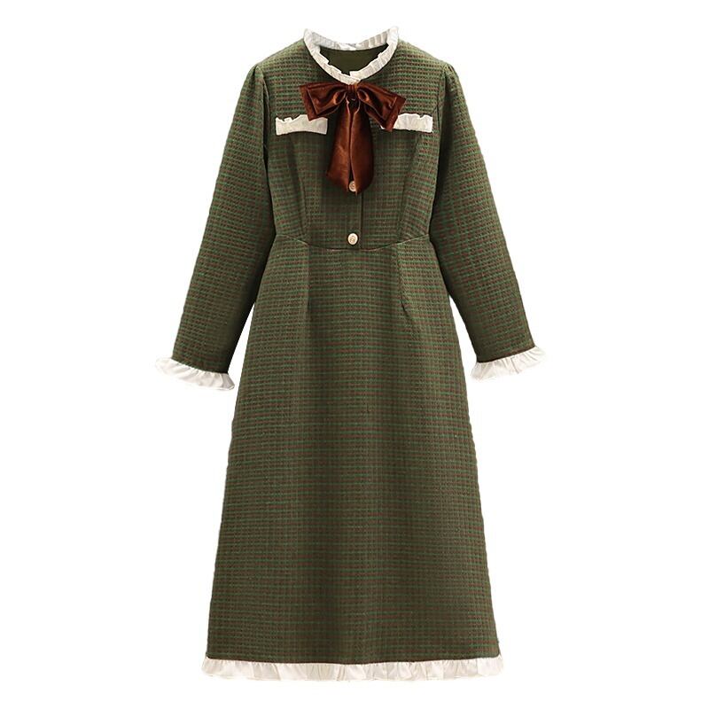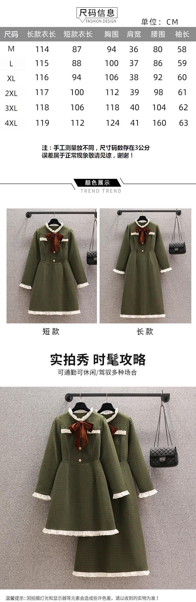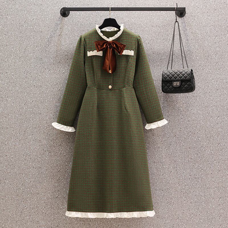 プラスサイズの婦人服 2023 春の新しいファットシスターウエスト痩身ちょう結びレトロチェック柄ツイードドレス リボン 大きめサイズ スプリング 春物 8884132956885728