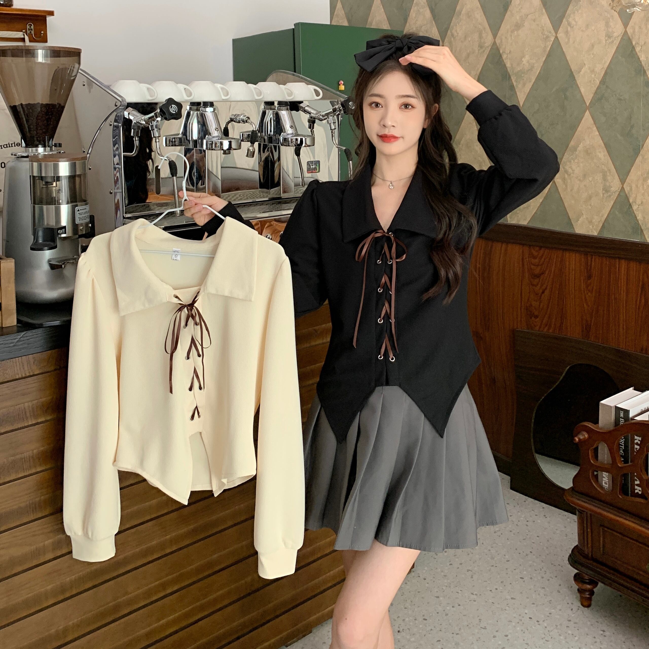 大きいサイズの婦人服 2023 春服脂肪姉妹新ポルプ襟ストラップデザイン長袖シャツカバーリング肉小さなシャツ女性 ロング 大きめサイズ スプリング 春物 8884167145650508
