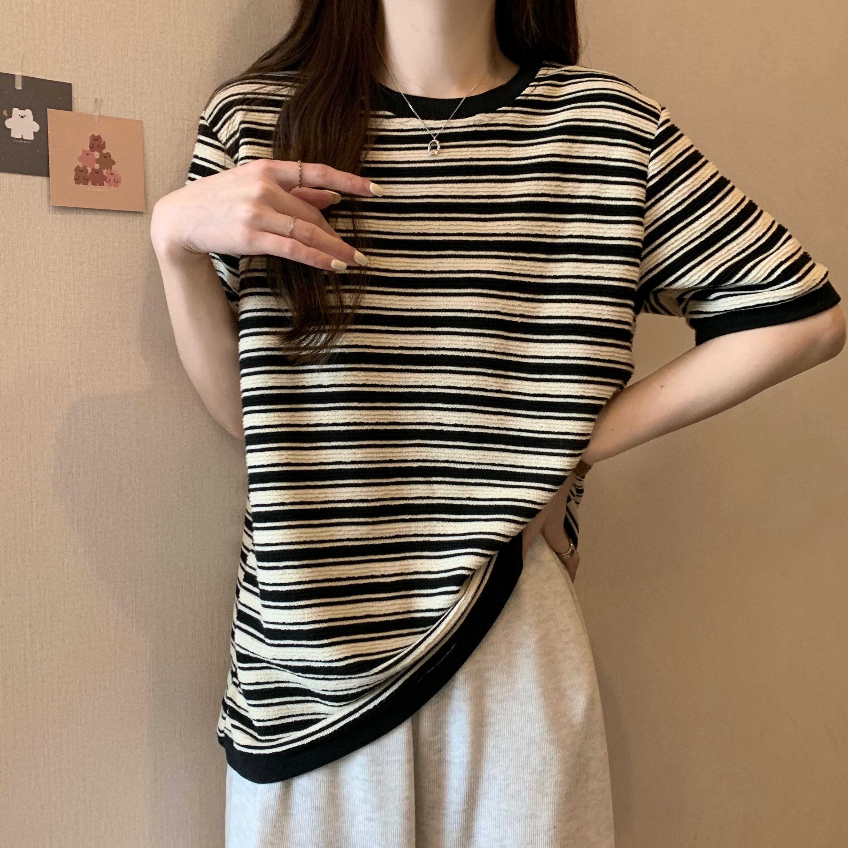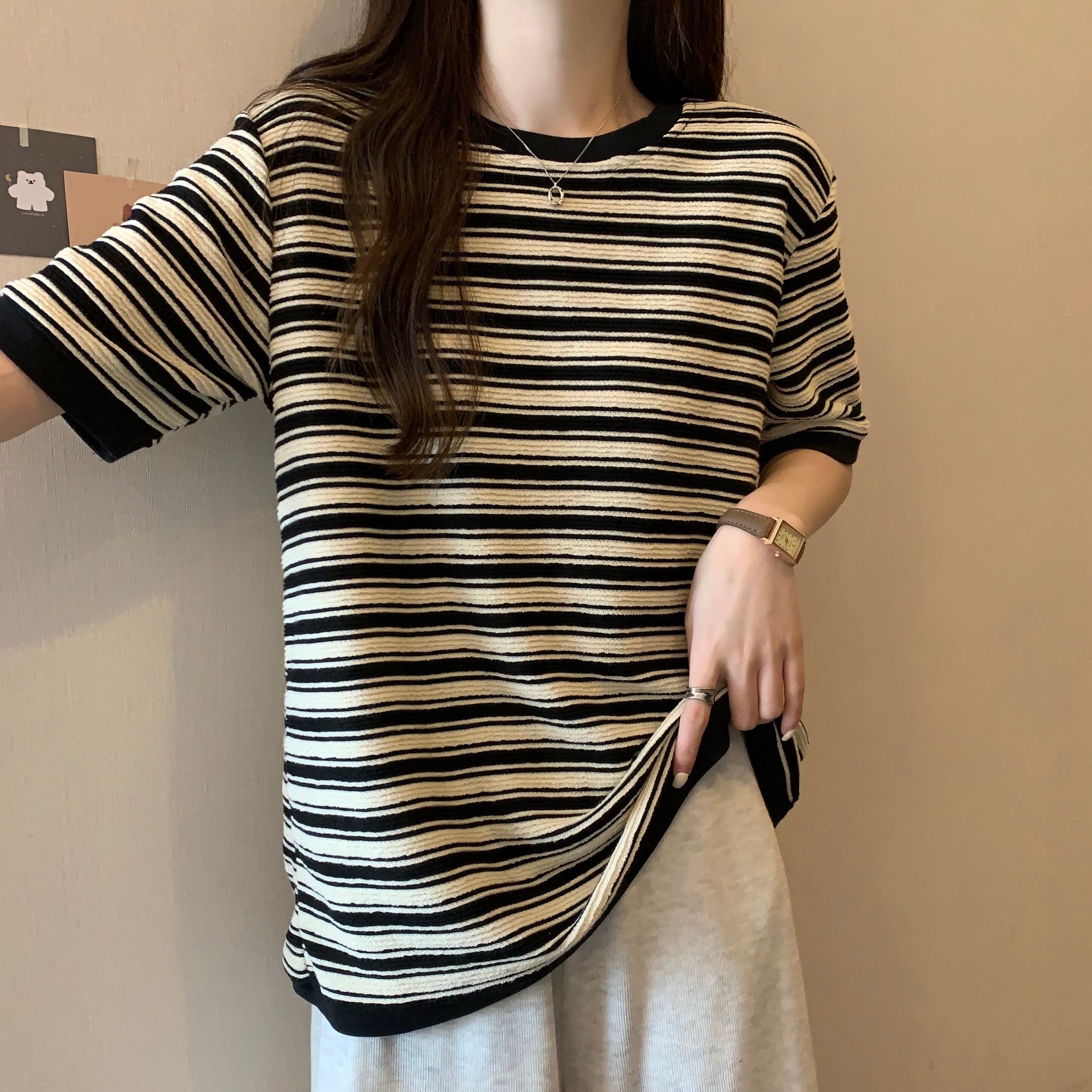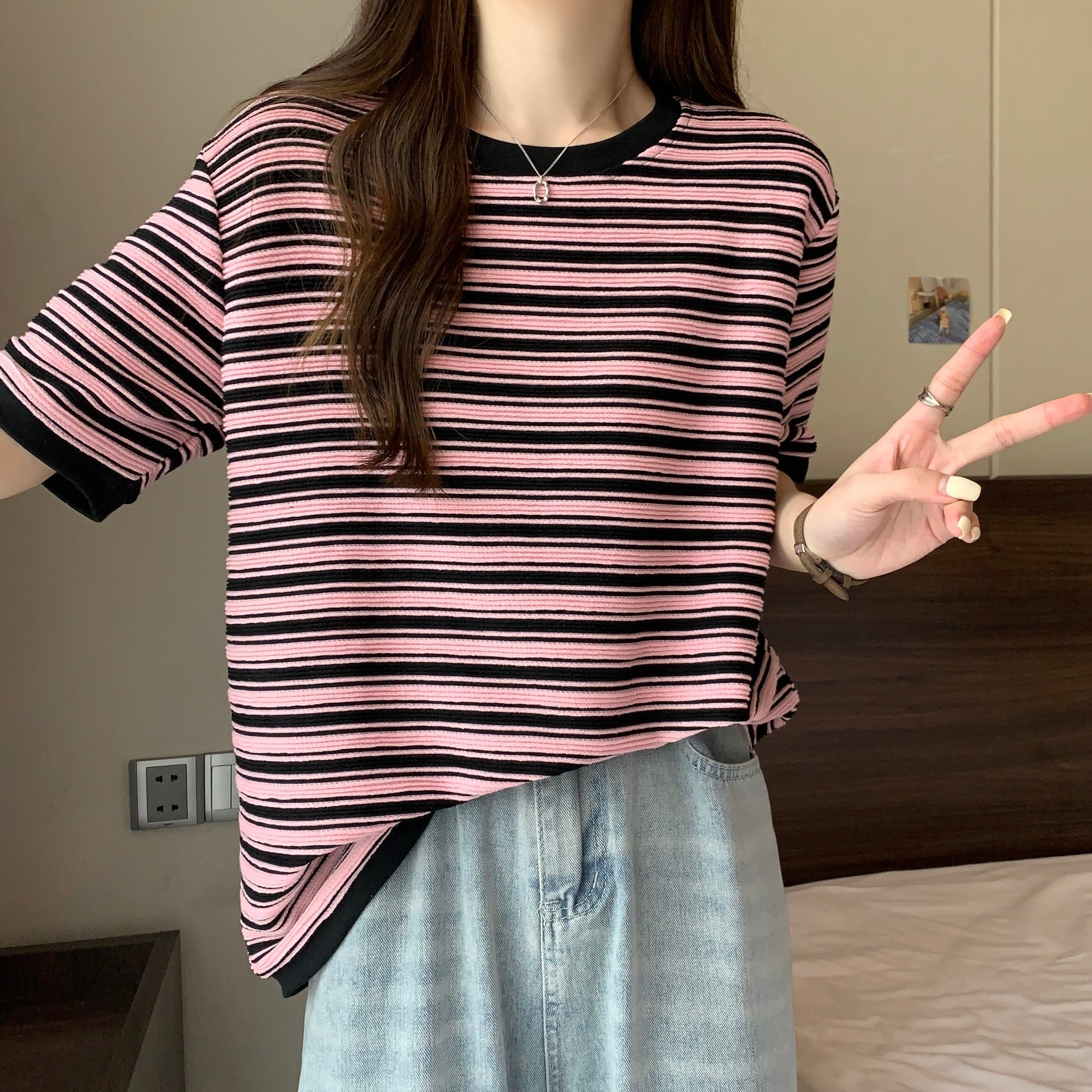 プラスサイズの婦人服2023ファットシスター夏の新しいファッション立体ストライプトップルーズで薄い半袖Tシャツ 大きめサイズ サマー 夏物 8884178929190957