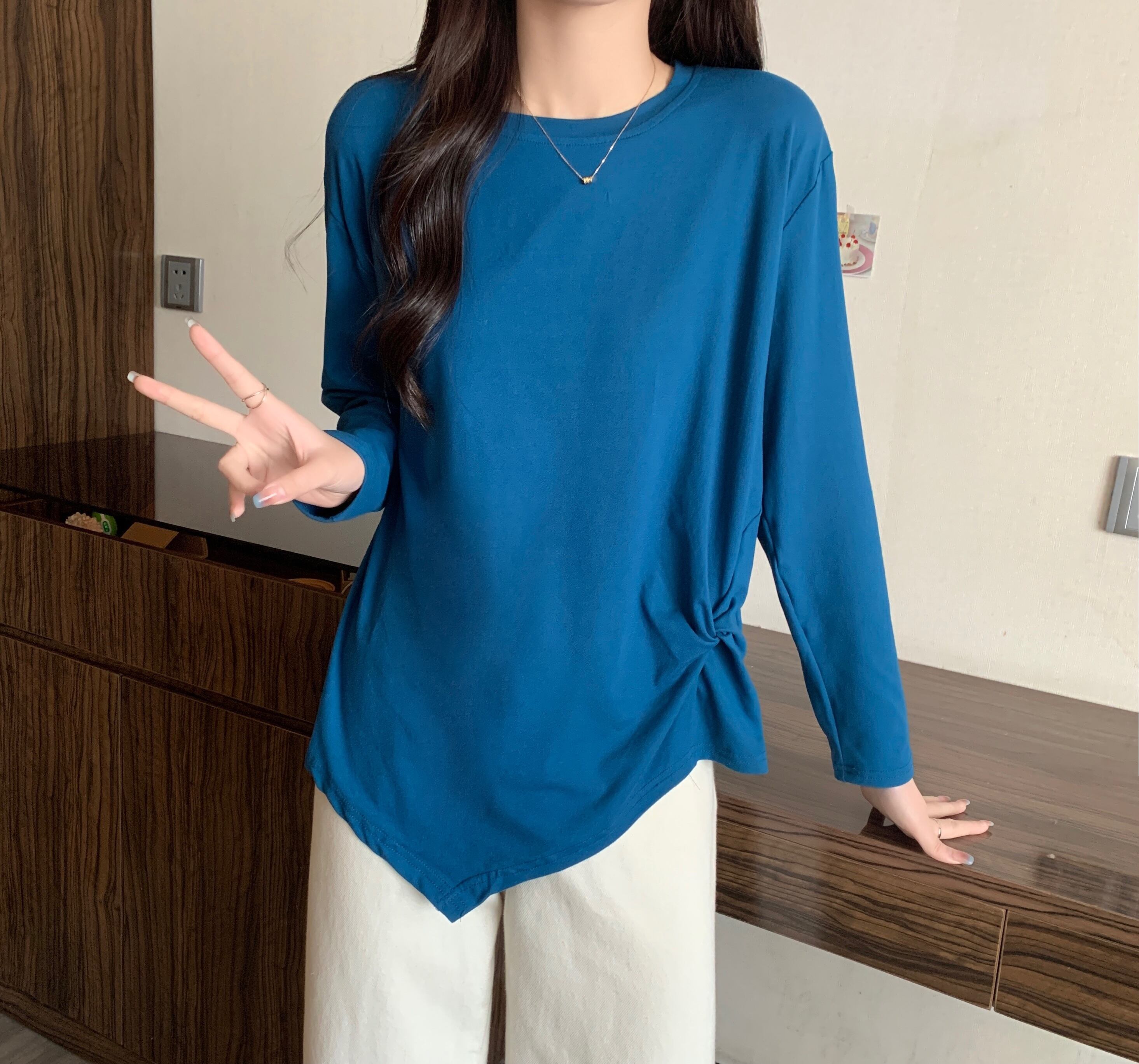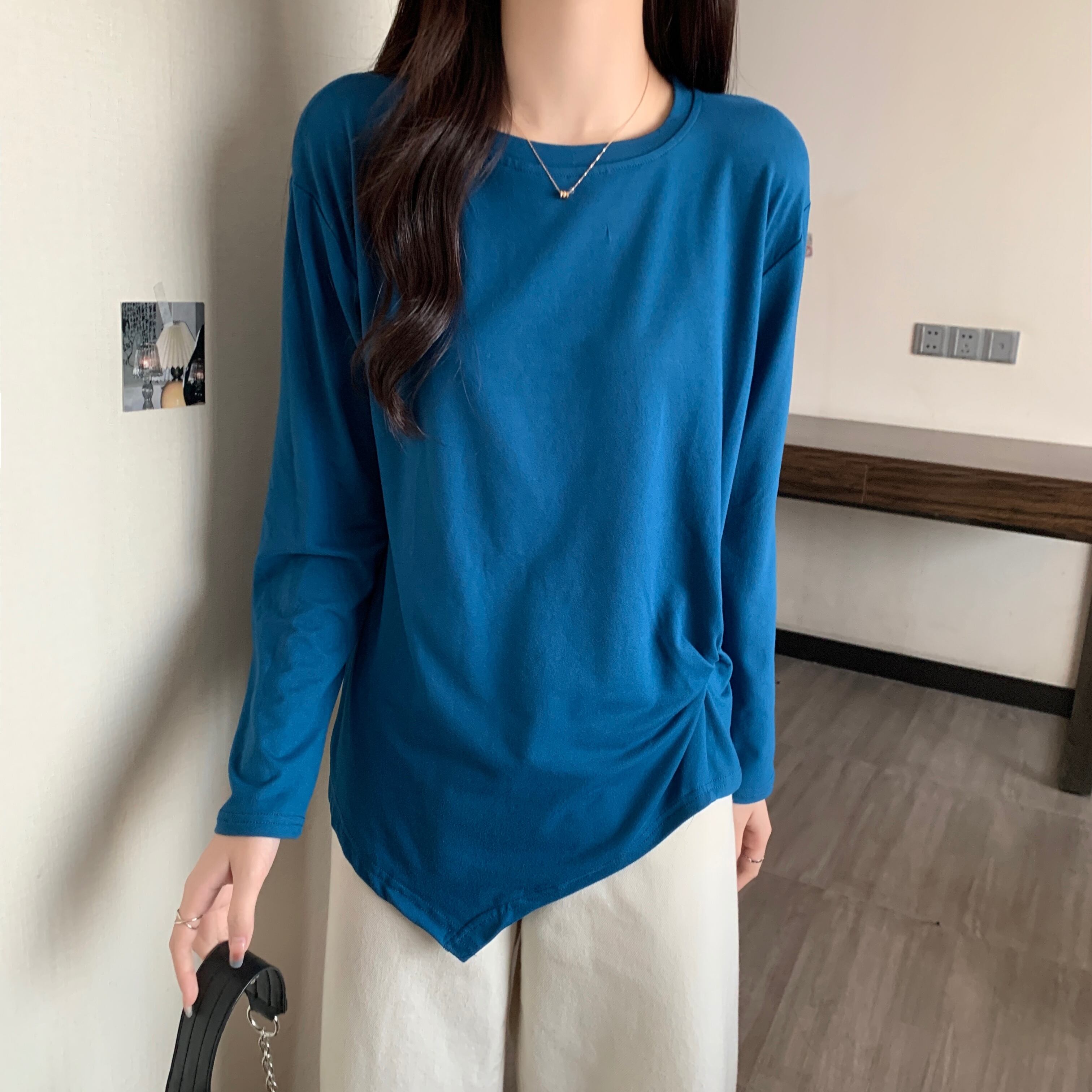 大きいサイズの婦人服 2023 春の新しいファット シスター弾性オールマッチ不規則な無地長袖ラウンド ネック Tシャツ女性 ロング エラスティック 伸縮 大きめサイズ スプリング 春物 Oネック ソリッドカラー 888412122026506