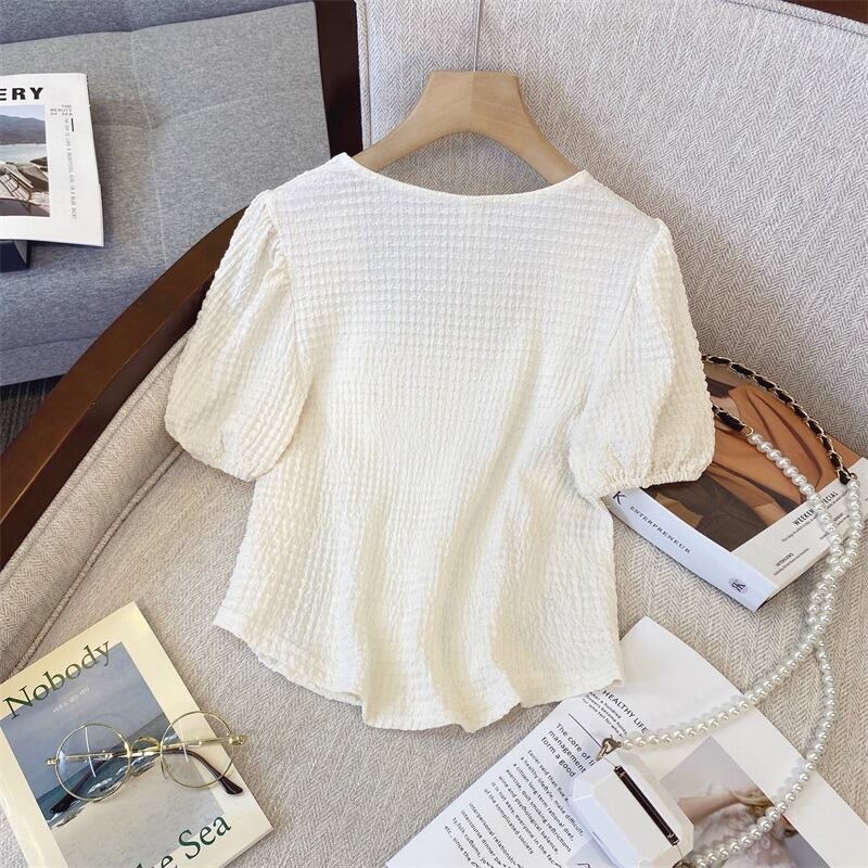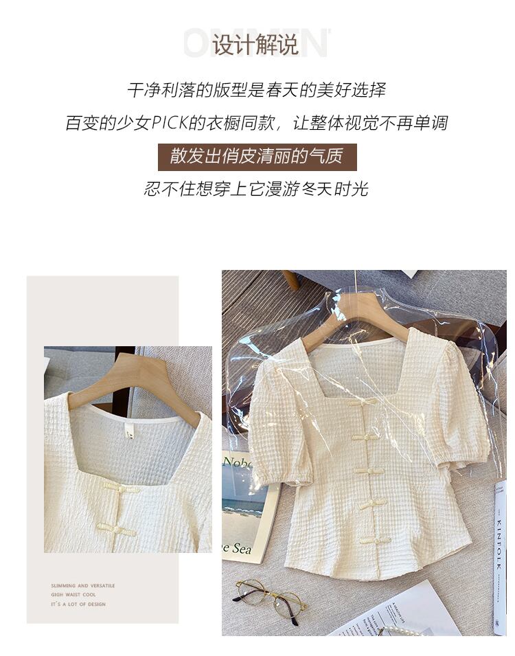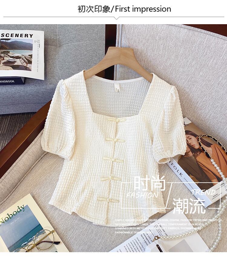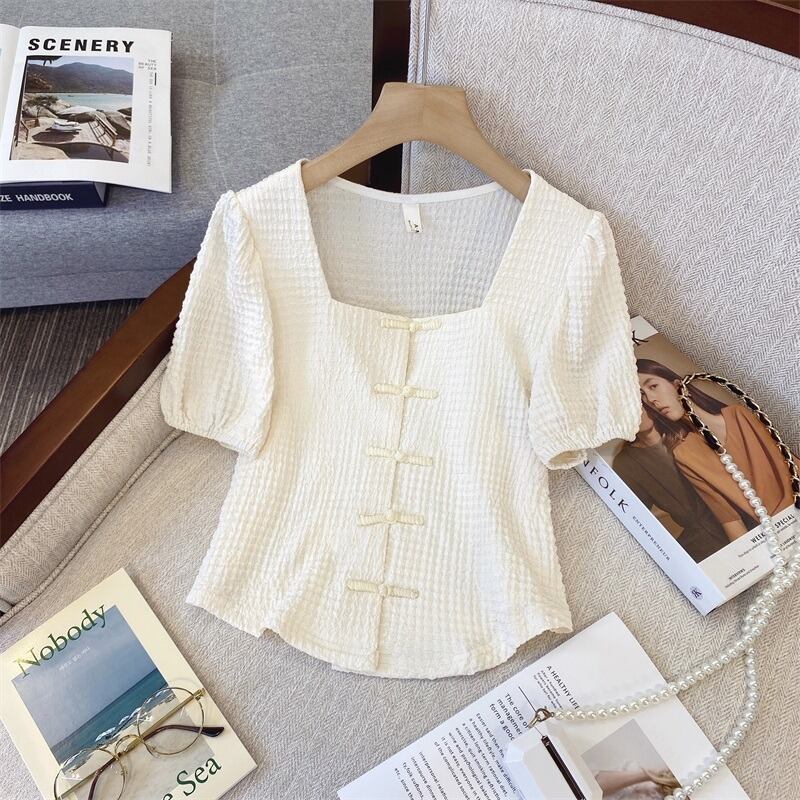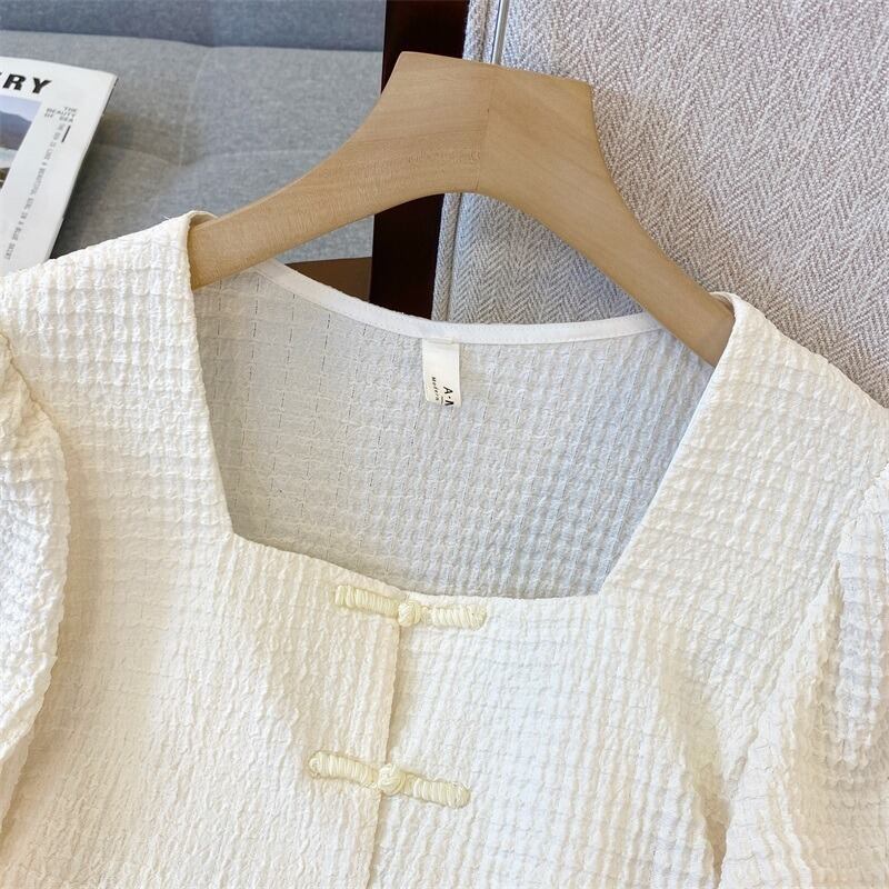プラスサイズの婦人服 2023 トレンディな女性の夏の新しいファットシスターデザインセンスレトロバックルショートスクエアカラー半袖シャツ女性 大きめサイズ サマー 夏物 スクウェア 8884135732743419