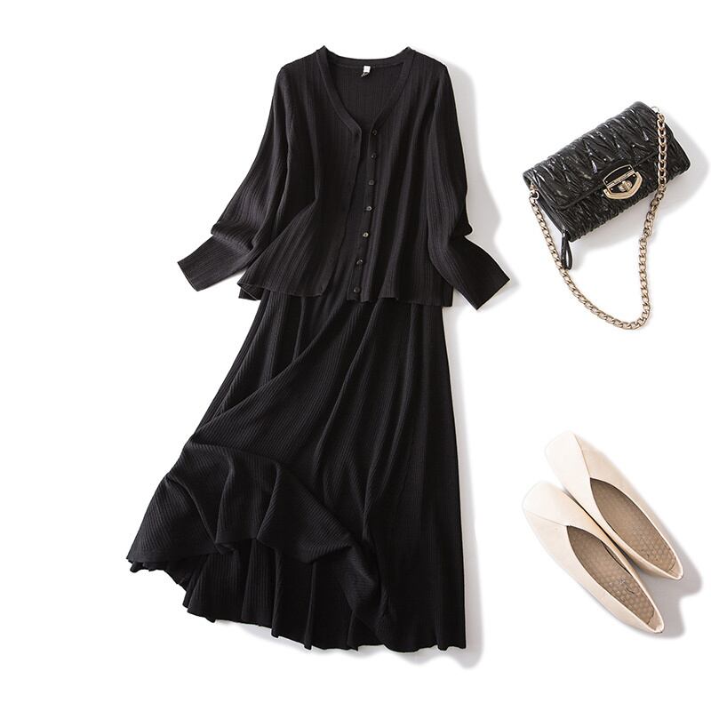 大きいサイズの婦人服 2023 春服ファットシスターズ新気質年齢引き締めニットカーディガン痩身サスペンダースカート 2 点セット 大きめサイズ スプリング 春物 8884144811266873