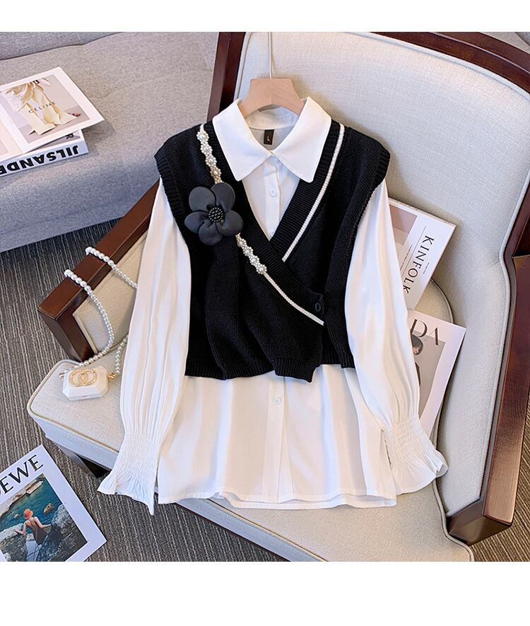 プラスサイズの婦人服 2023 脂肪姉妹春の新ファッション痩身重工業ビーズ v ネックベストシャツ 2 点セット 大きめサイズ スプリング 春物 Vネック 8884150782142371