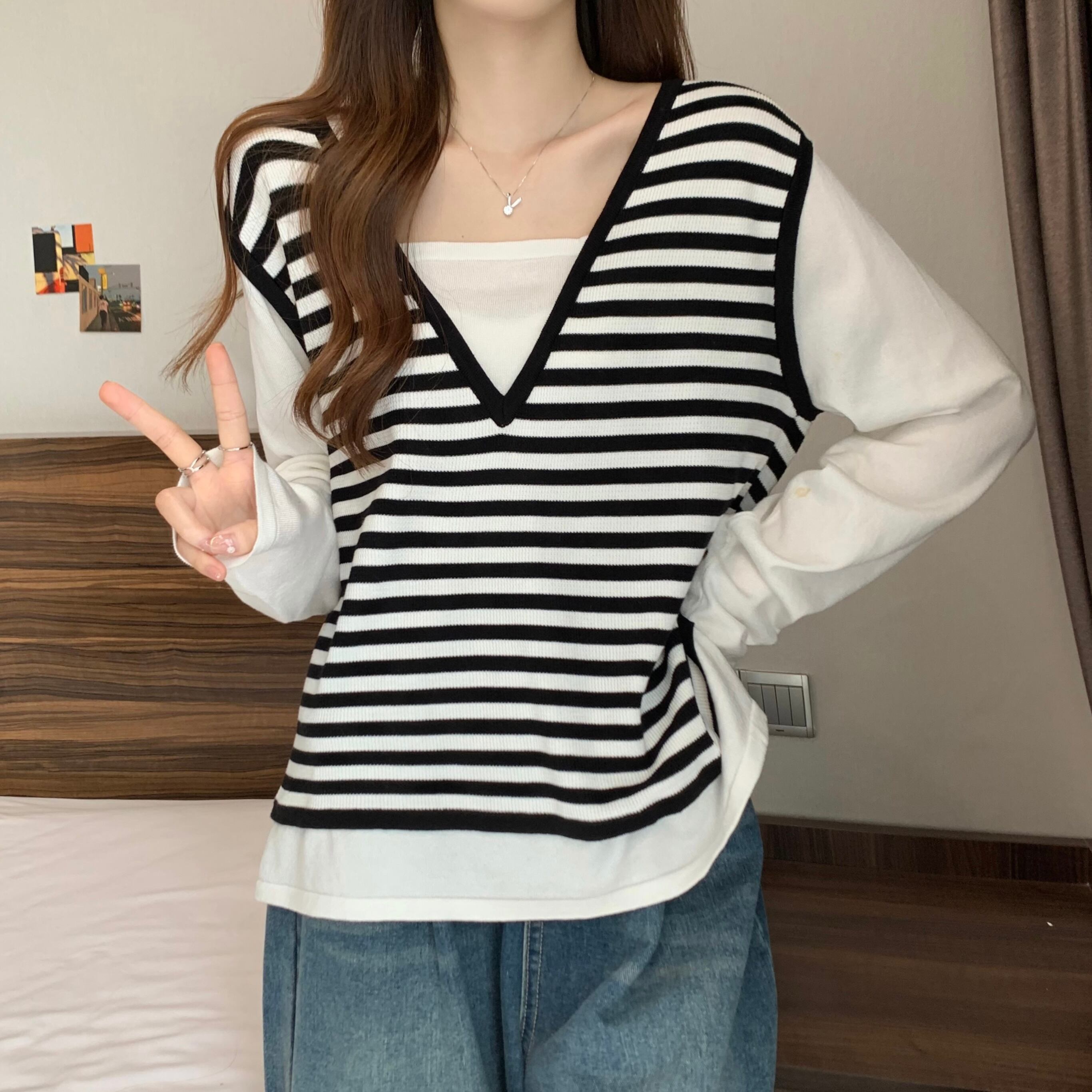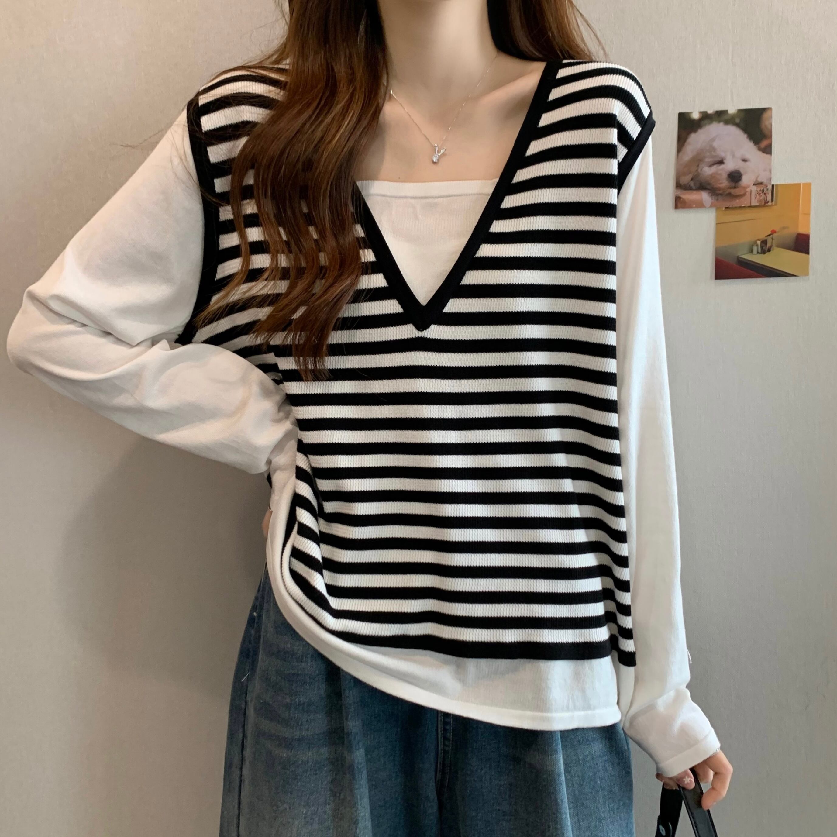 大きいサイズの婦人服 2023 トレンディな女性の春の新しい太った姉妹 V ネックの偽のツーピースのトップは薄いストライプの長袖のセーターに見えます ロング 大きめサイズ スプリング 春物 Vネック 8884113192708432