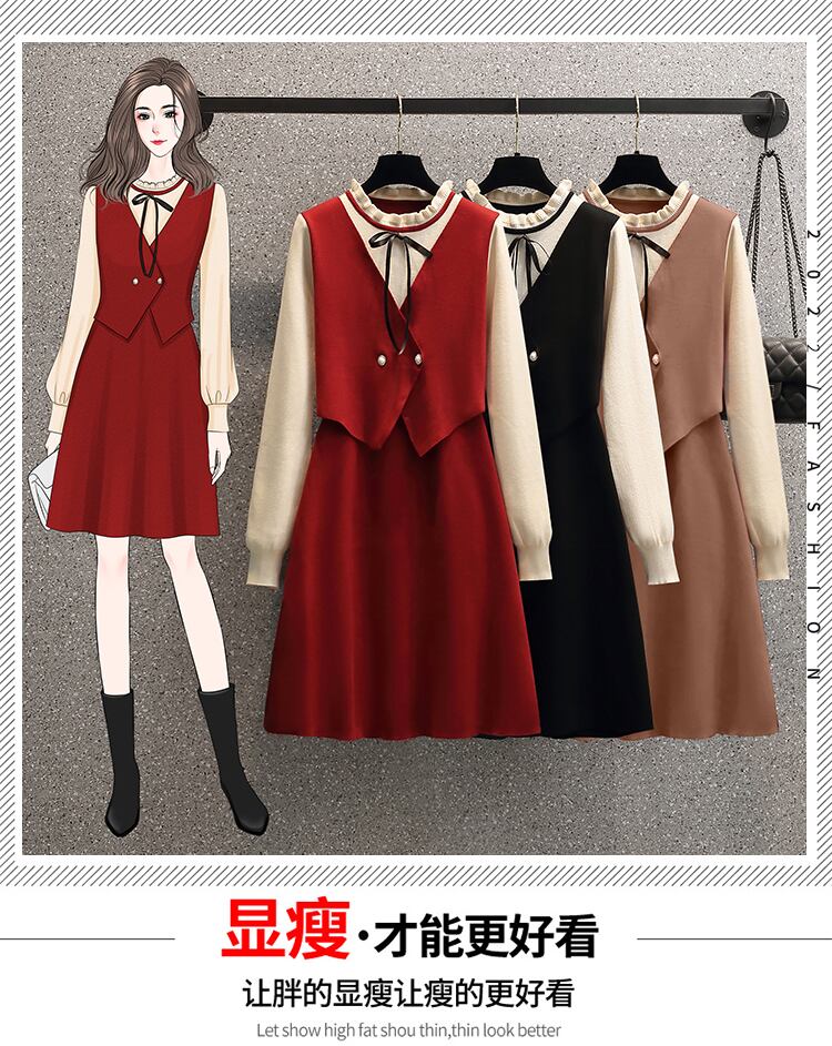 プラスサイズの婦人服 2023 太った姉妹の春の新しいフランスの偽のツーピースのニットドレスは、年齢を減らし、お腹を覆い、薄く見えます 大きめサイズ スプリング 春物 8884148210600203