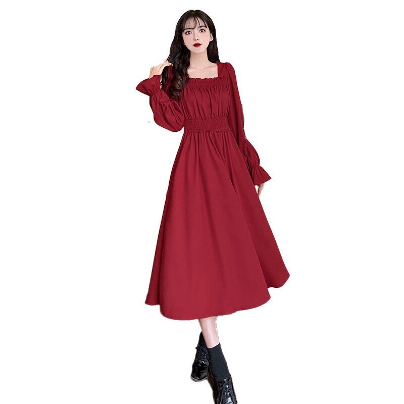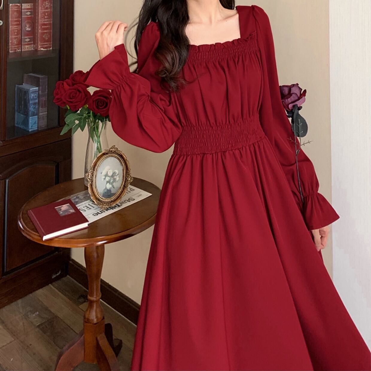 大サイズの婦人服 2023 春服脂肪姉妹新レトロ弾性赤ハイウエストスクエアカラースリムドレス女性 ハイウェスト レッド エラスティック 伸縮 大きめサイズ スプリング 春物 スクウェア 8884189591247203