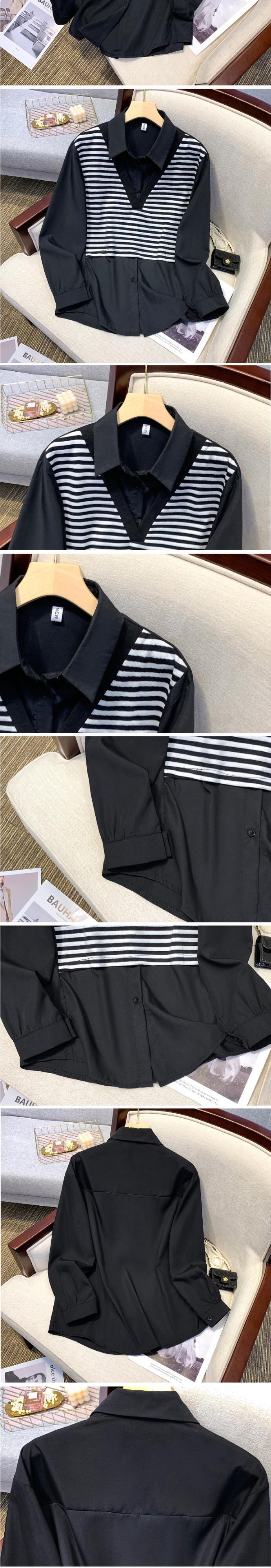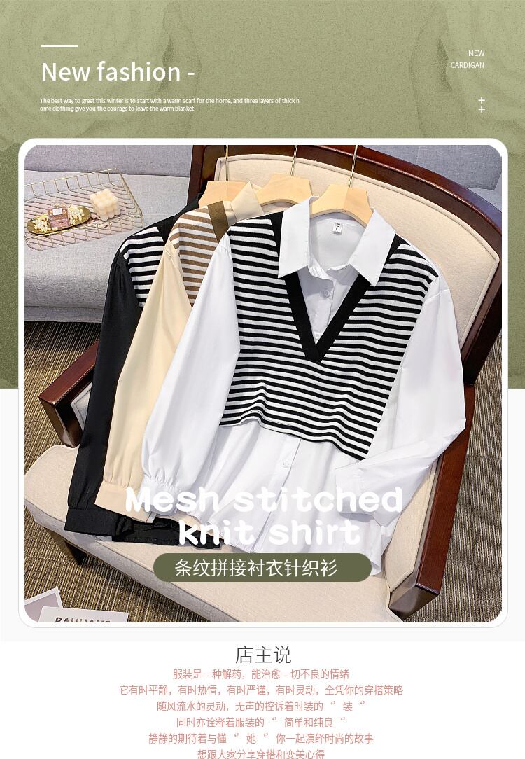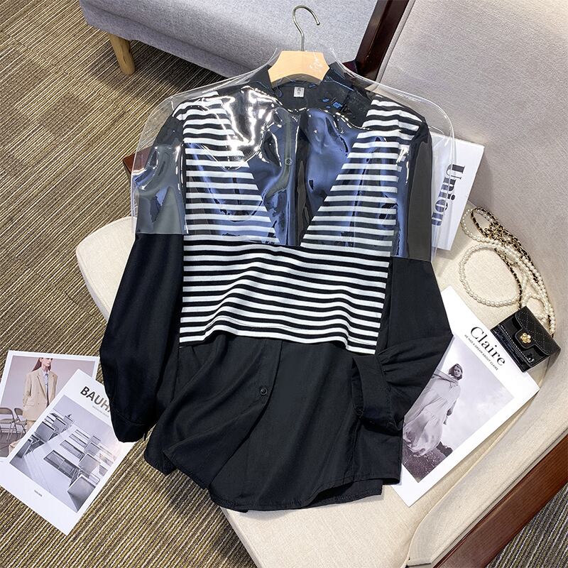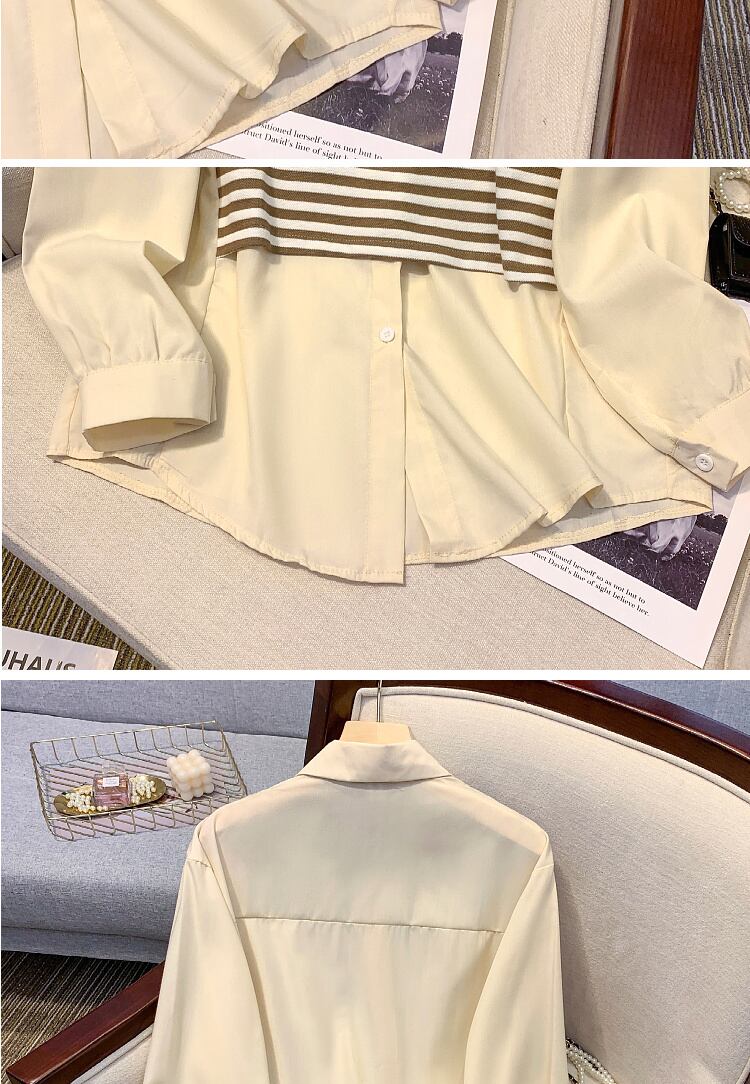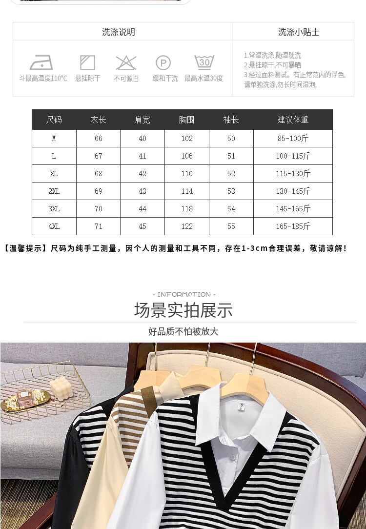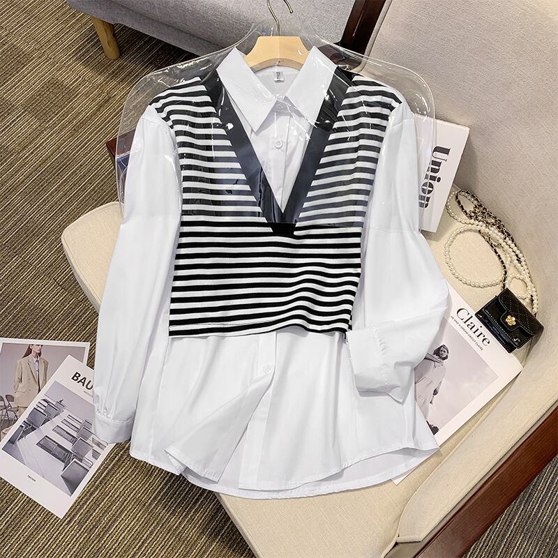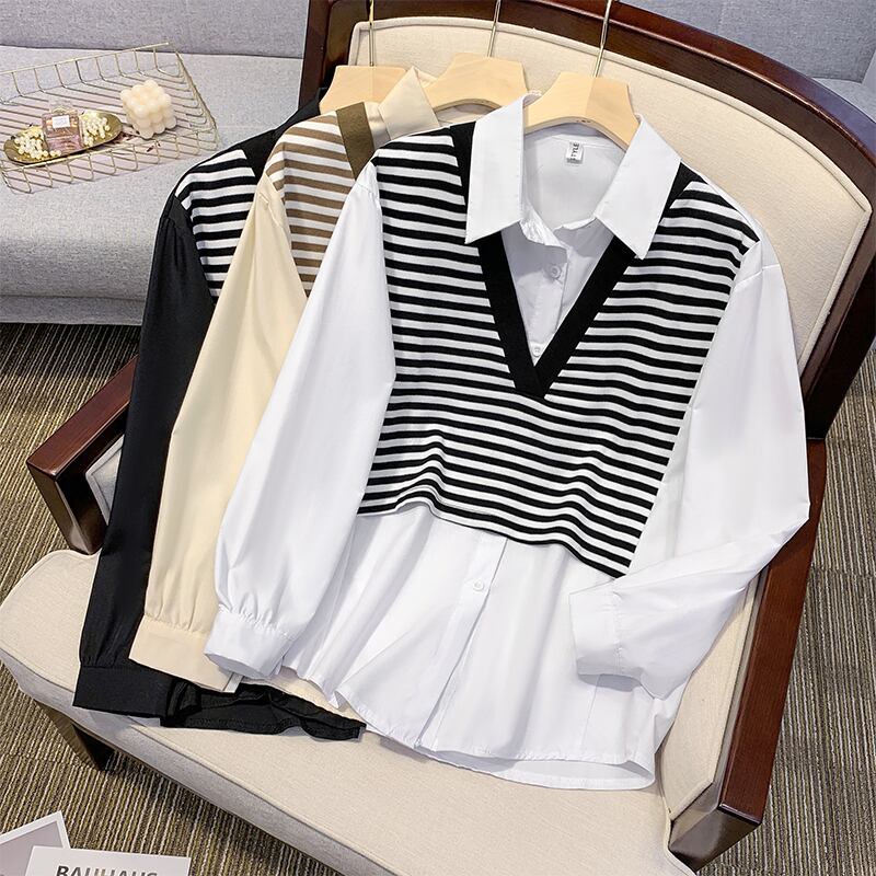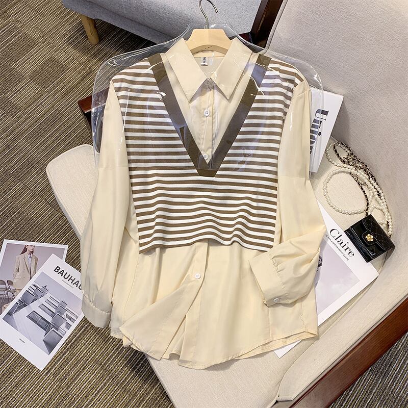 大きいサイズの婦人服 2023 春服ファットシスターズ新デザインセンスストライプステッチフェイクツーピースシャツニットトップ 大きめサイズ スプリング 春物 8884135526585544