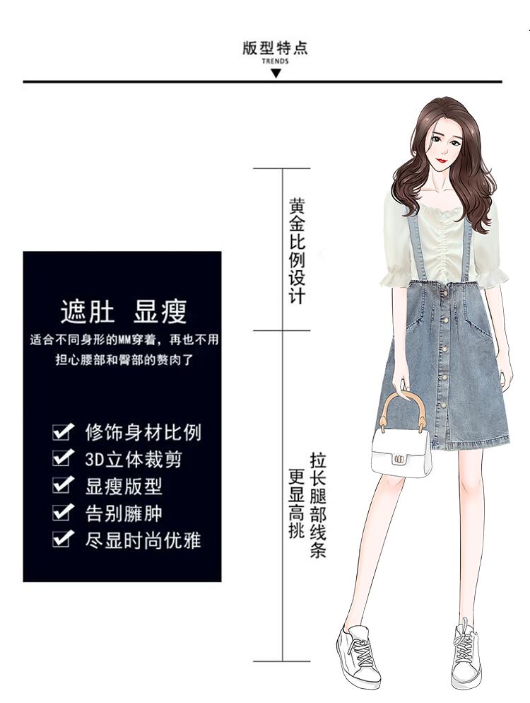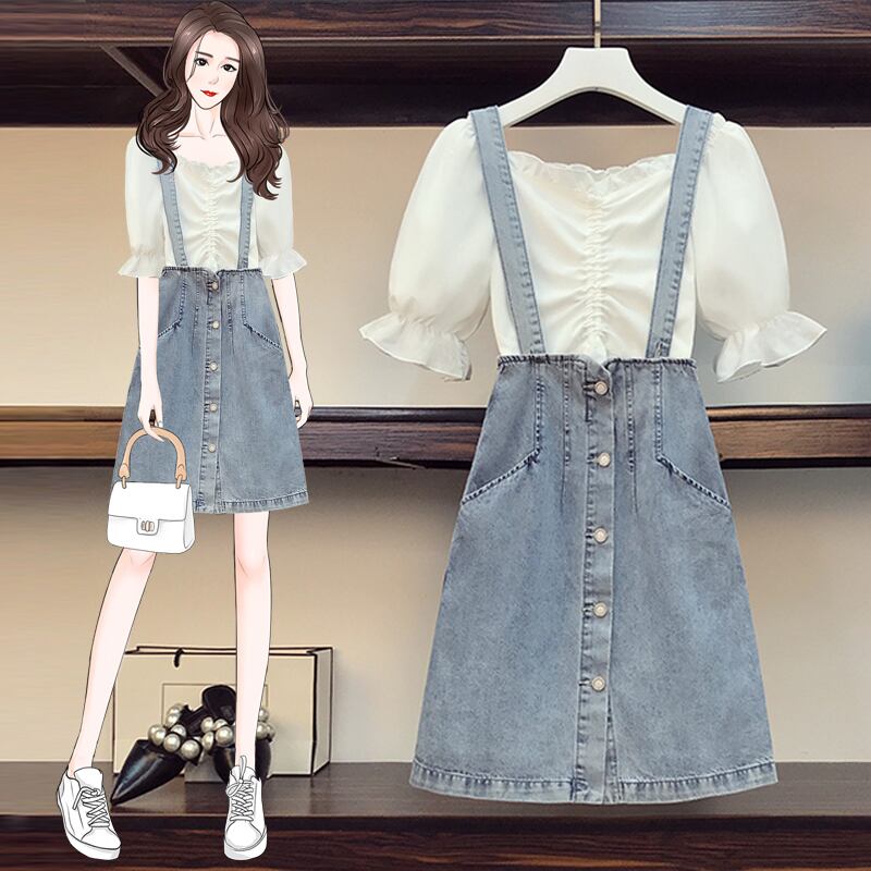 大きいサイズの婦人服 2023 トレンディな女性の夏の新しいファット シスター ファッション オールマッチ シャツ eign スタイル デニム サスペンダー スカート 2 点セット 大きめサイズ サマー 夏物 8884199480312161