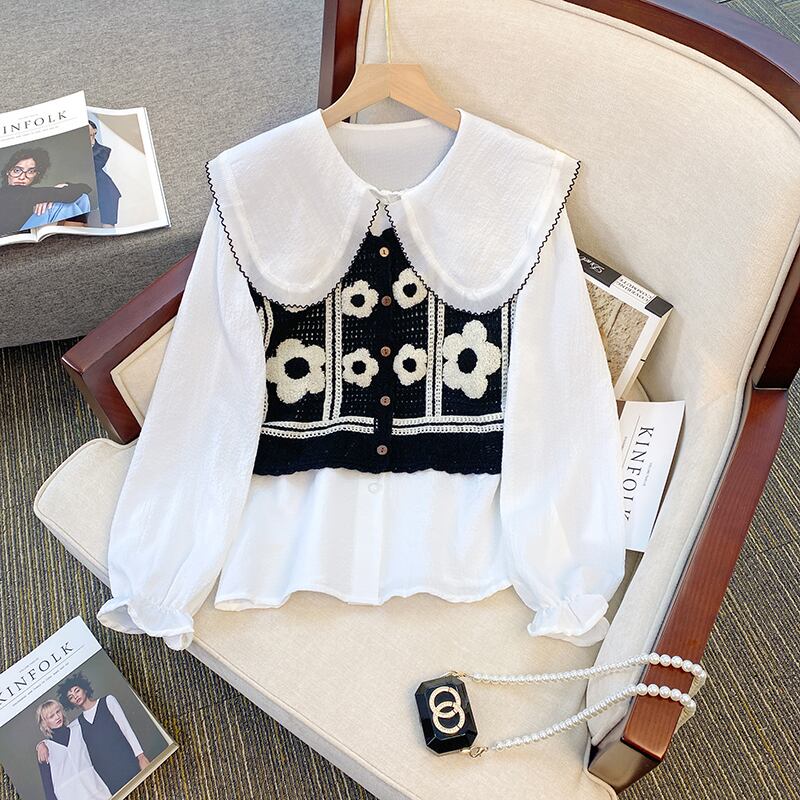 プラスサイズの婦人服 2023 春服脂肪姉妹新しいファッション人形の襟シャツ中空フック花ベスト 2 点セット 大きめサイズ スプリング 春物 フラワーデザイン 8884159386573333