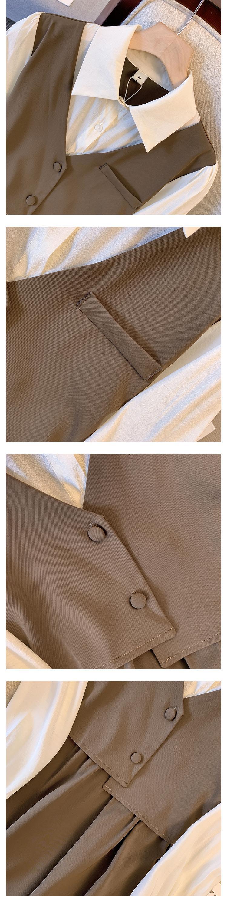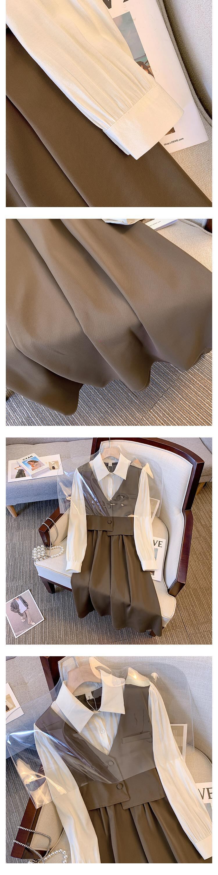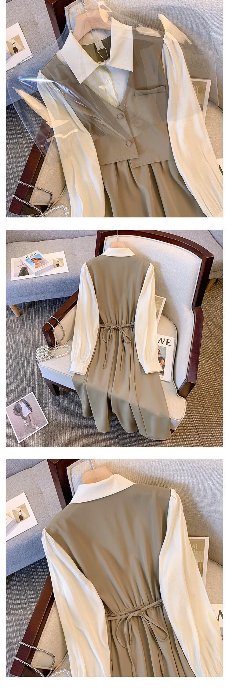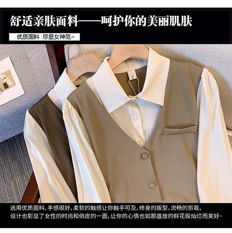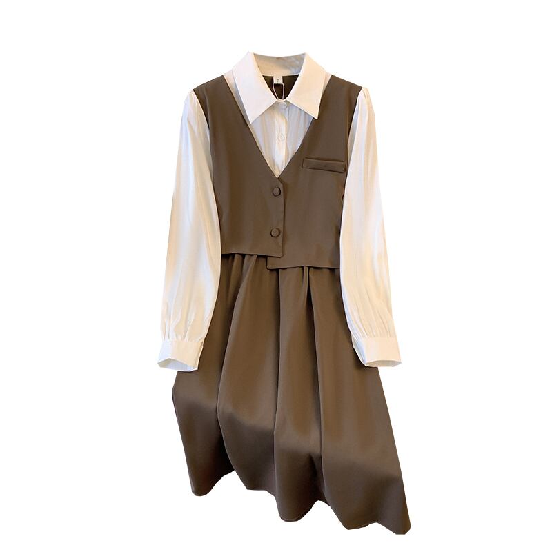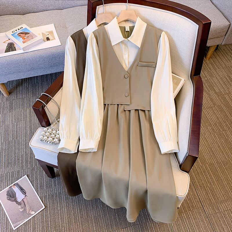 プラスサイズの婦人服 2023 春の新しいファットシスターオールマッチ痩身フェイクツーピースステッチウエスト痩身ドレス 大きめサイズ スプリング 春物 8884132603195876