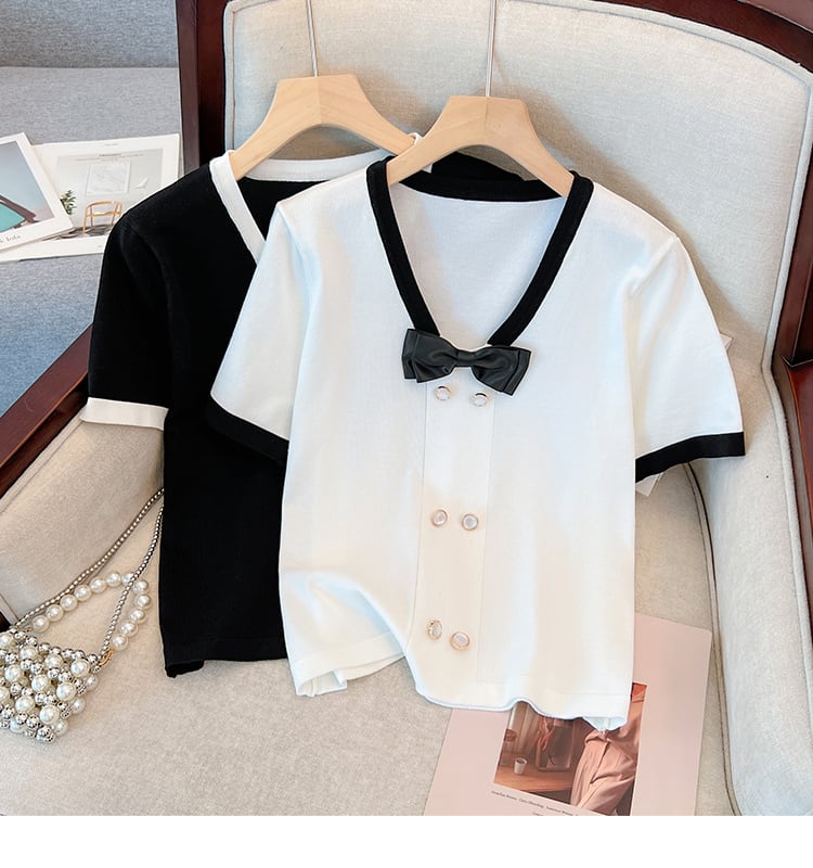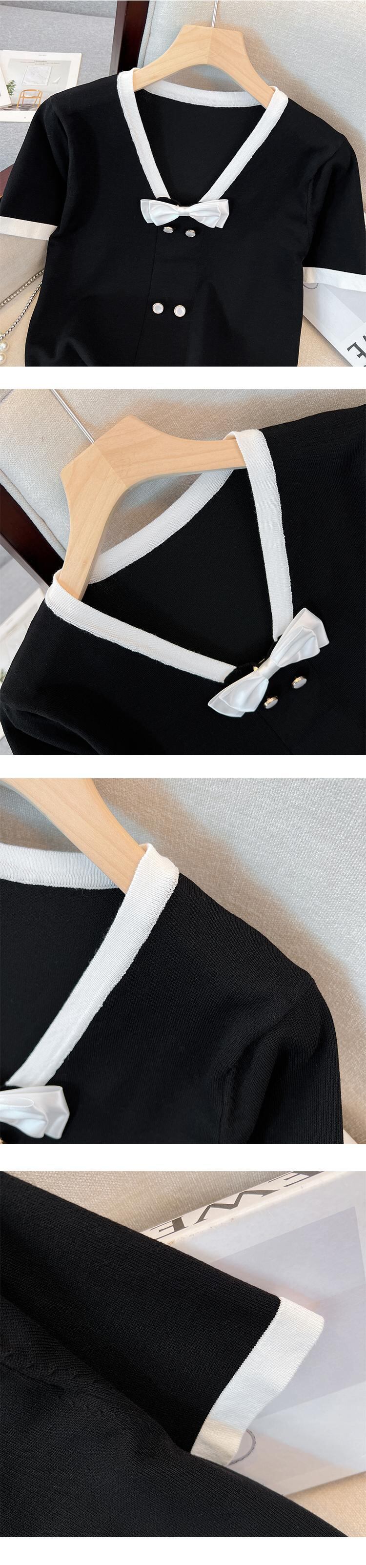 大きいサイズの婦人服 2023 夏の新しい太った姉妹の年齢を減らす年齢に合わせた色合わせの蝶ネクタイ eign スタイルカバー腹 V ネック ファッション T シャツ リボン 大きめサイズ サマー 夏物 Vネック Tシャツ 8884163030835445