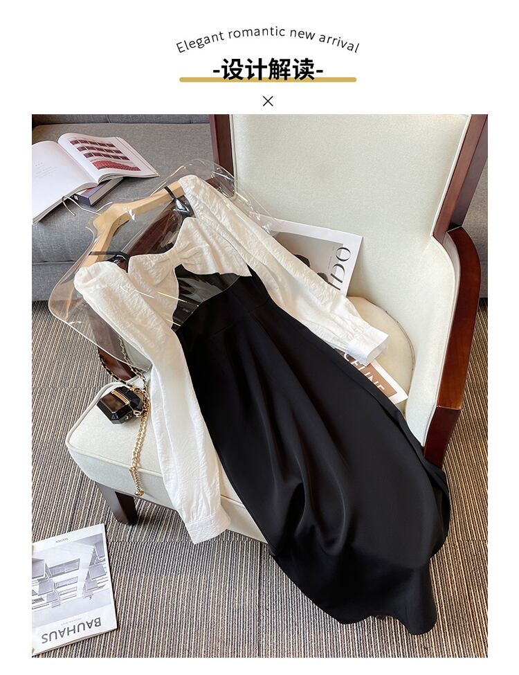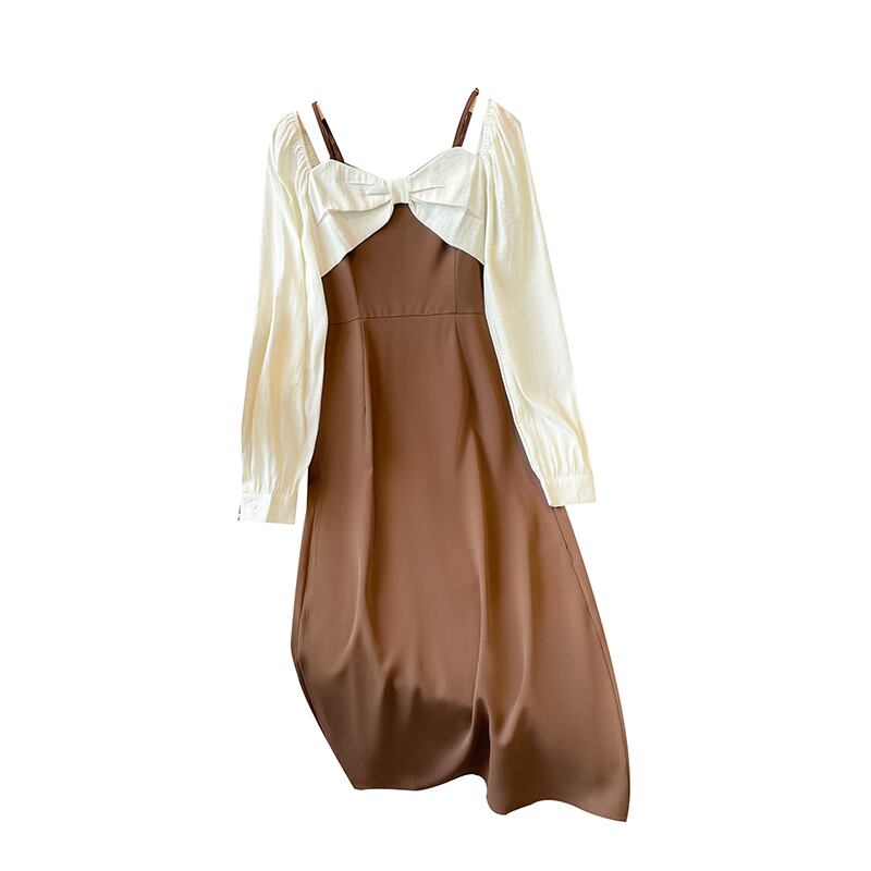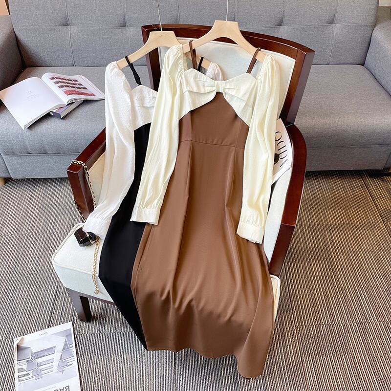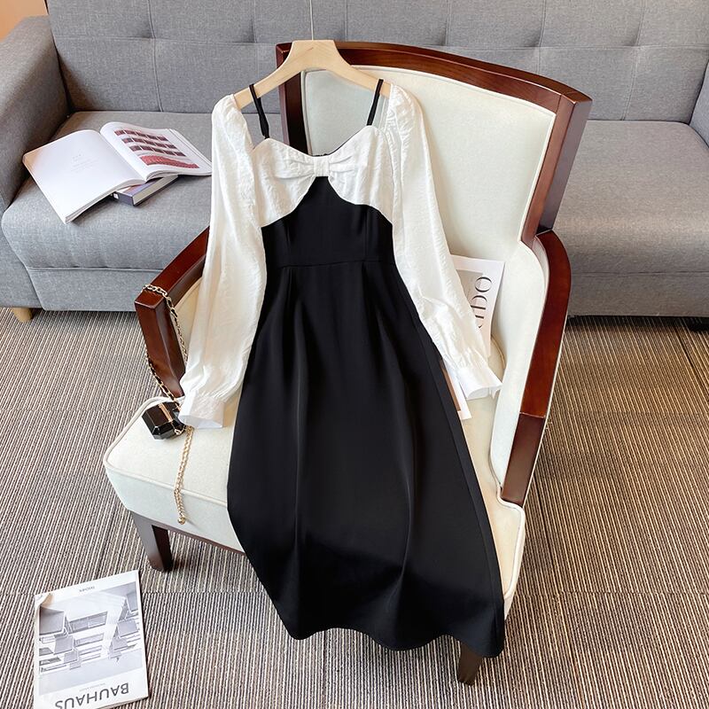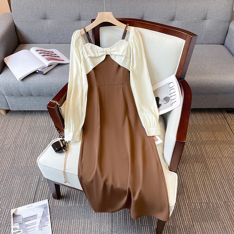 プラスサイズの婦人服 2023 脂肪姉妹春の新しいフレンチ痩身フェイクツーピースオフショルダーちょう結び長袖ドレス ロング リボン 大きめサイズ スプリング 春物 8884127274029007