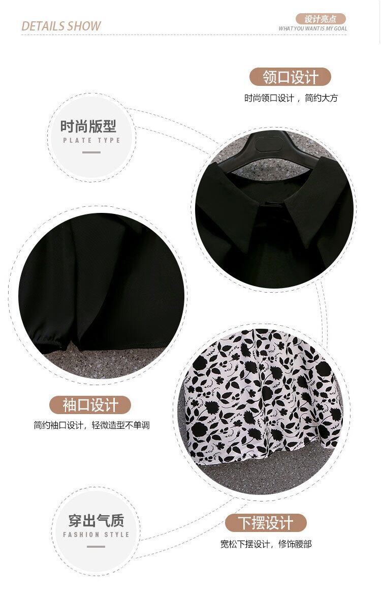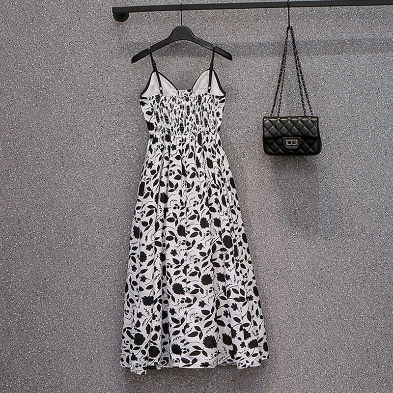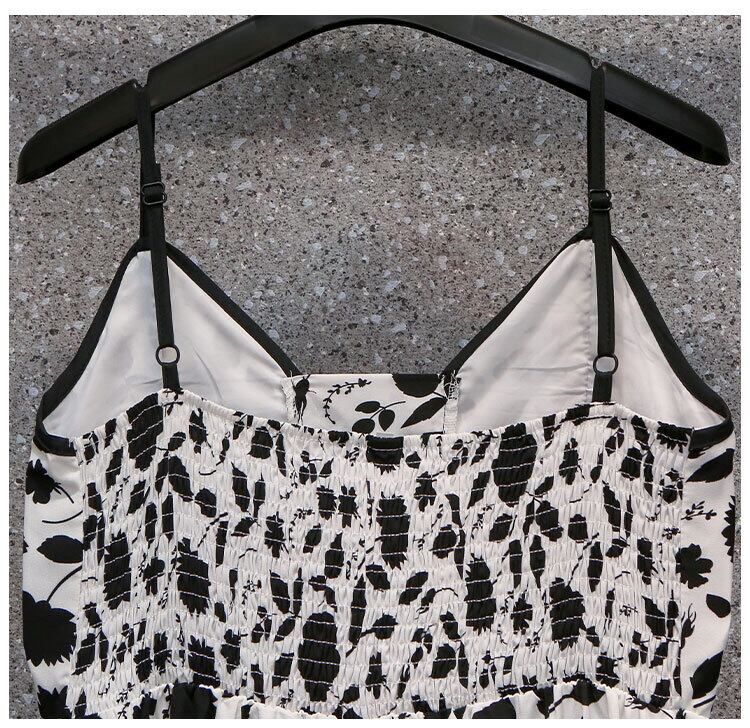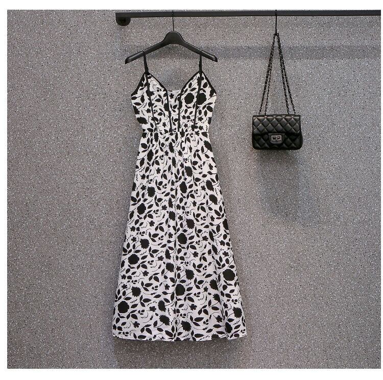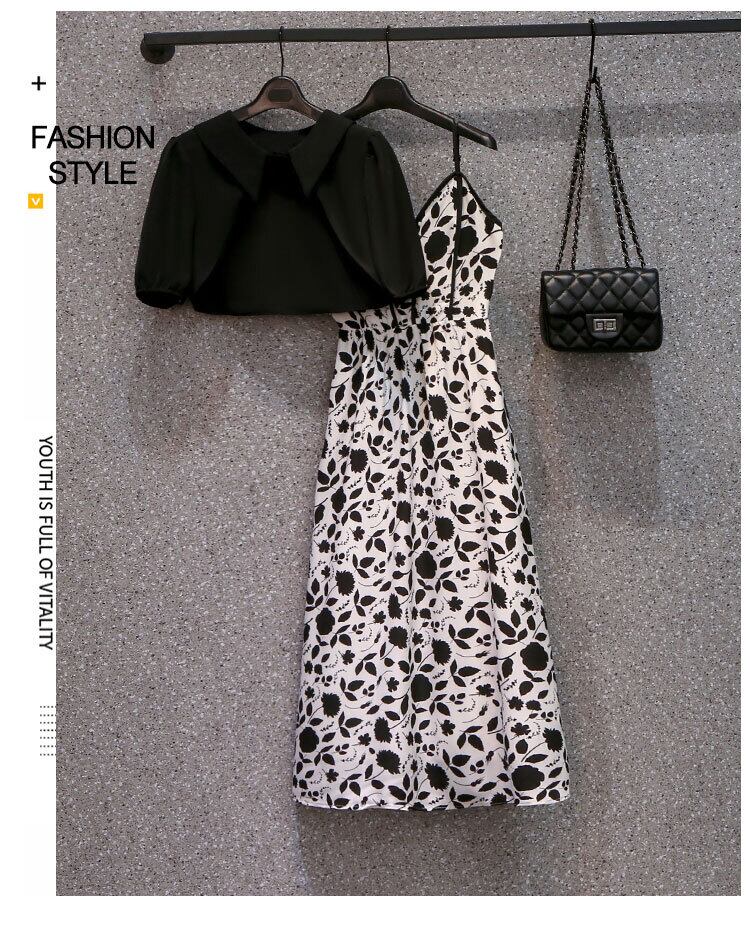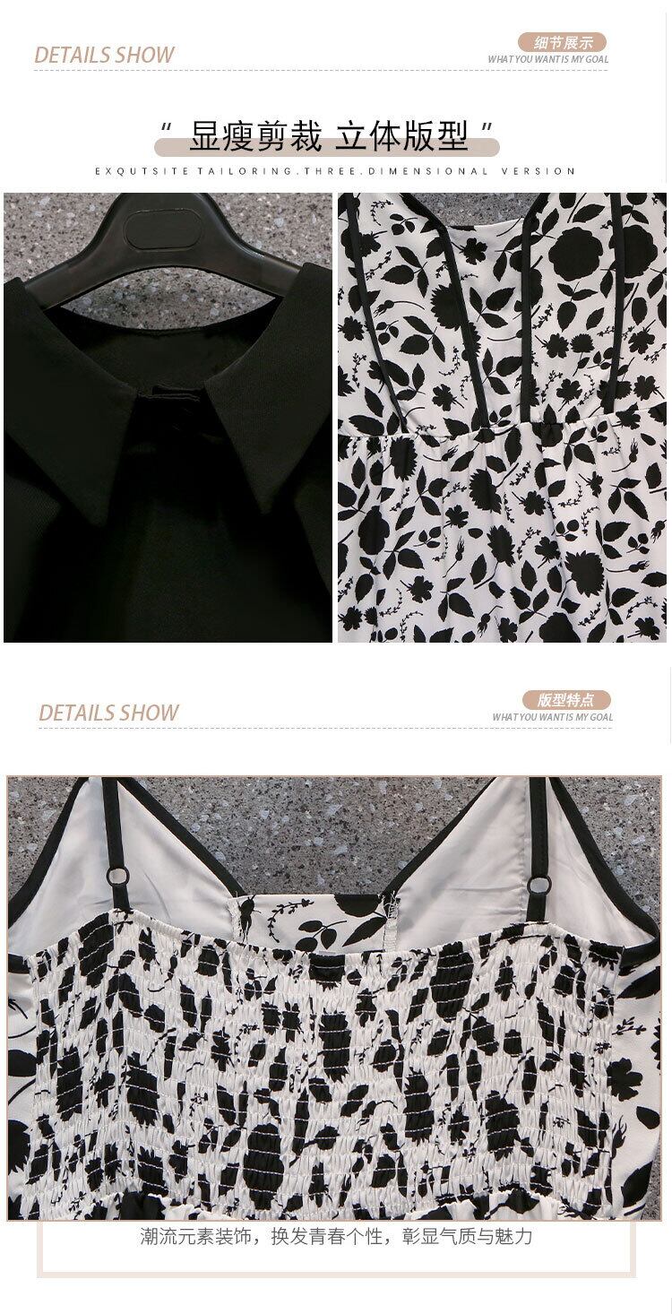 プラスサイズの婦人服 2023 ファットシスター夏新ニッチサスペンダー花柄ドレス黒ブラウス 2 点セット ブラック 大きめサイズ サマー 夏物 8884120144285696