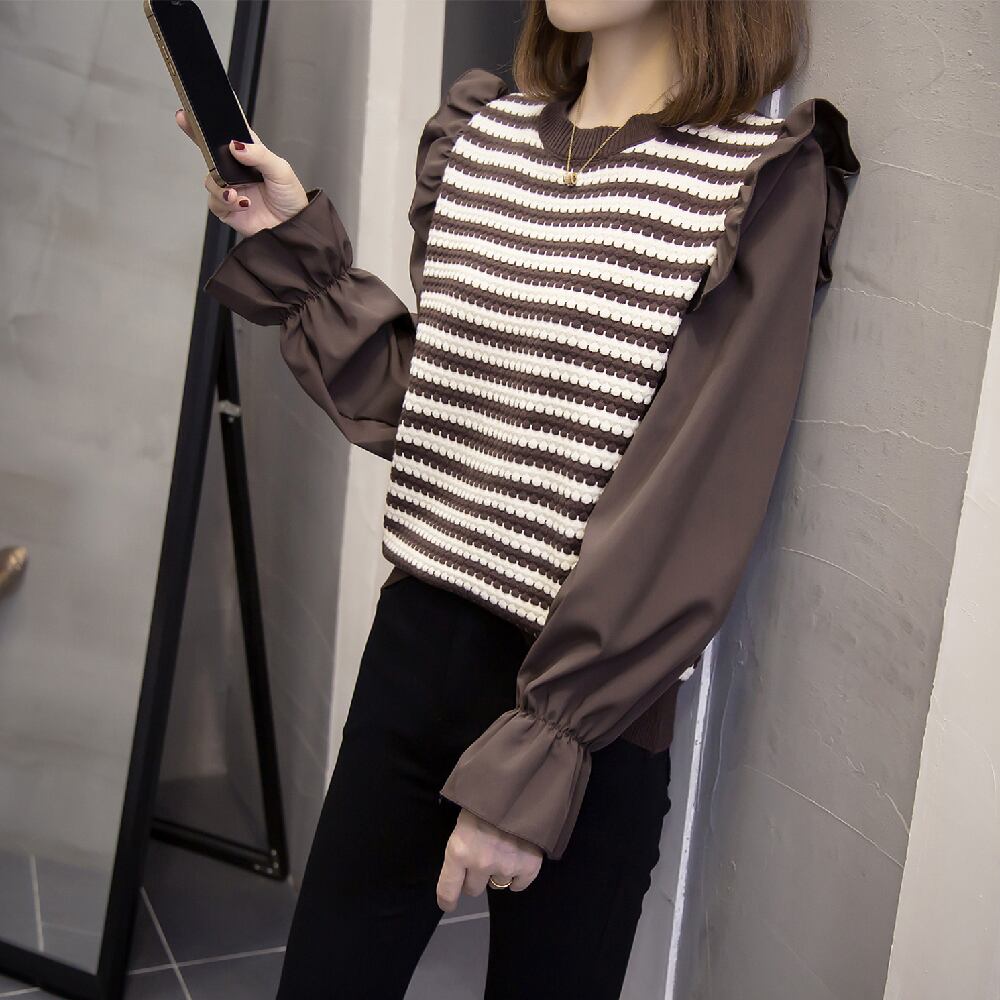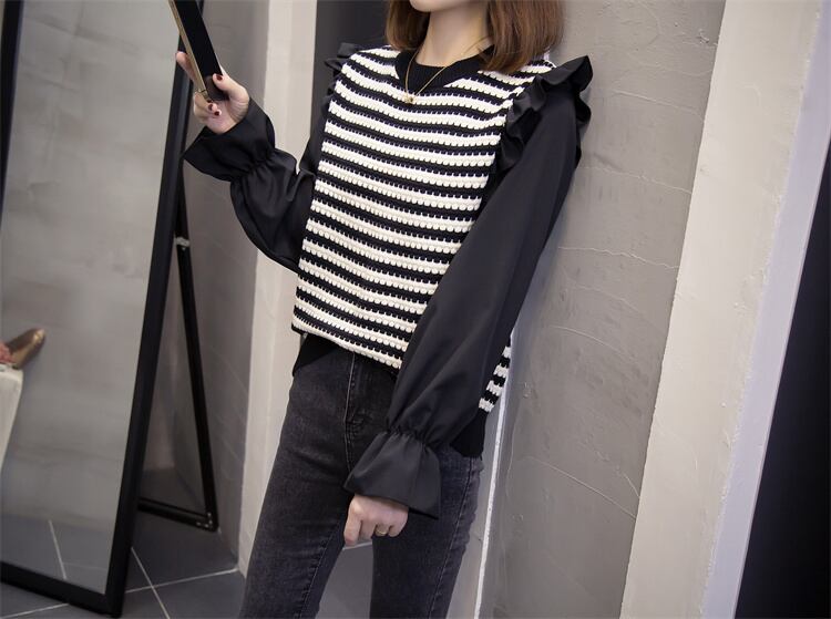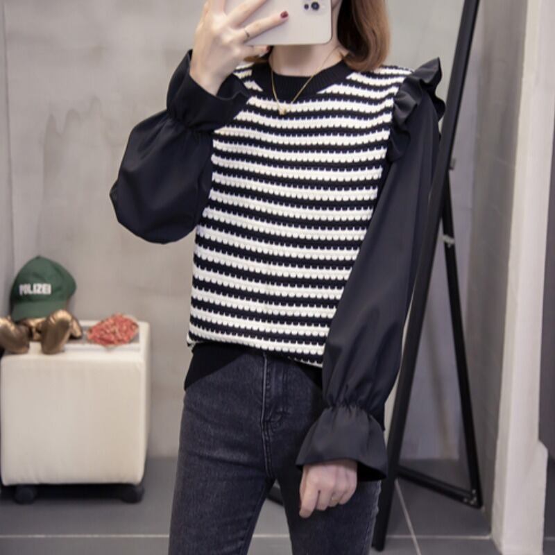 大きいサイズの婦人服 2023 春の新しいスタイルの太った姉妹のカジュアルなファッションの縞模様のデザインのスプライシング偽のツーピースのニットのセーター 大きめサイズ スプリング 春物 ストライプ 888413946853382