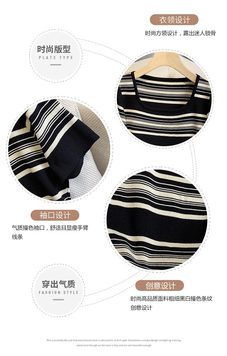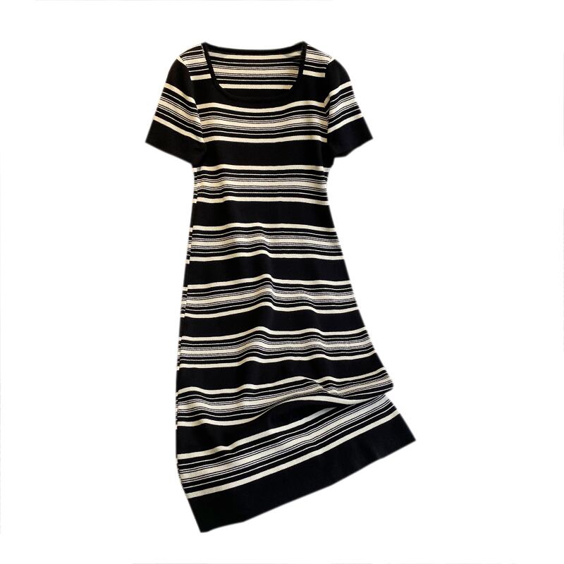 プラスサイズの婦人服2023ファットシスター夏の新しいシンプルなスクエアカラールーズミッドレングスストライプニットドレス 大きめサイズ サマー 夏物 スクウェア 8884137116813080