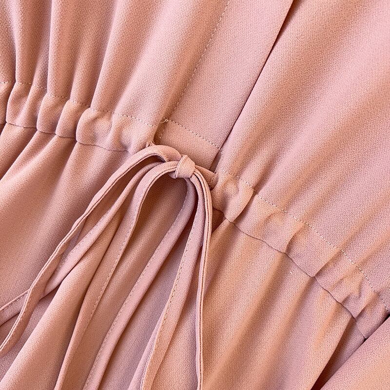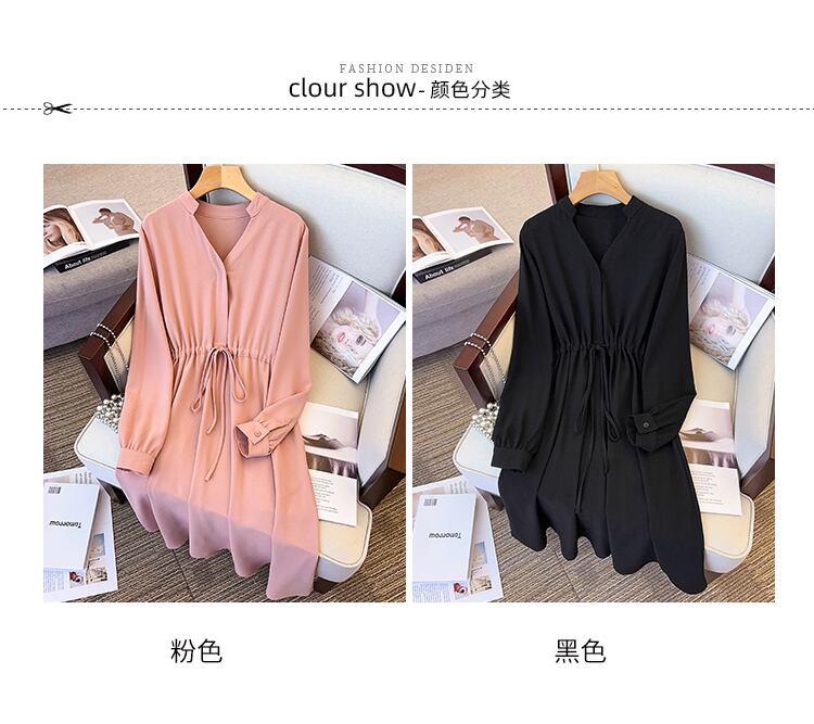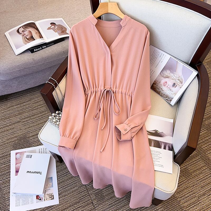 プラスサイズの婦人服 2023 春服脂肪姉妹新しいファッション無地 V ネックウエストミッドレングス長袖ドレス ロング 大きめサイズ スプリング 春物 Vネック ソリッドカラー 8884170325952817