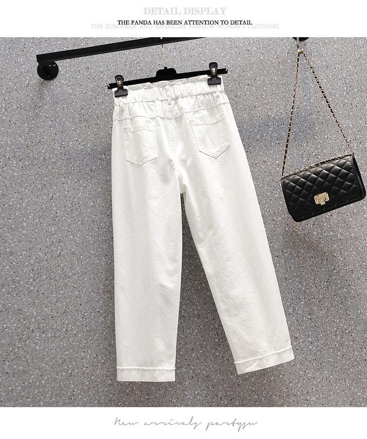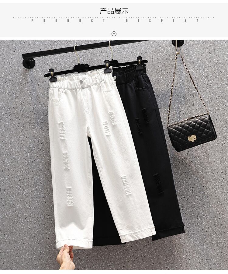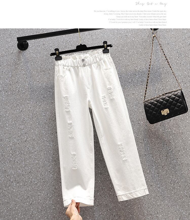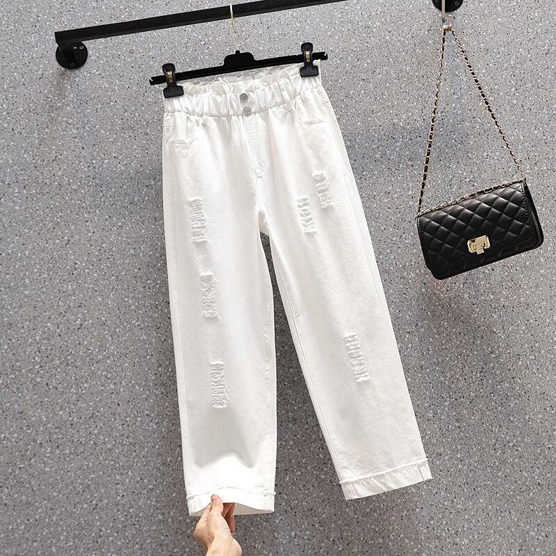 プラスサイズの婦人服 2023 夏の新しいファットシスターデザインセンスホールカジュアルバージョンの弾性ウエストジーンズ女性 エラスティック 伸縮 大きめサイズ サマー 夏物 8884145447305106