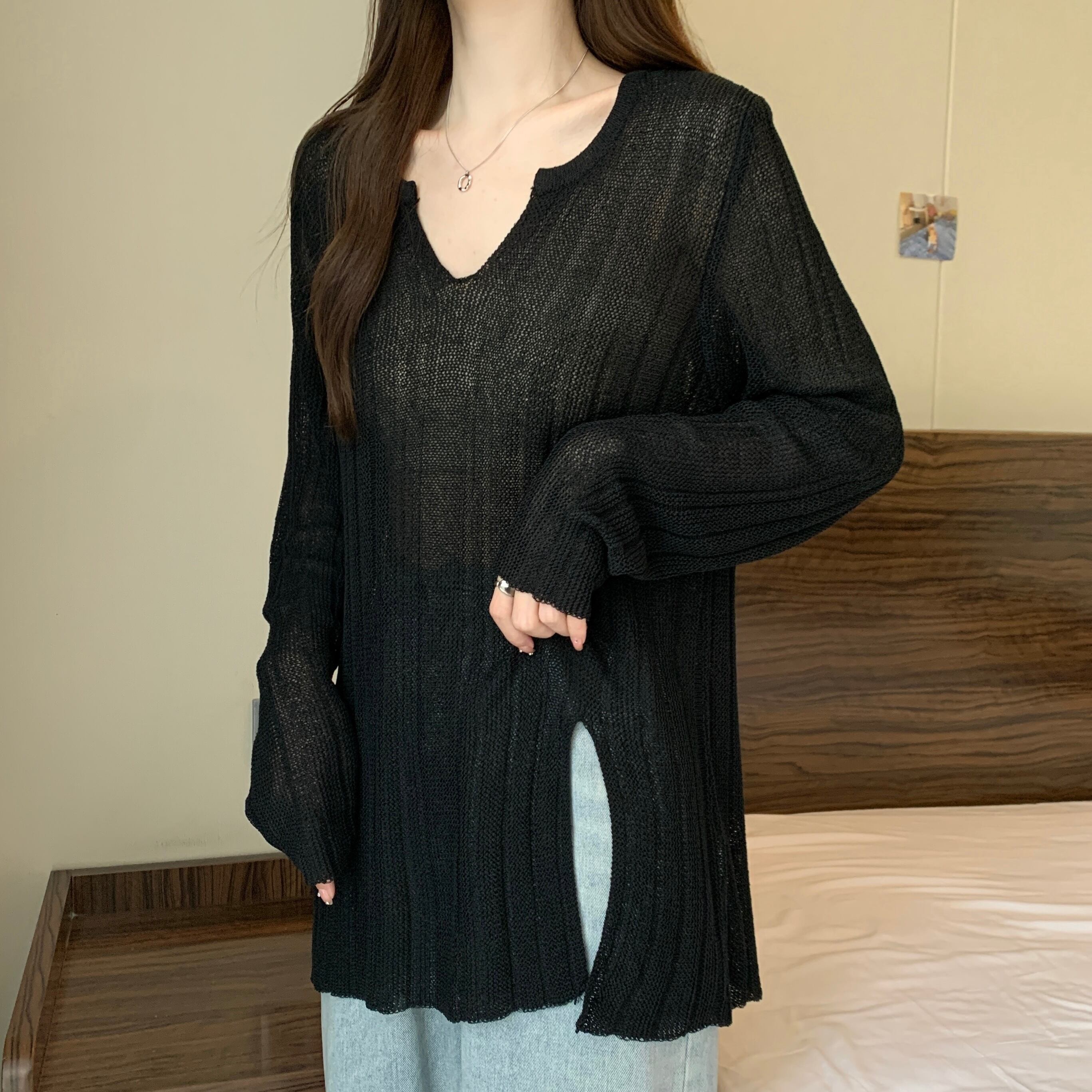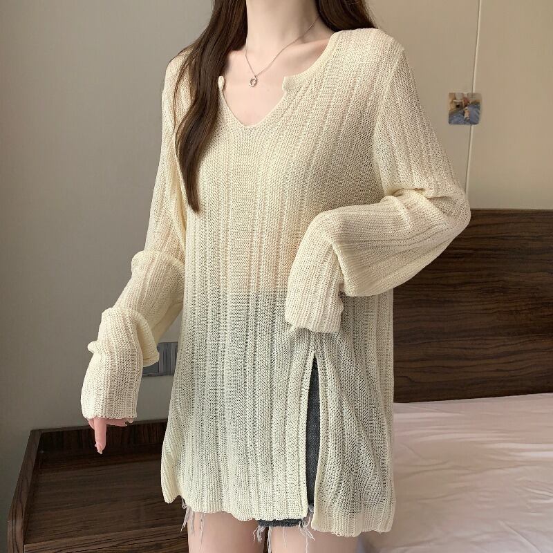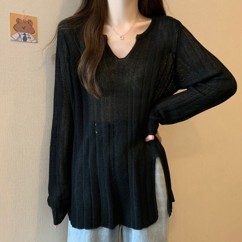プラスサイズの婦人服 2023 トレンディな女性の春の新しいファットシスターファッションスリット中空ブラウスとニットセータートップ女性 大きめサイズ スプリング 春物 8884164065791865
